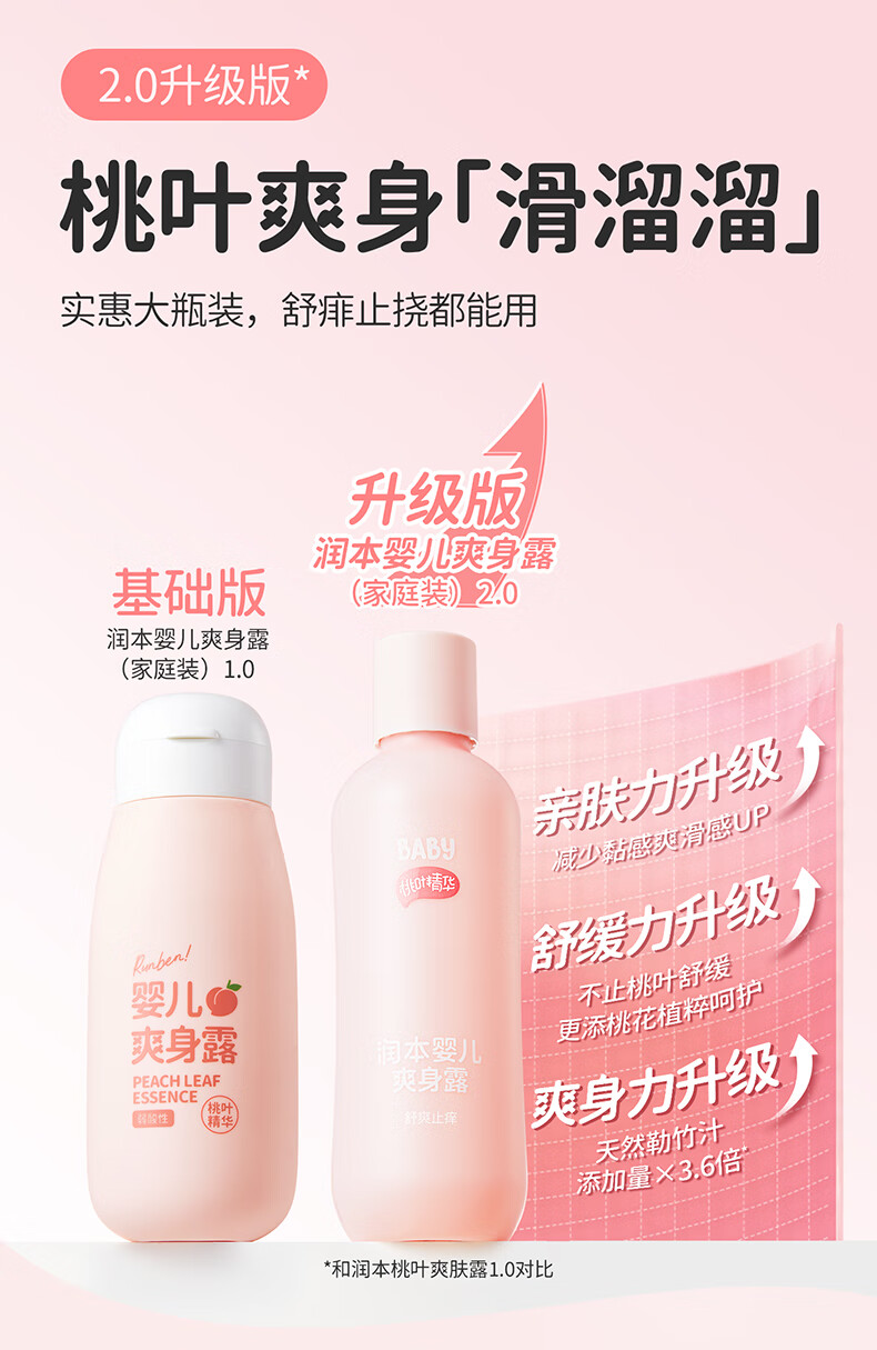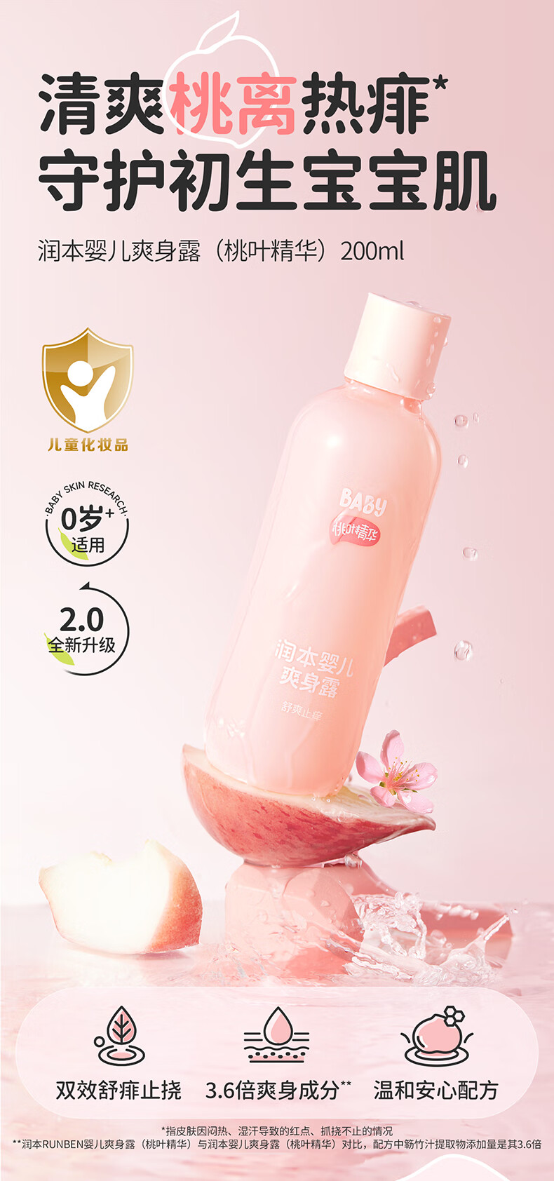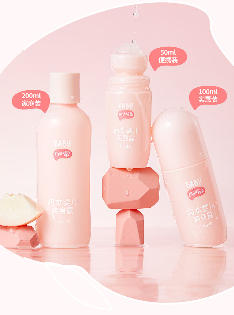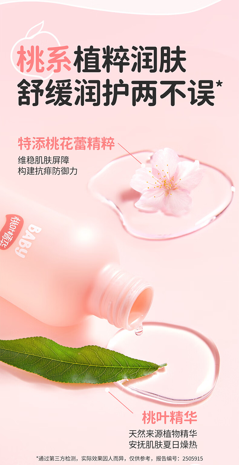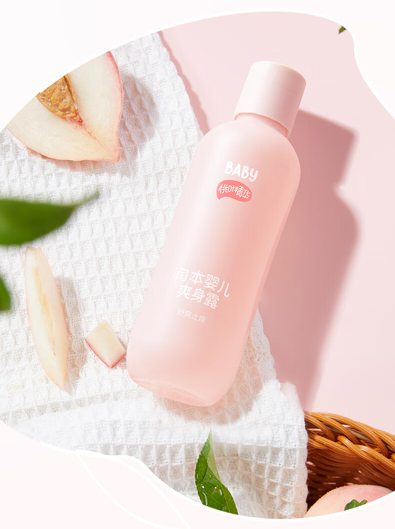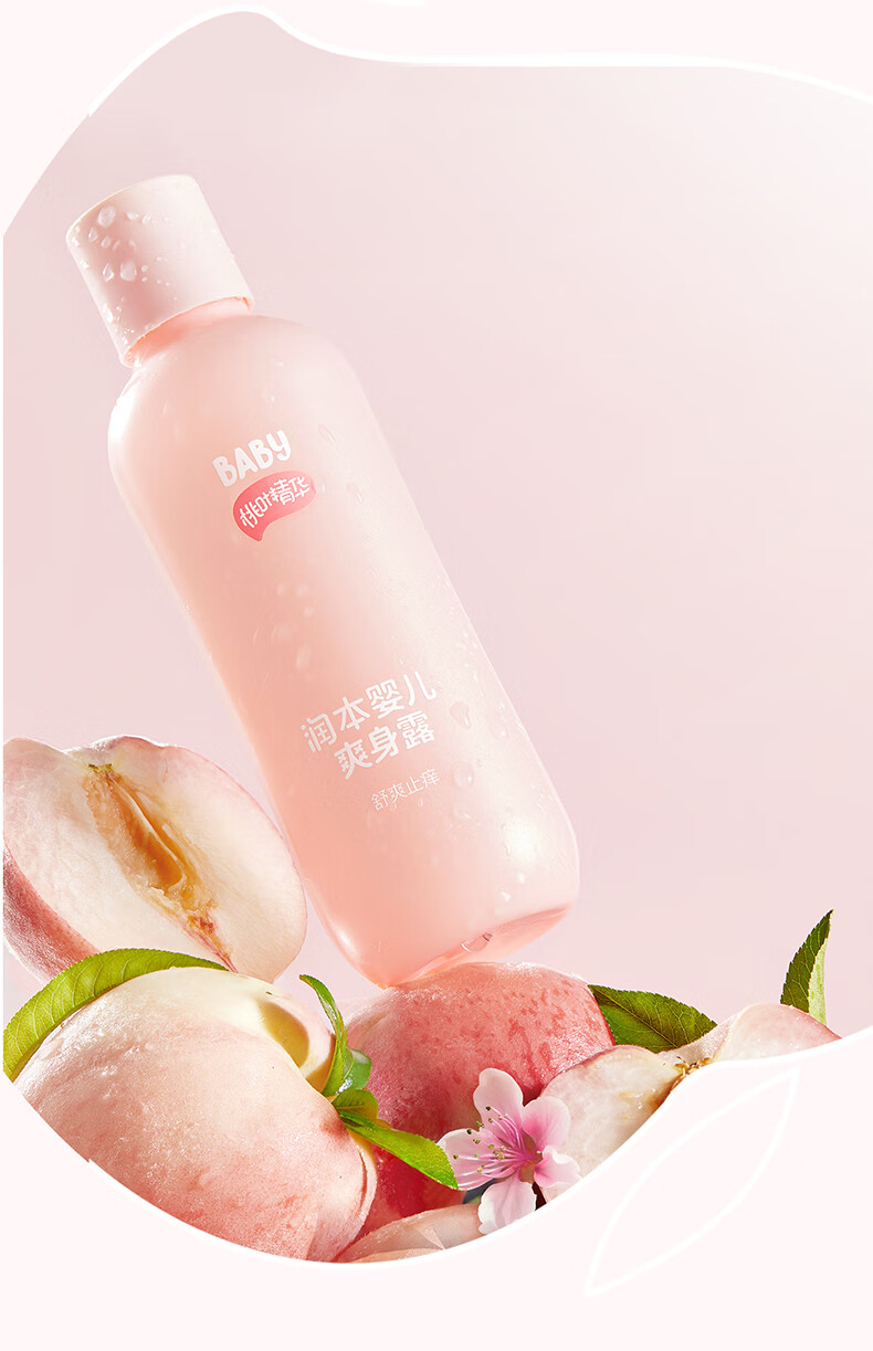 舒爽止挠,天然温和;特添双桃精粹,平衡呵护肌肤屏障;提升幼肌防御力;有效舒缓,持久爽身