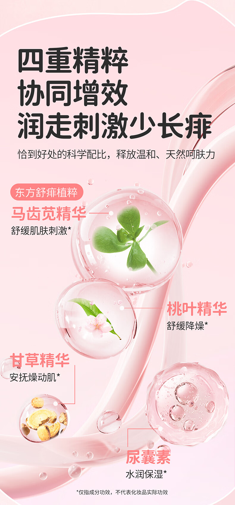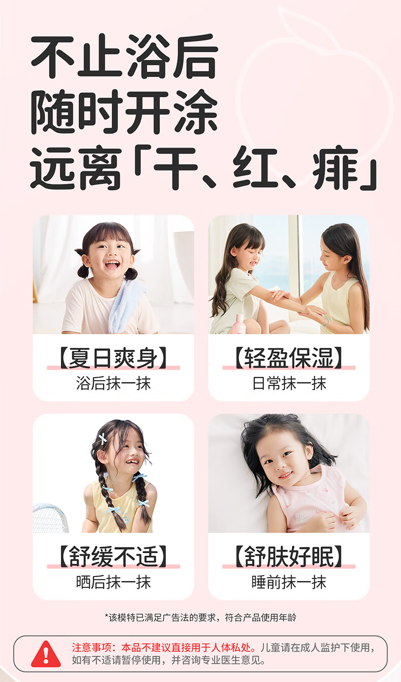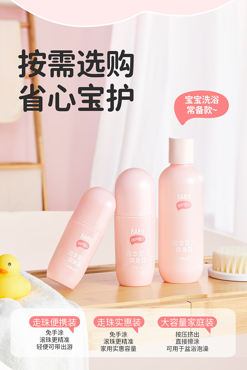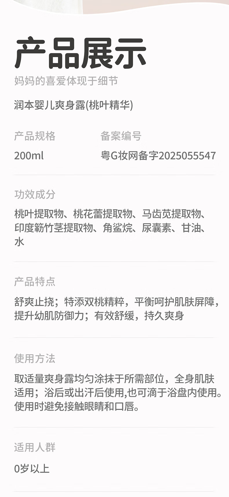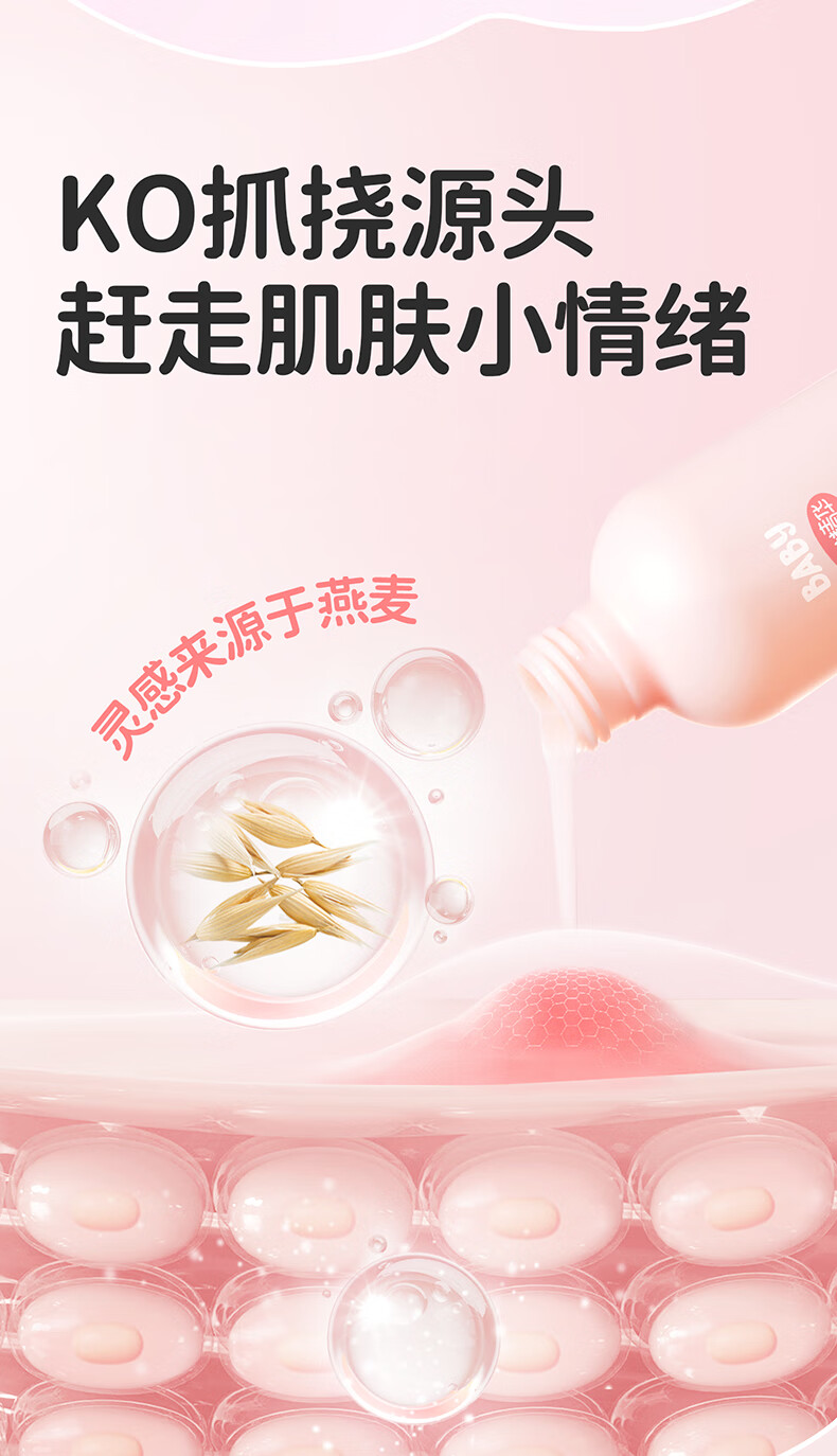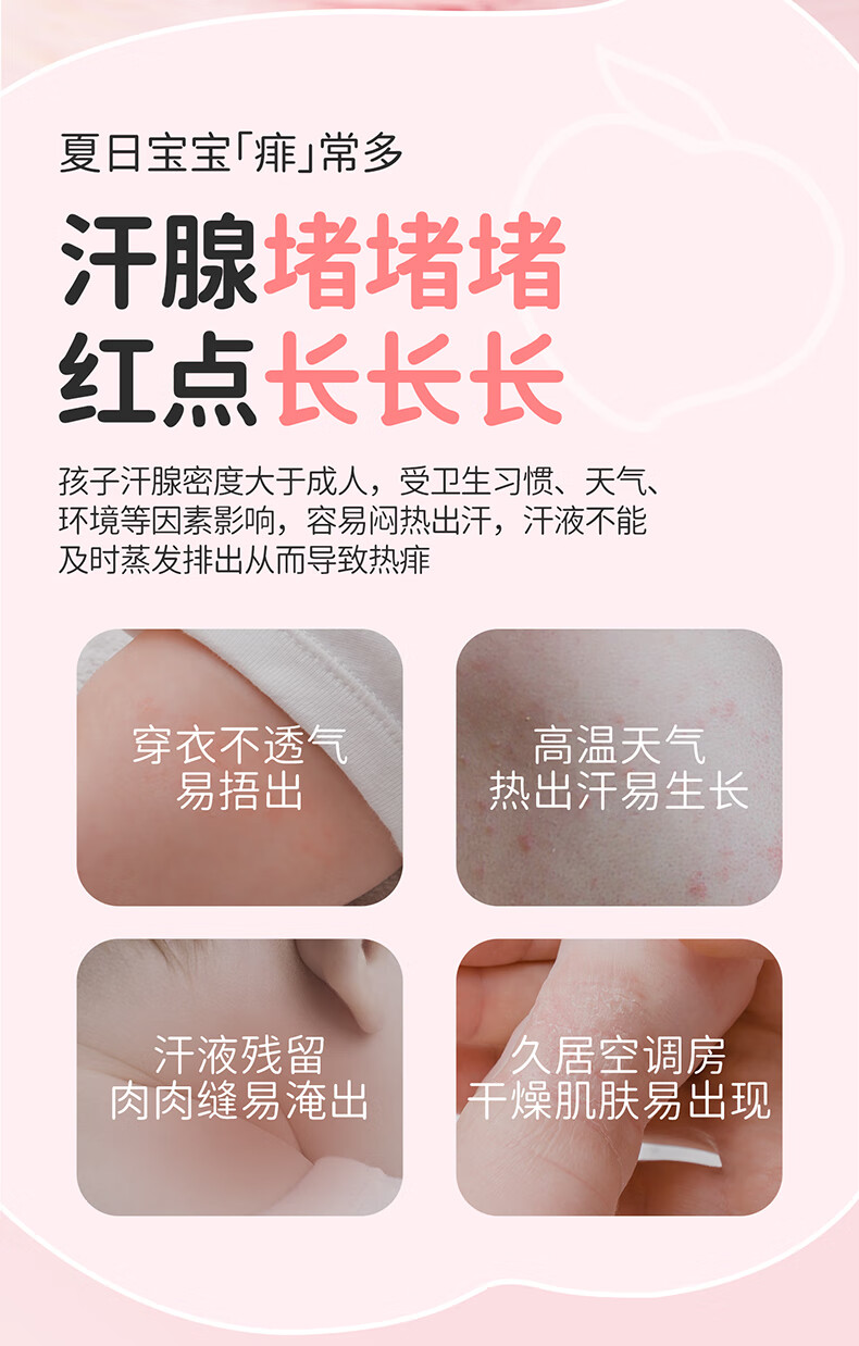 舒爽止挠,天然温和;特添双桃精粹,平衡呵护肌肤屏障;提升幼肌防御力;有效舒缓,持久爽身