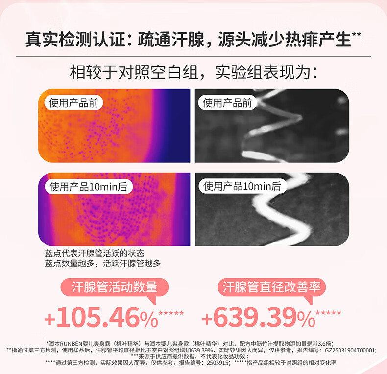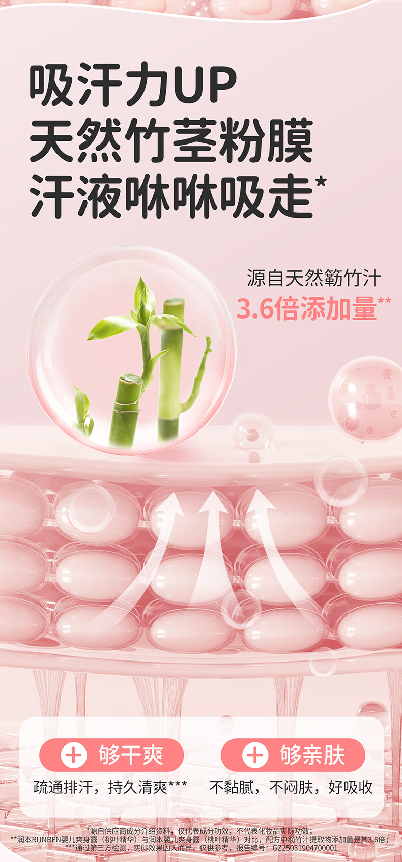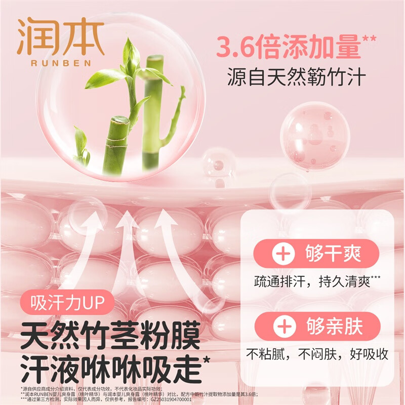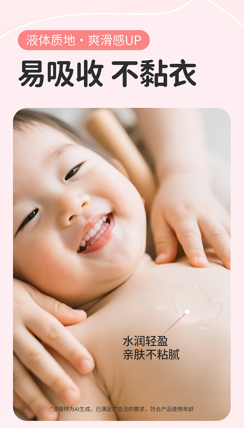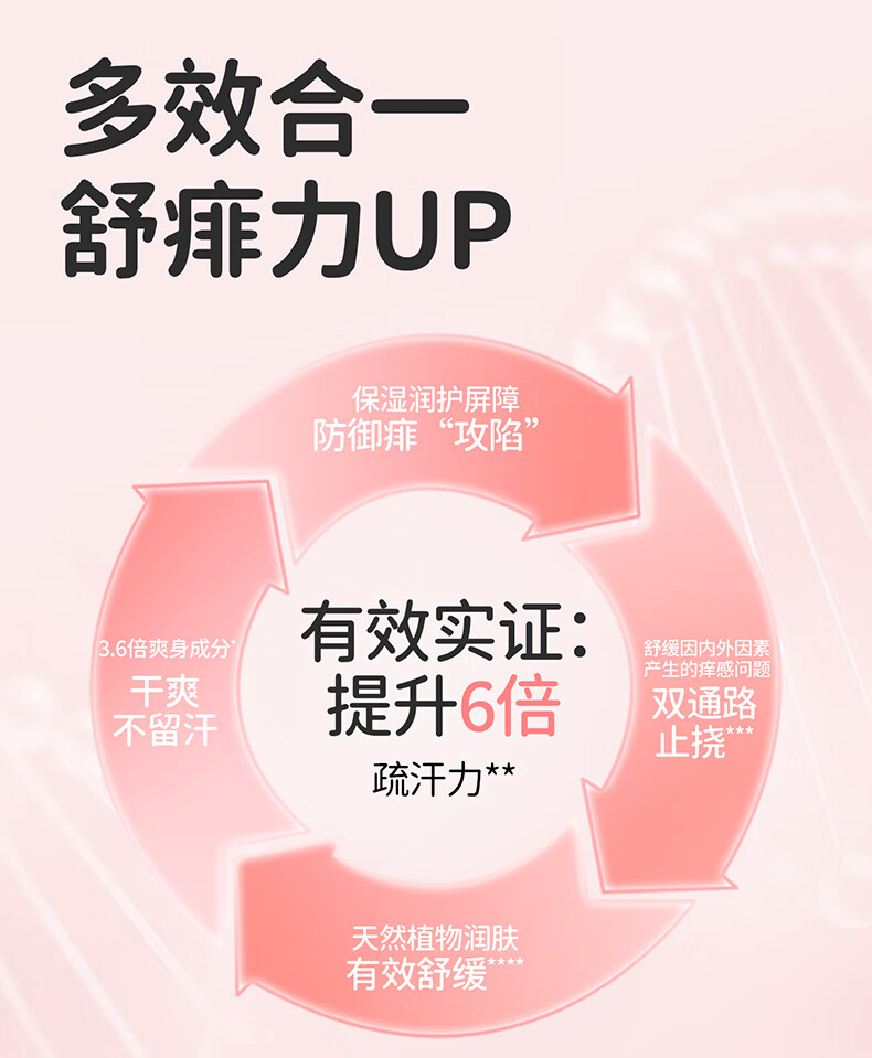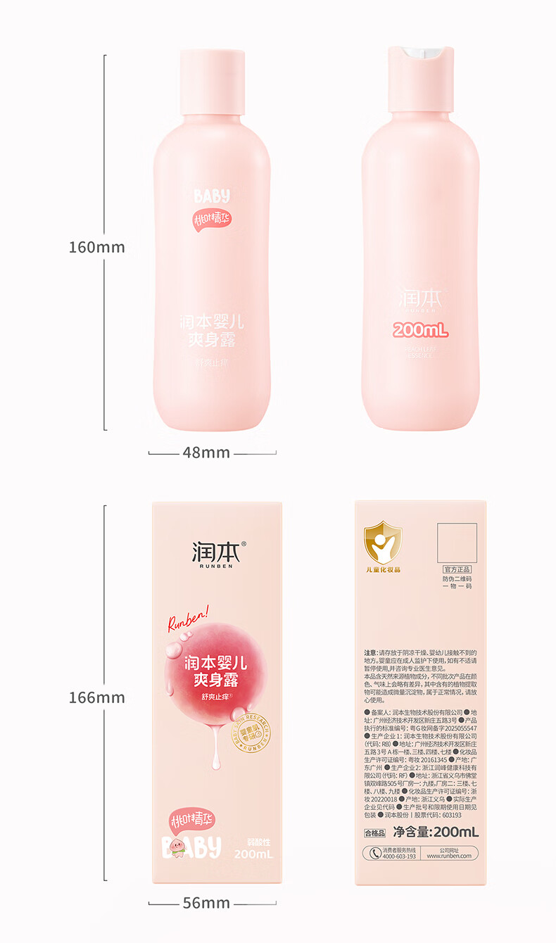 舒爽止挠,天然温和;特添双桃精粹,平衡呵护肌肤屏障;提升幼肌防御力;有效舒缓,持久爽身