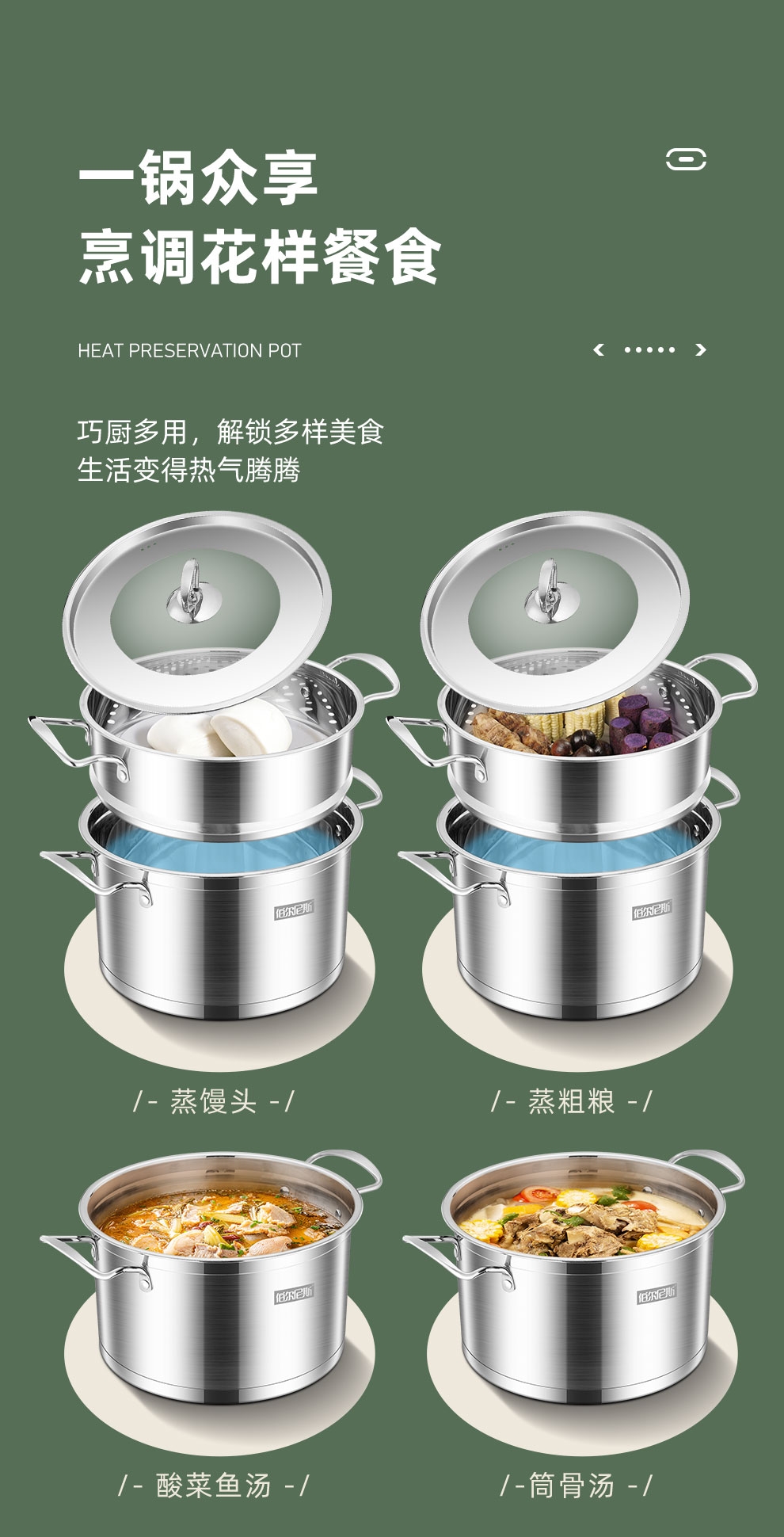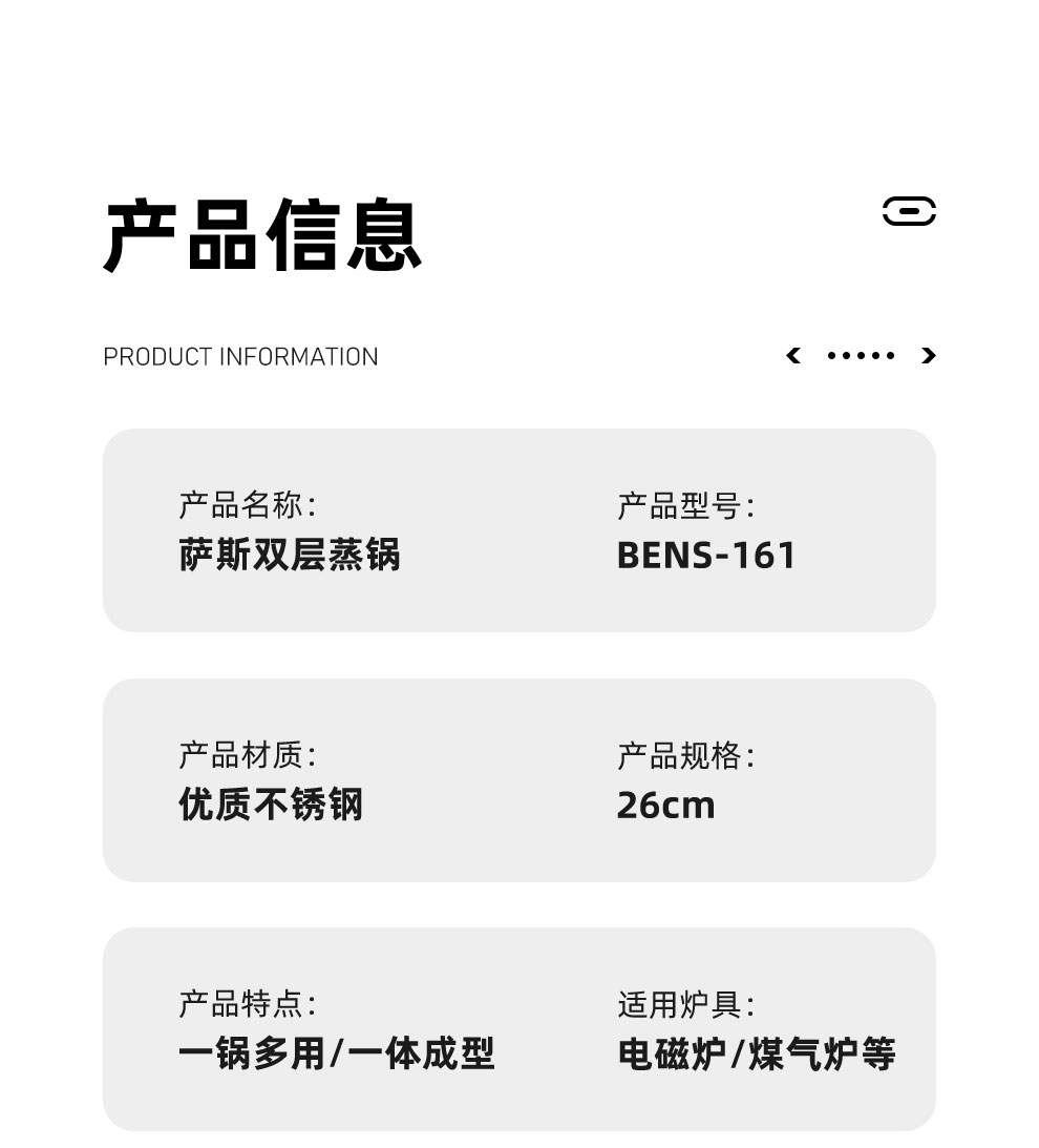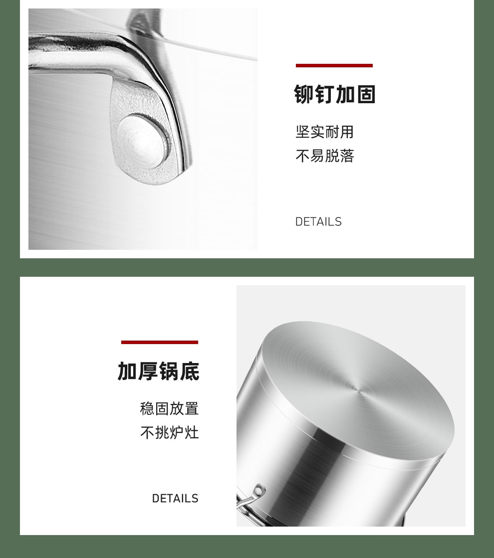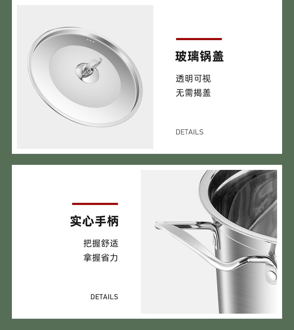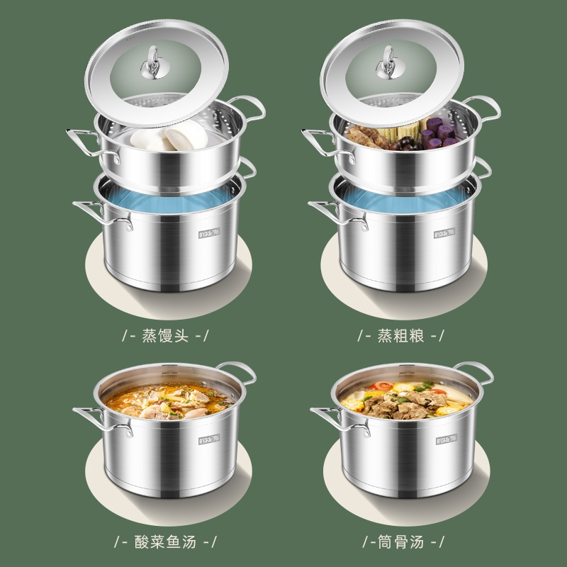 大容量底锅,配合不锈钢蒸格,随意搭配;一锅多用,功能更全,蒸、闷、炖、煮、涮样样在行;使用方便,适用于液化气、电磁炉等多种热源
