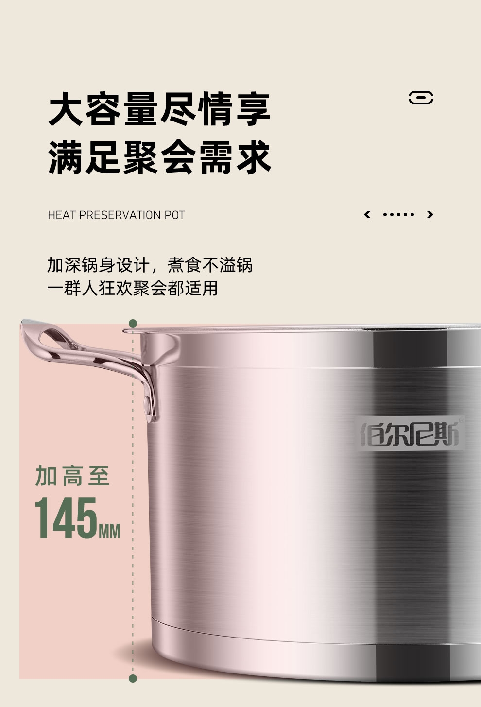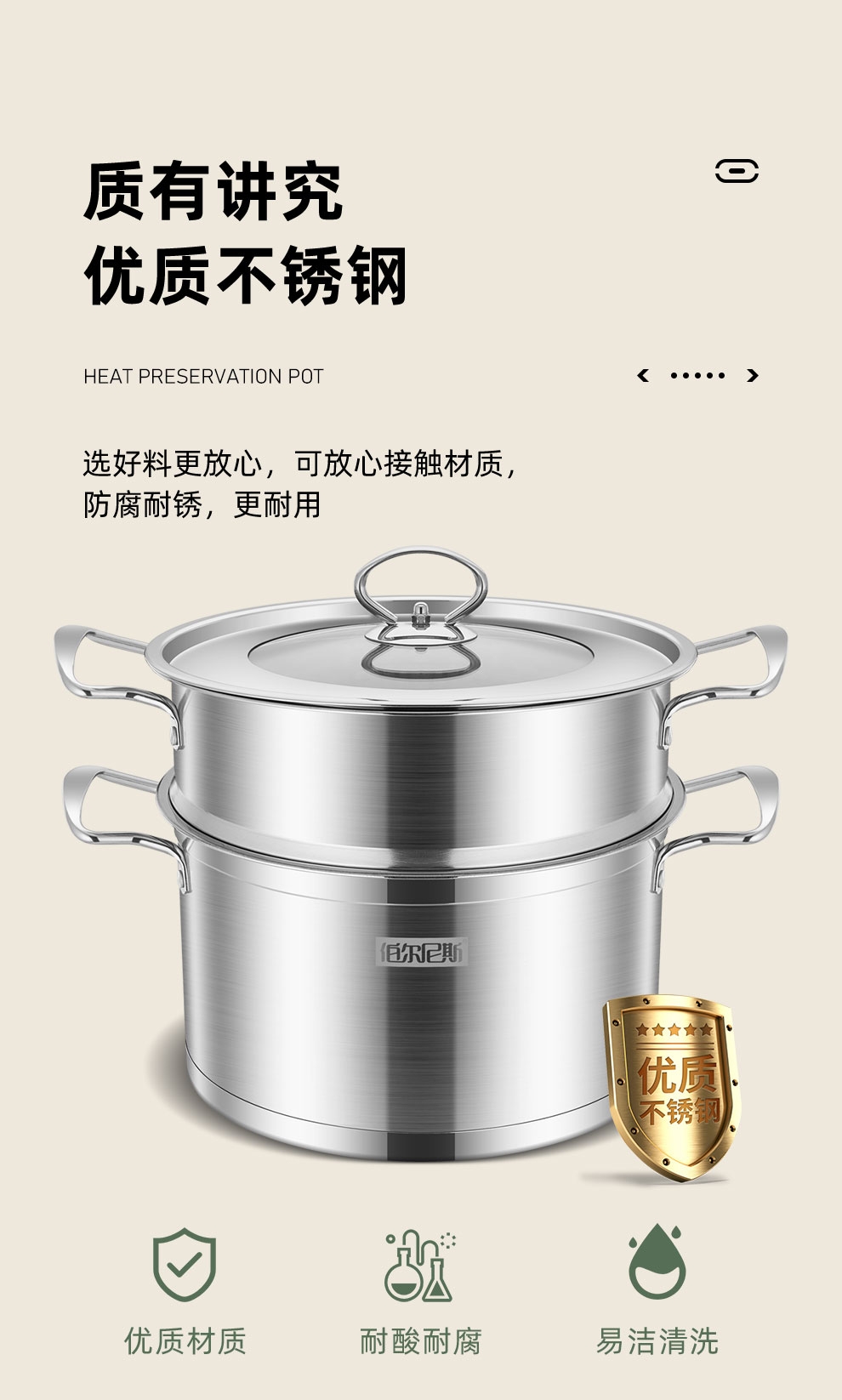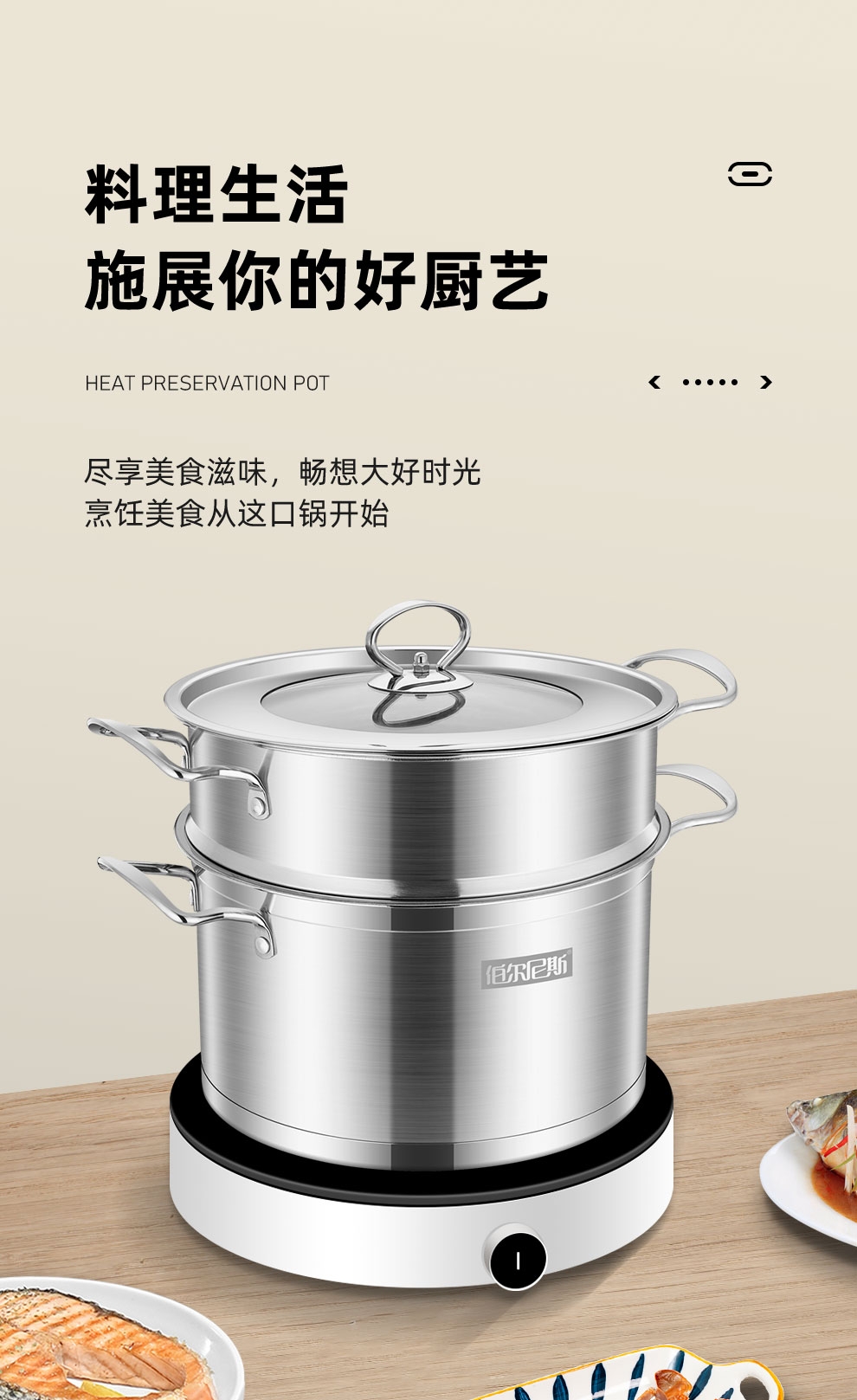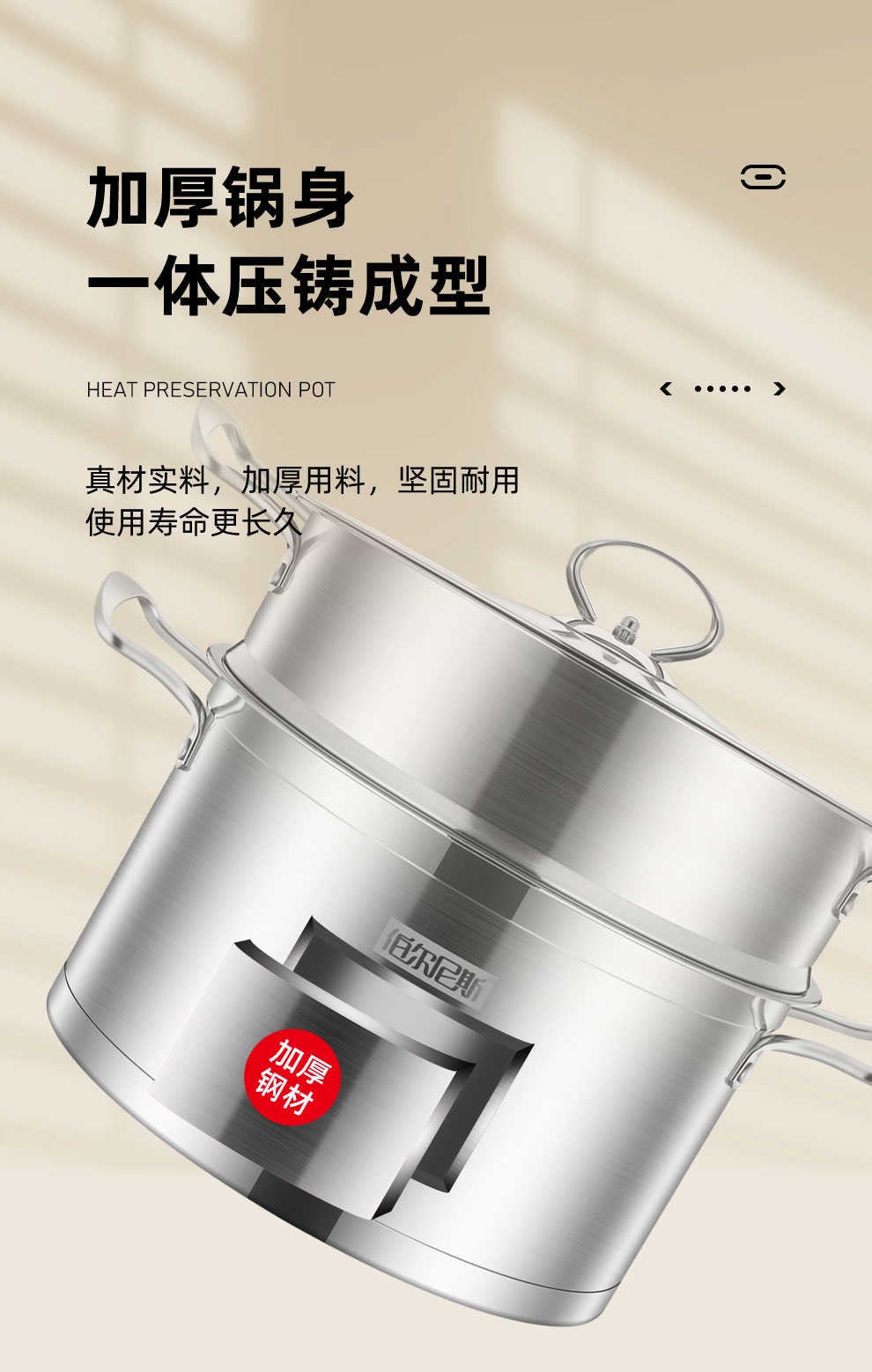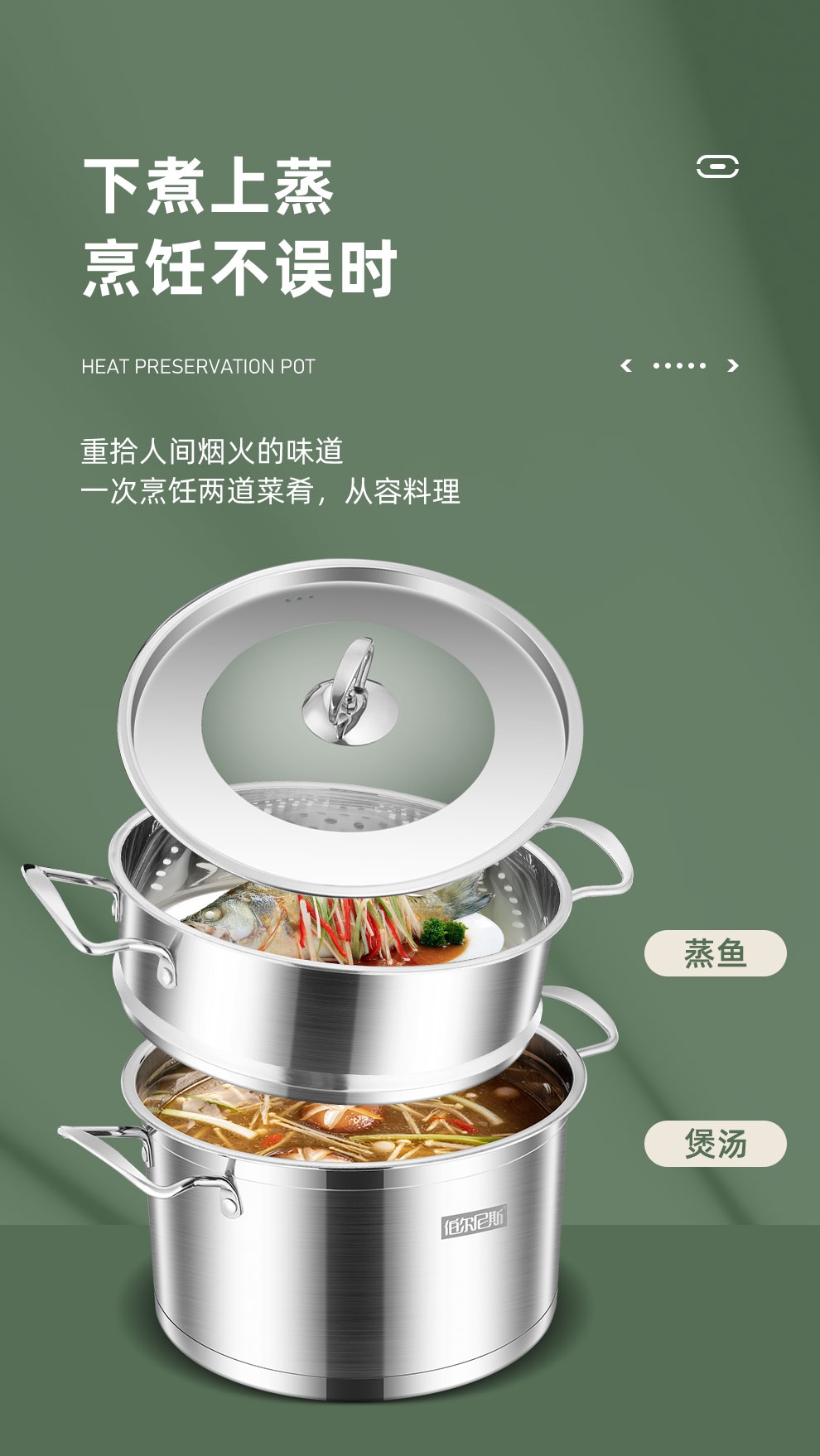 大容量底锅,配合不锈钢蒸格,随意搭配;一锅多用,功能更全,蒸、闷、炖、煮、涮样样在行;使用方便,适用于液化气、电磁炉等多种热源