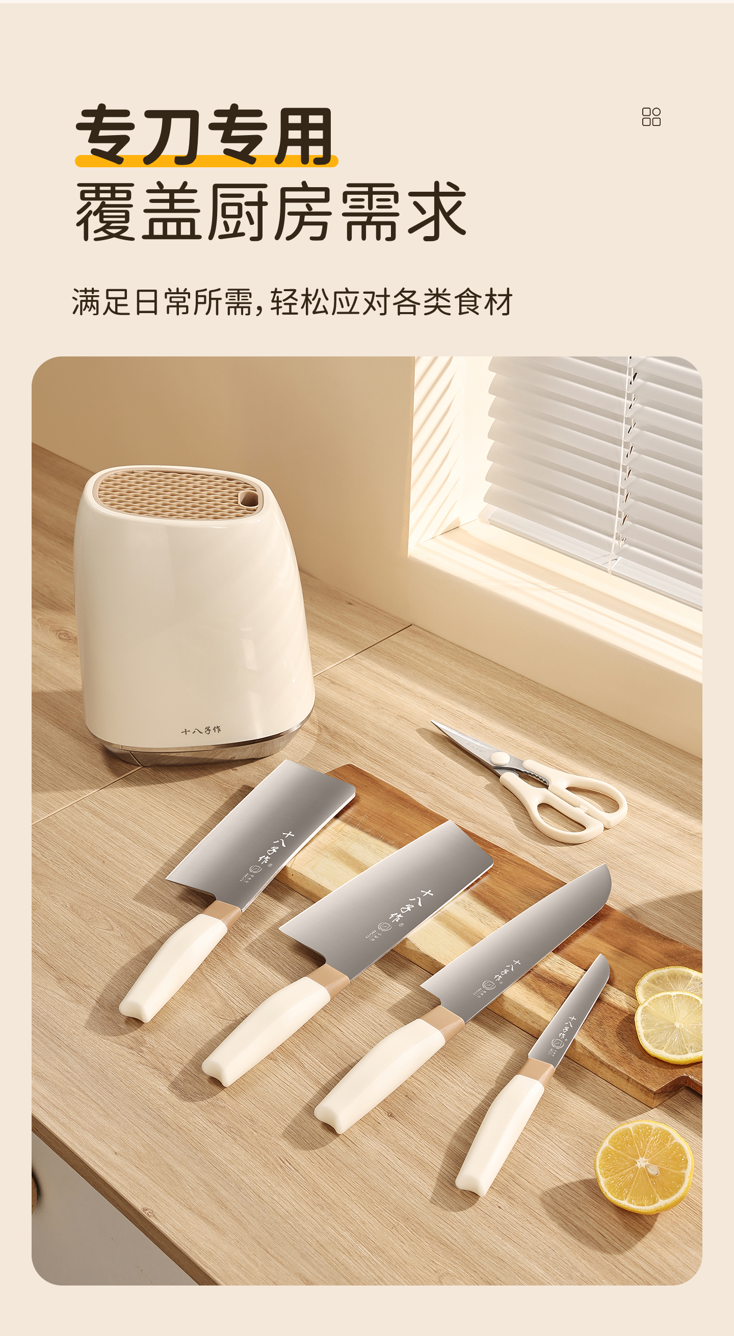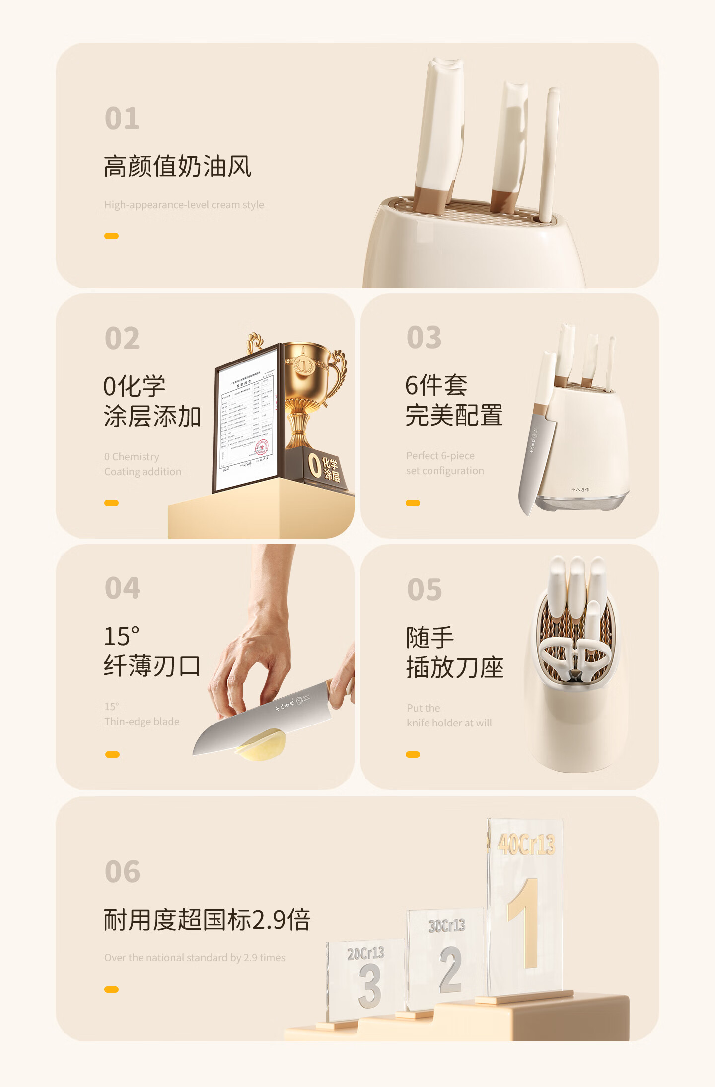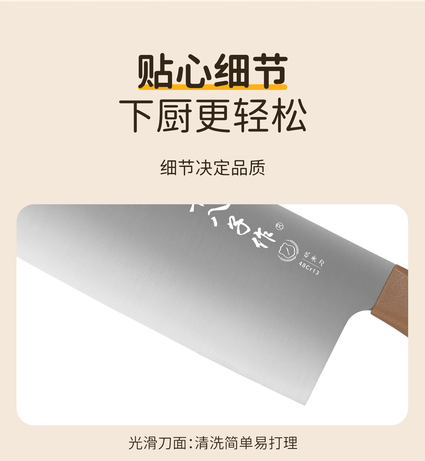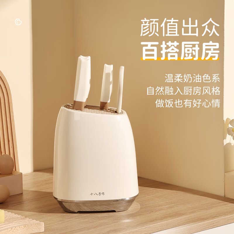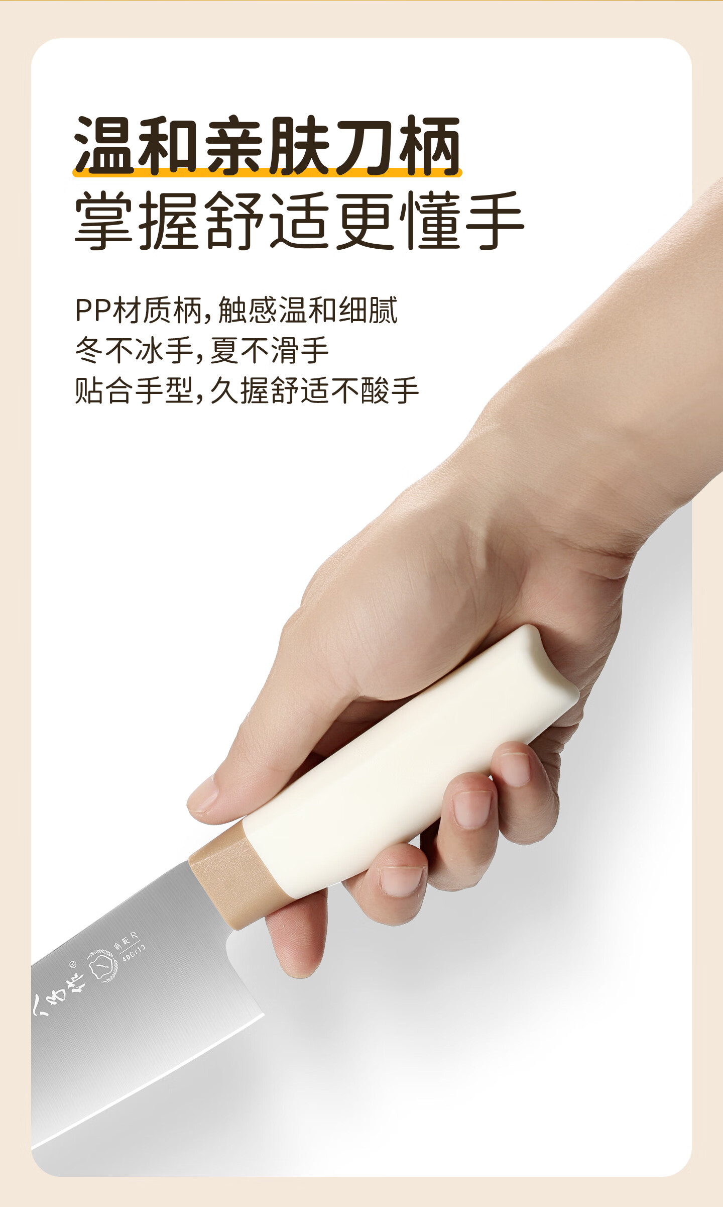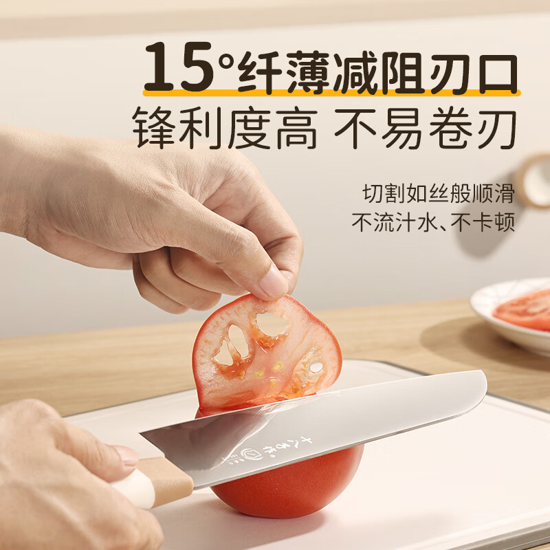 采用40Cr13不锈钢刀身;分体式刀座可拆分冲洗,告别缝隙藏污纳垢;PP食品级材质,轻盈贴合手掌,久握不打滑、不累手