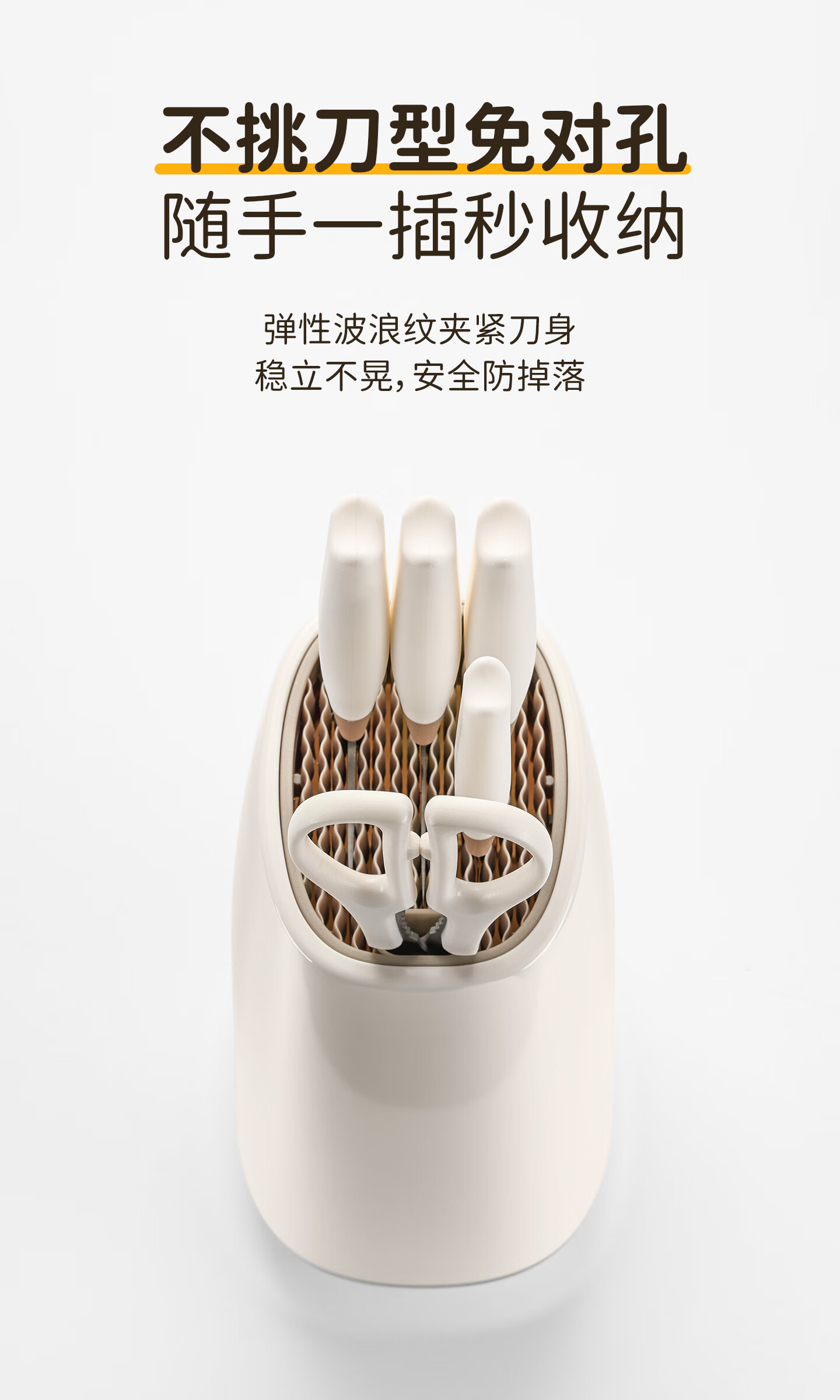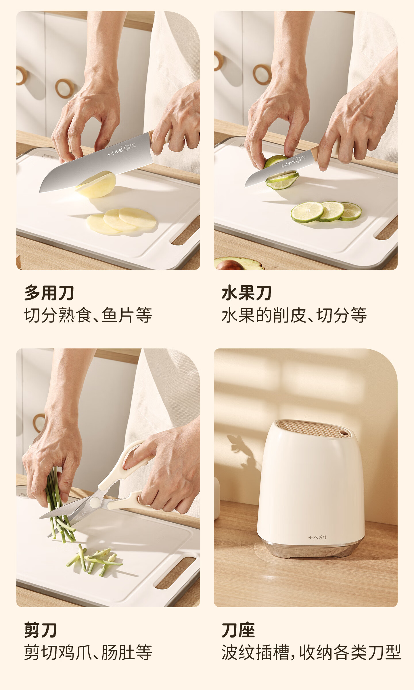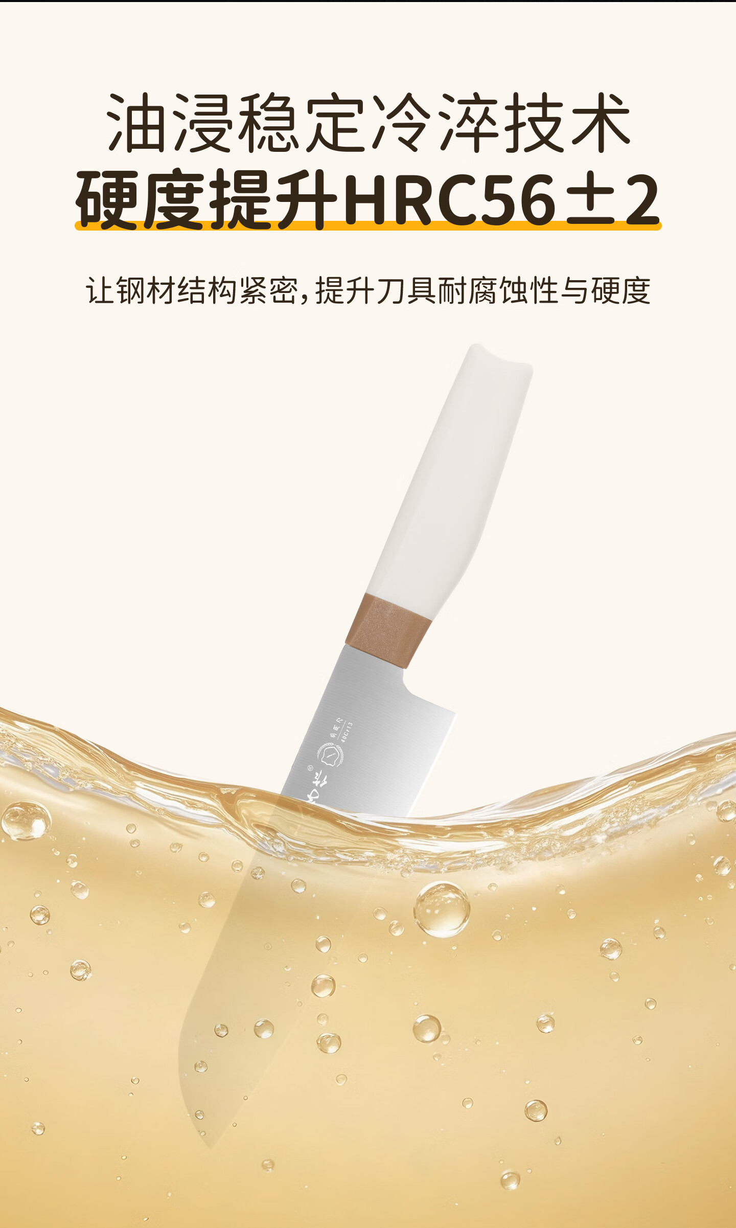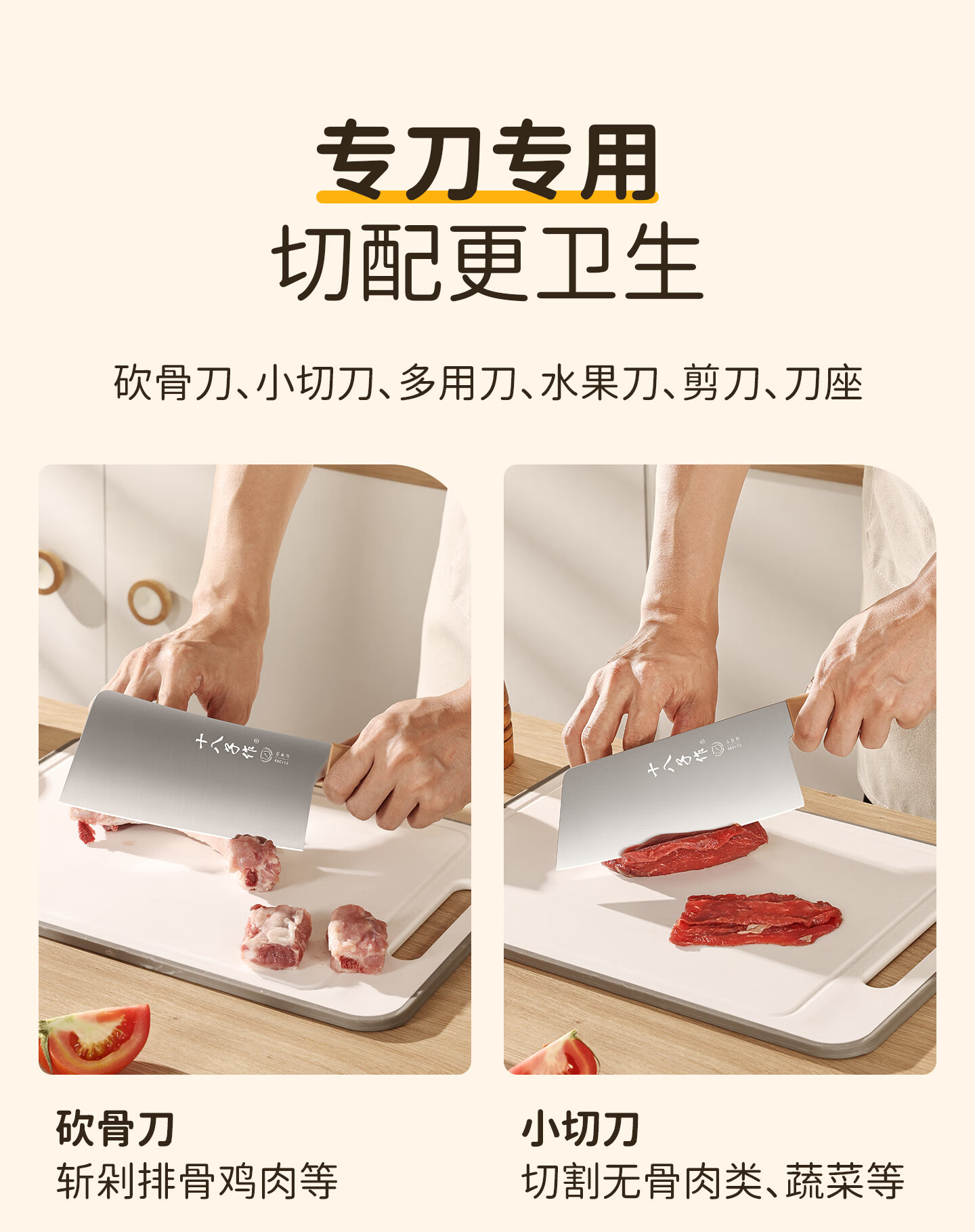采用40Cr13不锈钢刀身;分体式刀座可拆分冲洗,告别缝隙藏污纳垢;PP食品级材质,轻盈贴合手掌,久握不打滑、不累手
