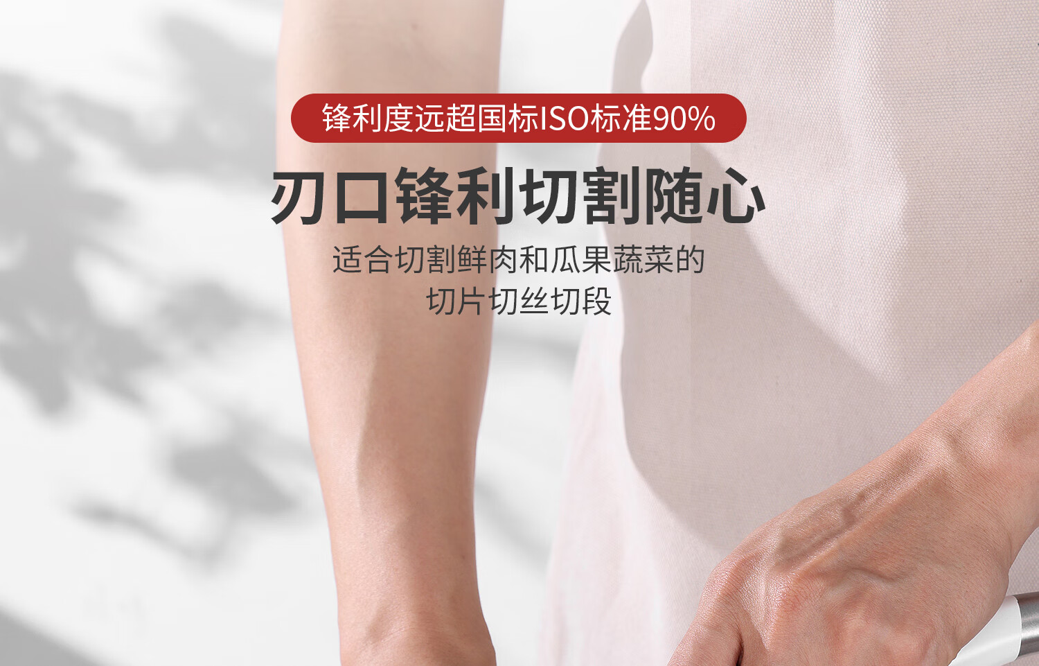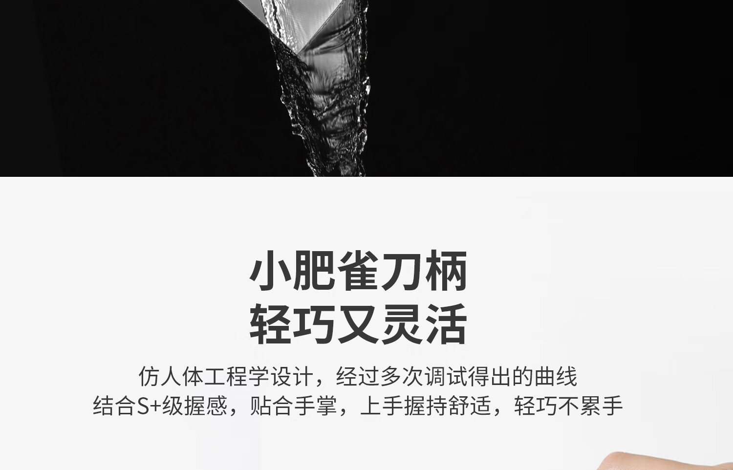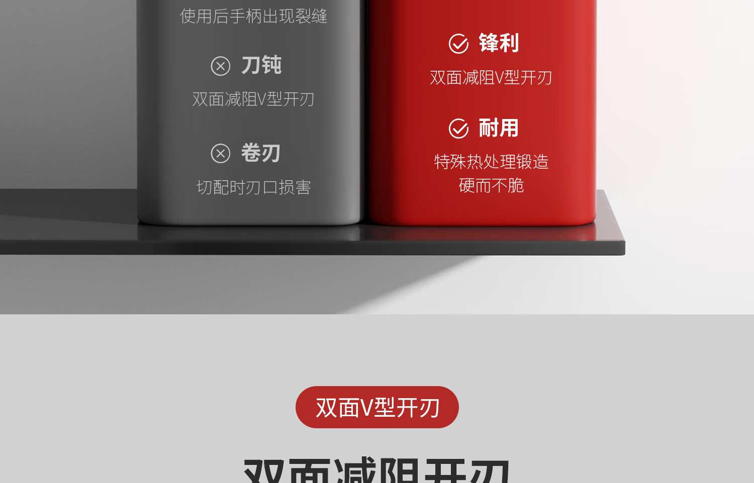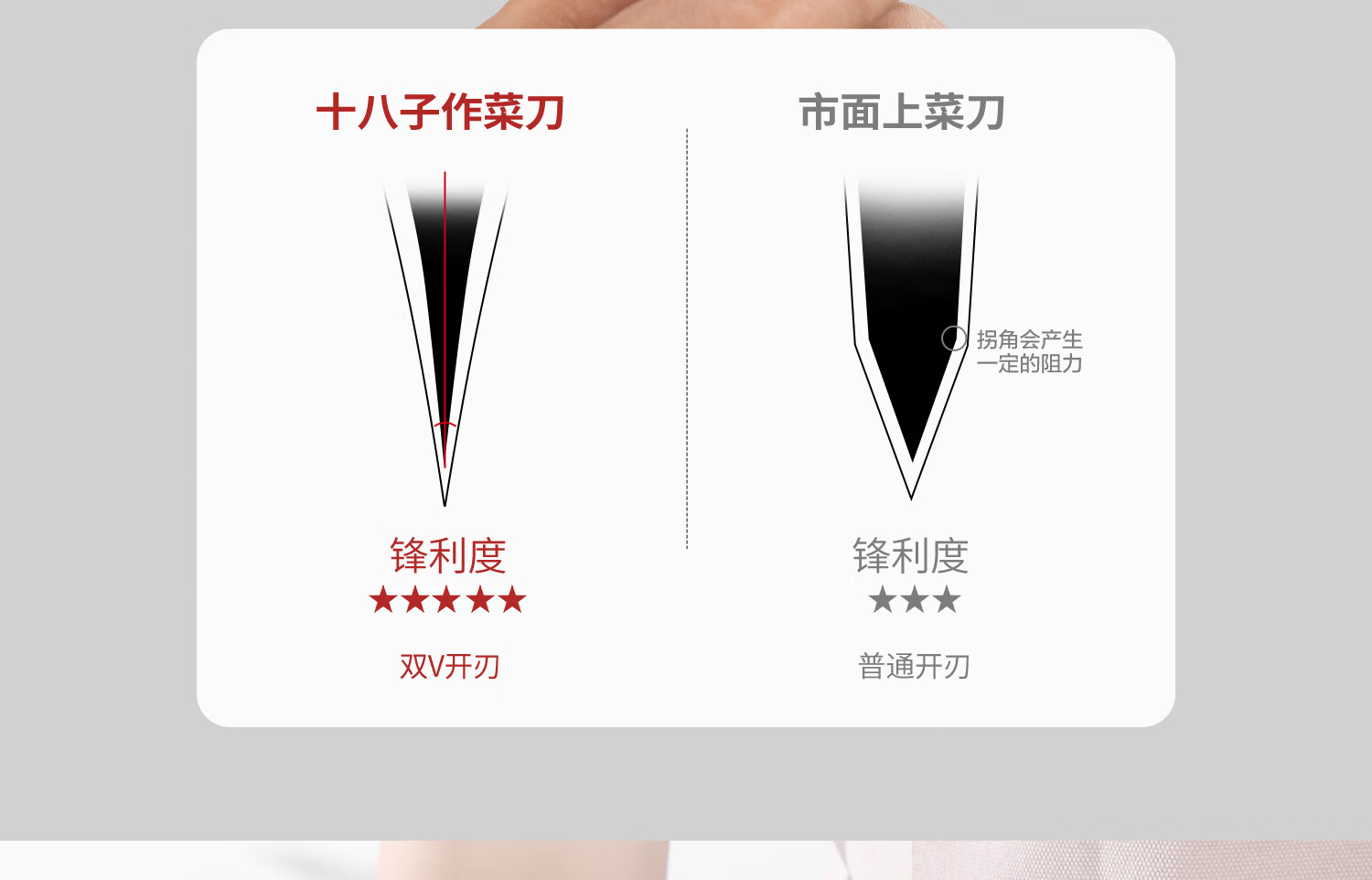 锋利刃口 切割顺畅;V型渐薄刃口,切割阻力小,刀具更锋利;精炼锻造刀身,耐久性好