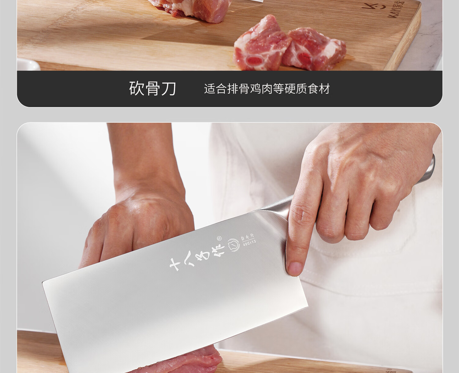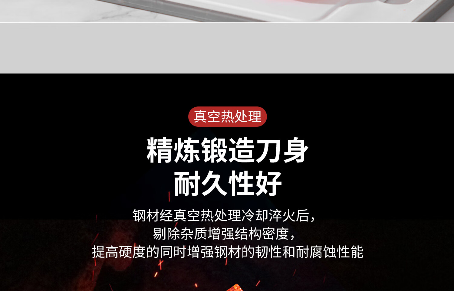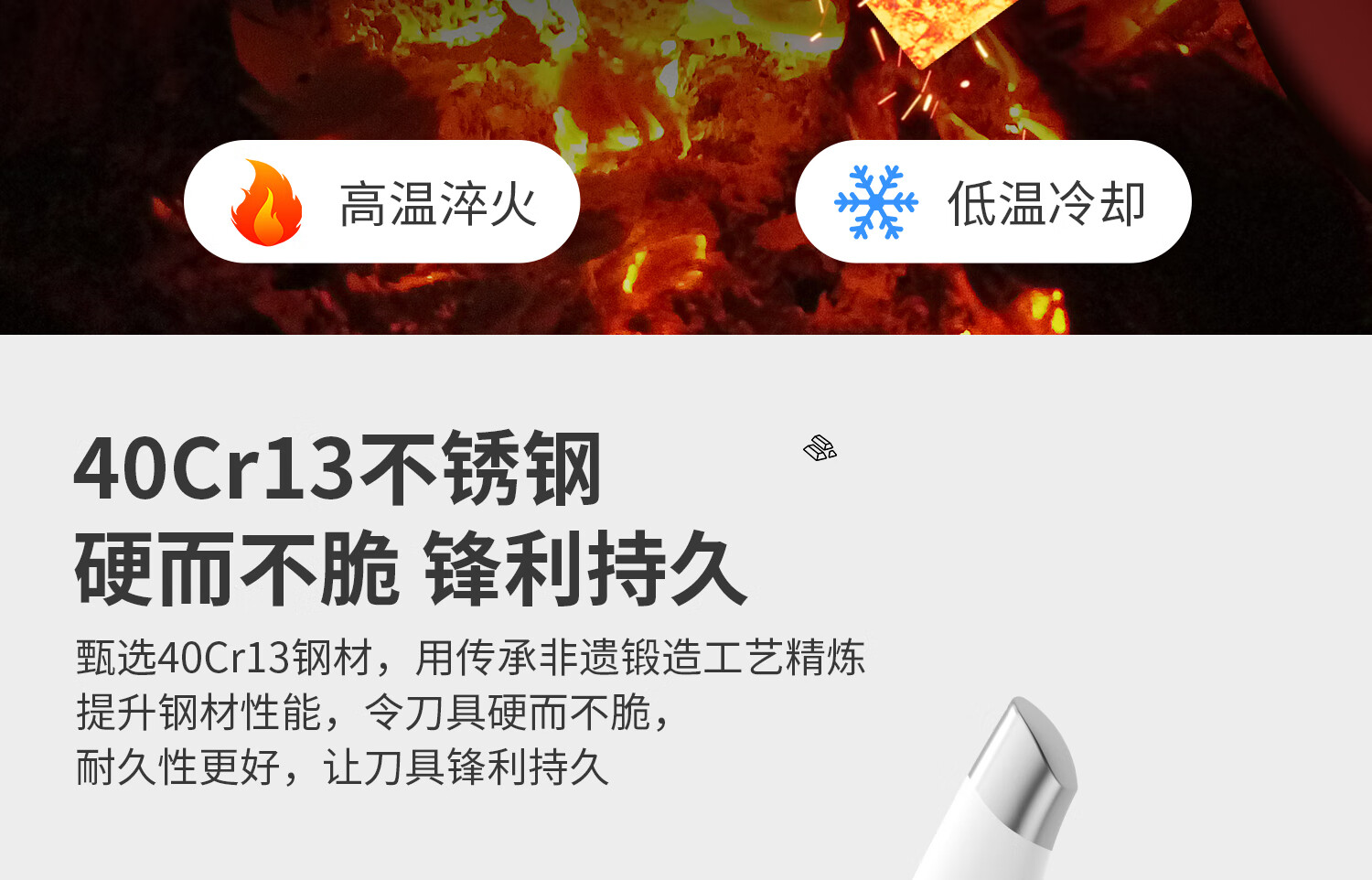 锋利刃口 切割顺畅;V型渐薄刃口,切割阻力小,刀具更锋利;精炼锻造刀身,耐久性好