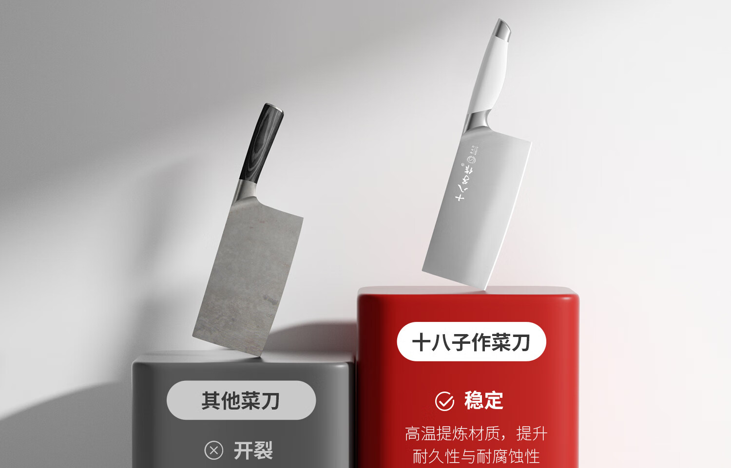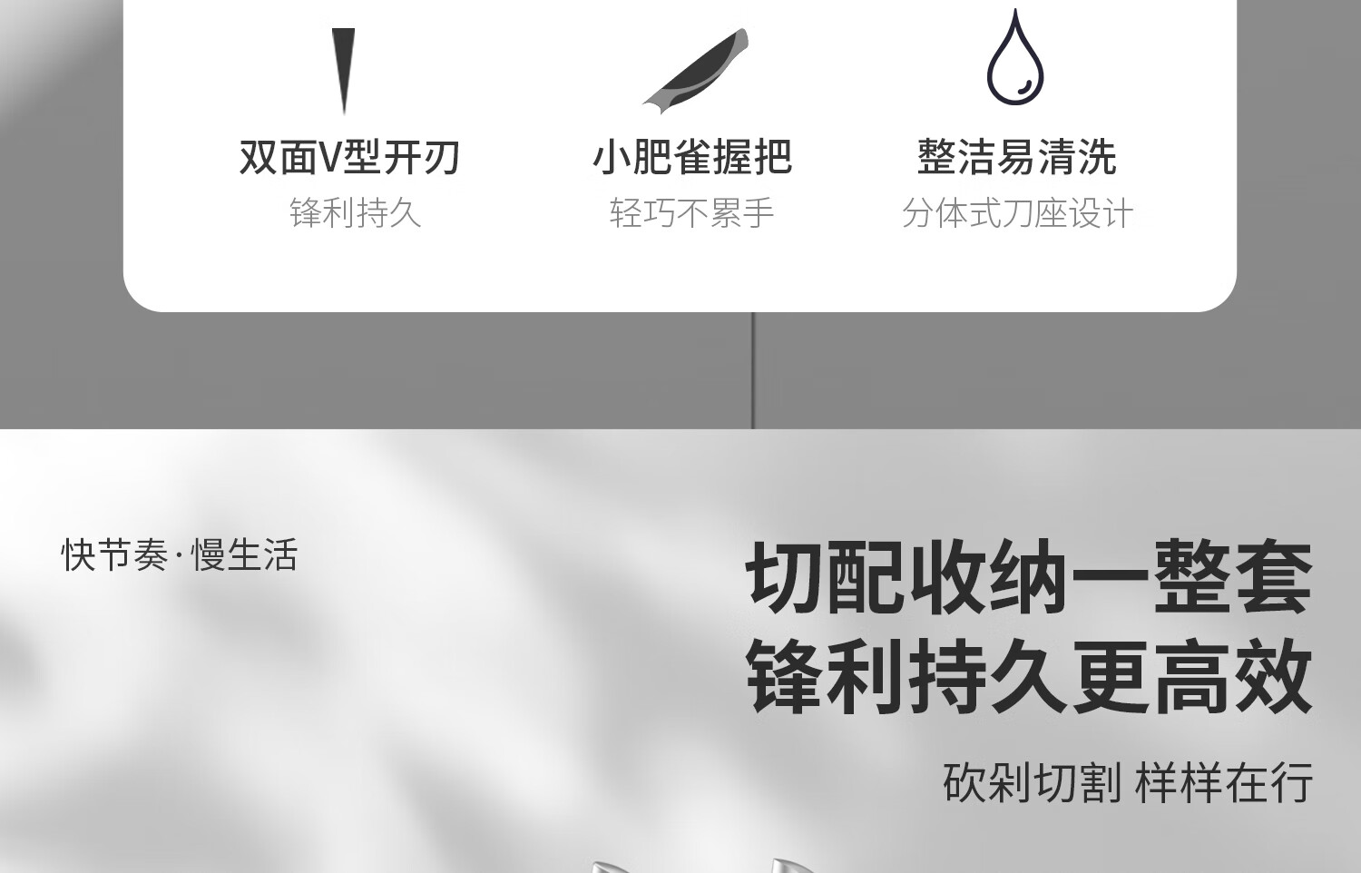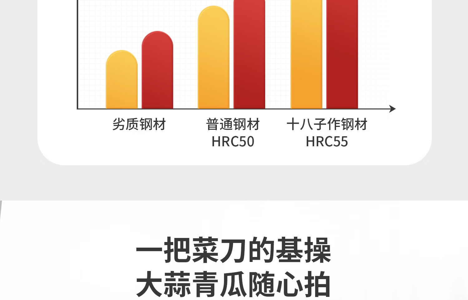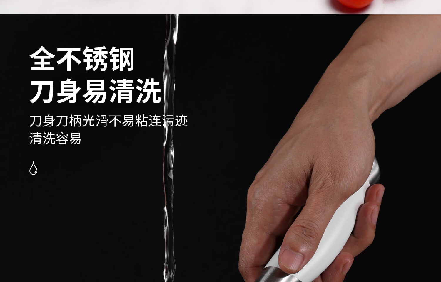 锋利刃口 切割顺畅;V型渐薄刃口,切割阻力小,刀具更锋利;精炼锻造刀身,耐久性好