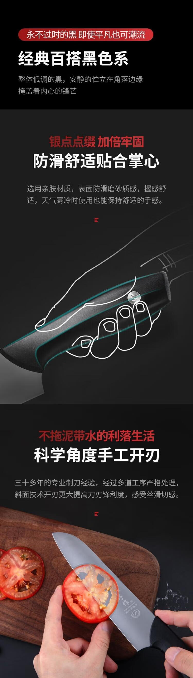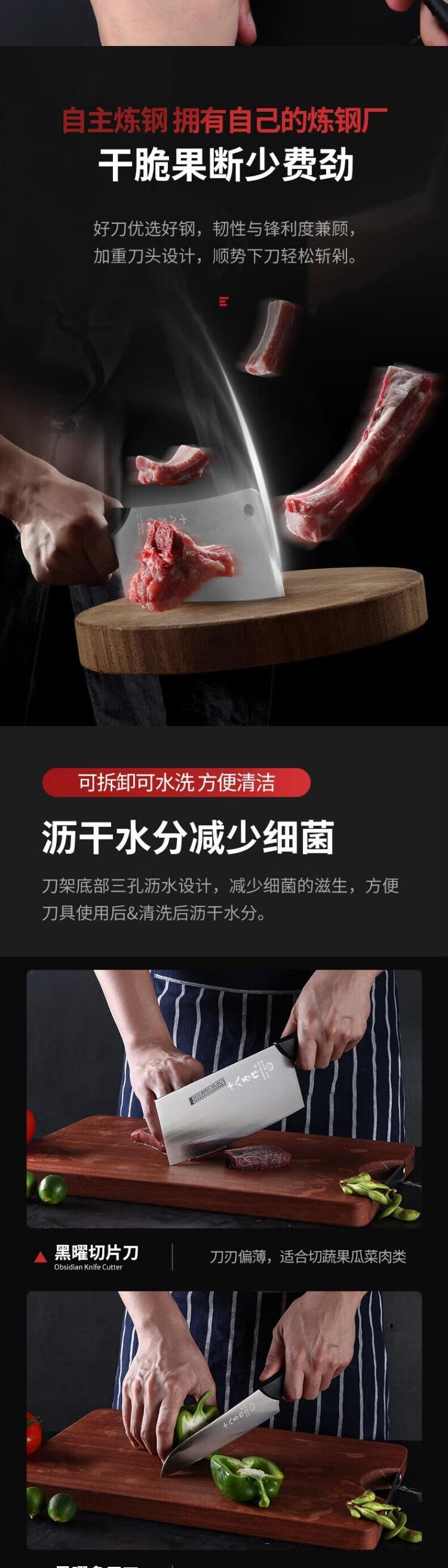 刀架底部三孔沥水设计,减少细菌的滋生;好刀优选好钢,韧性与锋利度兼顾;加重刀头设计,顺势下刀轻松斩剁