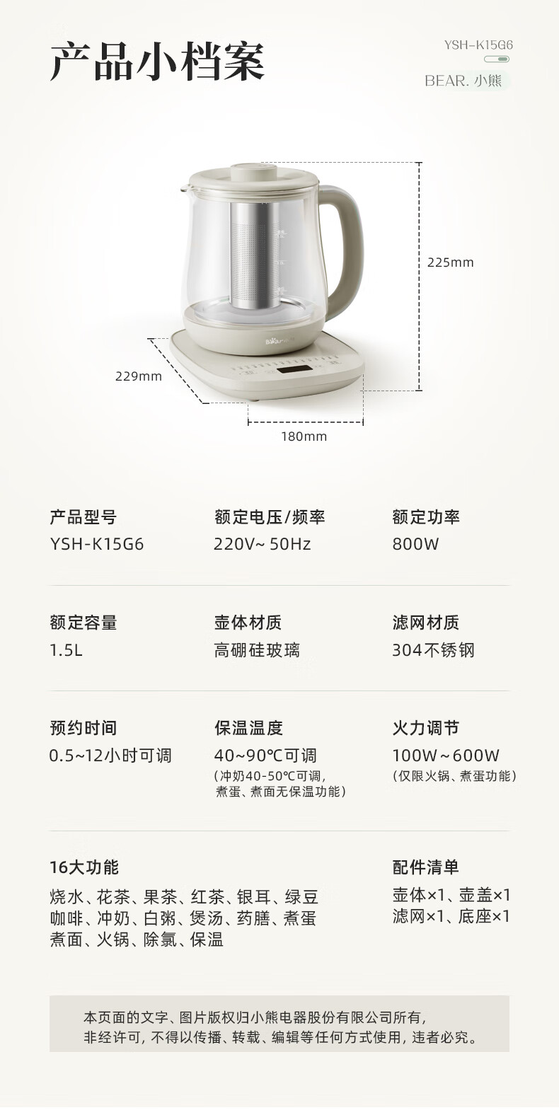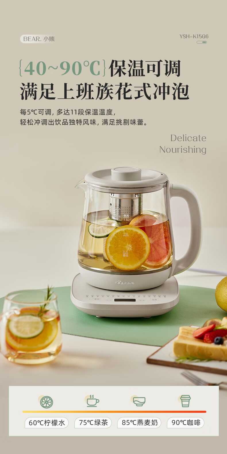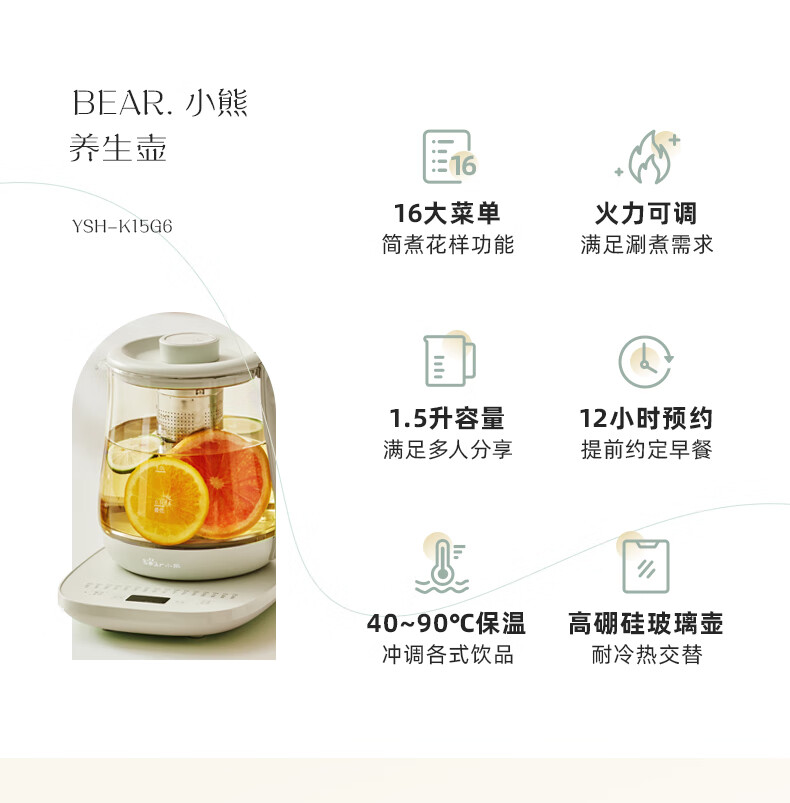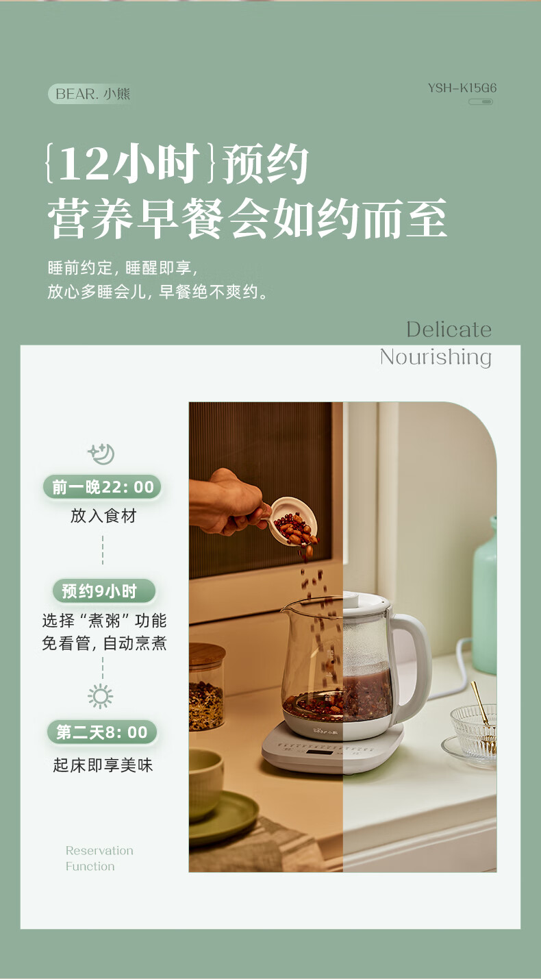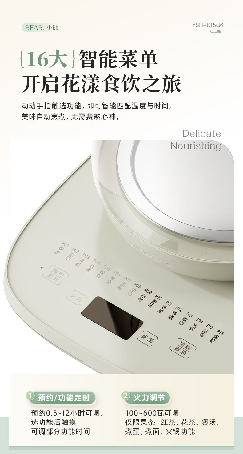 16大菜单简煮花样功能;12小时预约,提前约定早餐;40~90°C保温,冲调各式饮品
