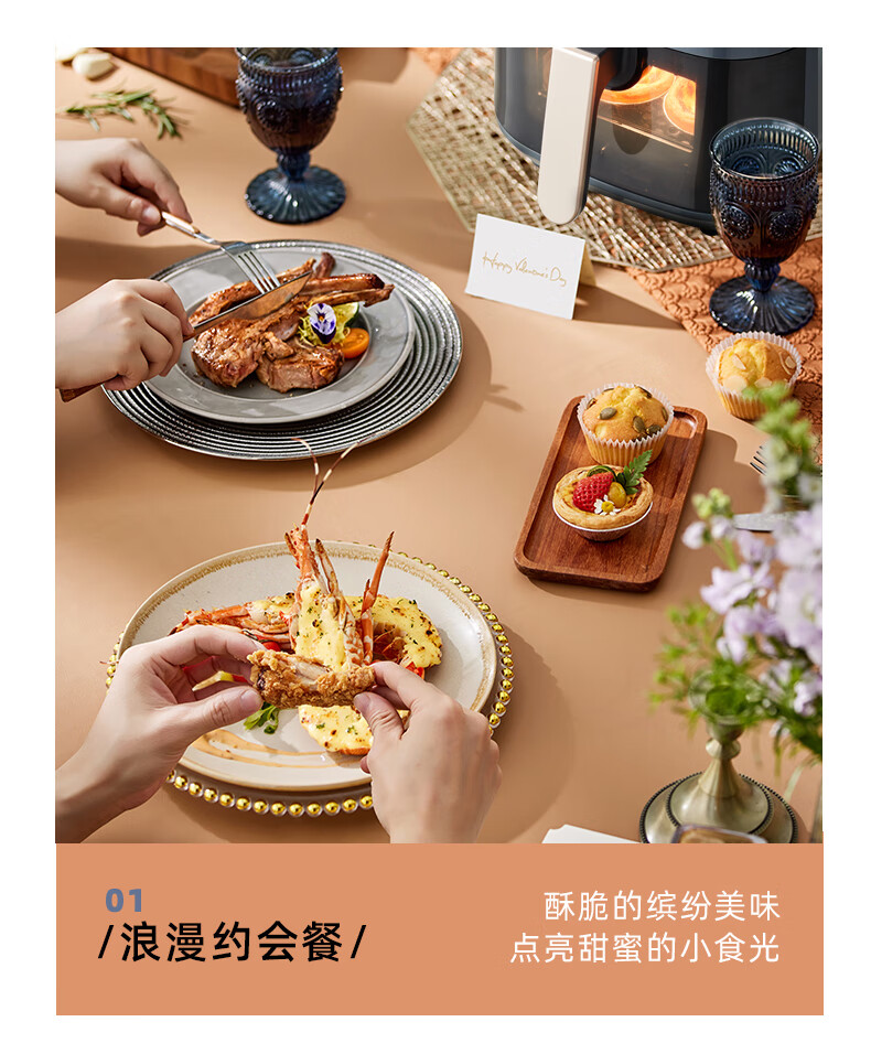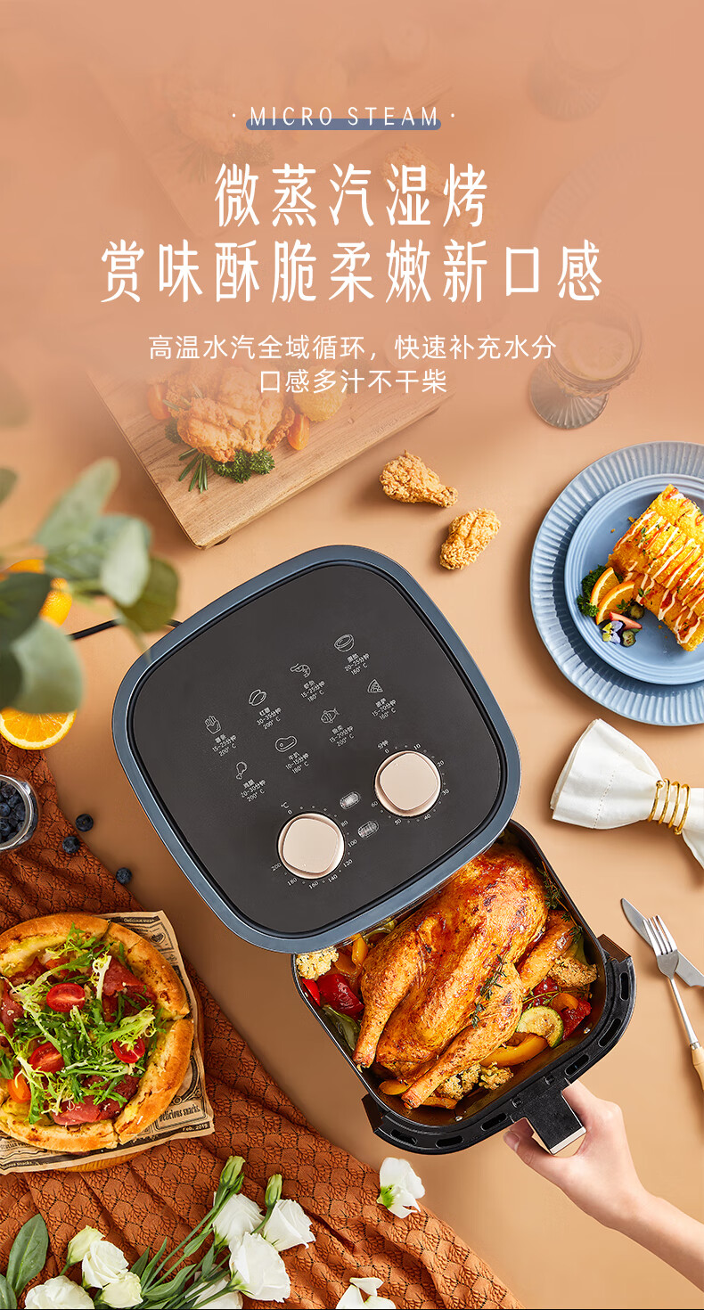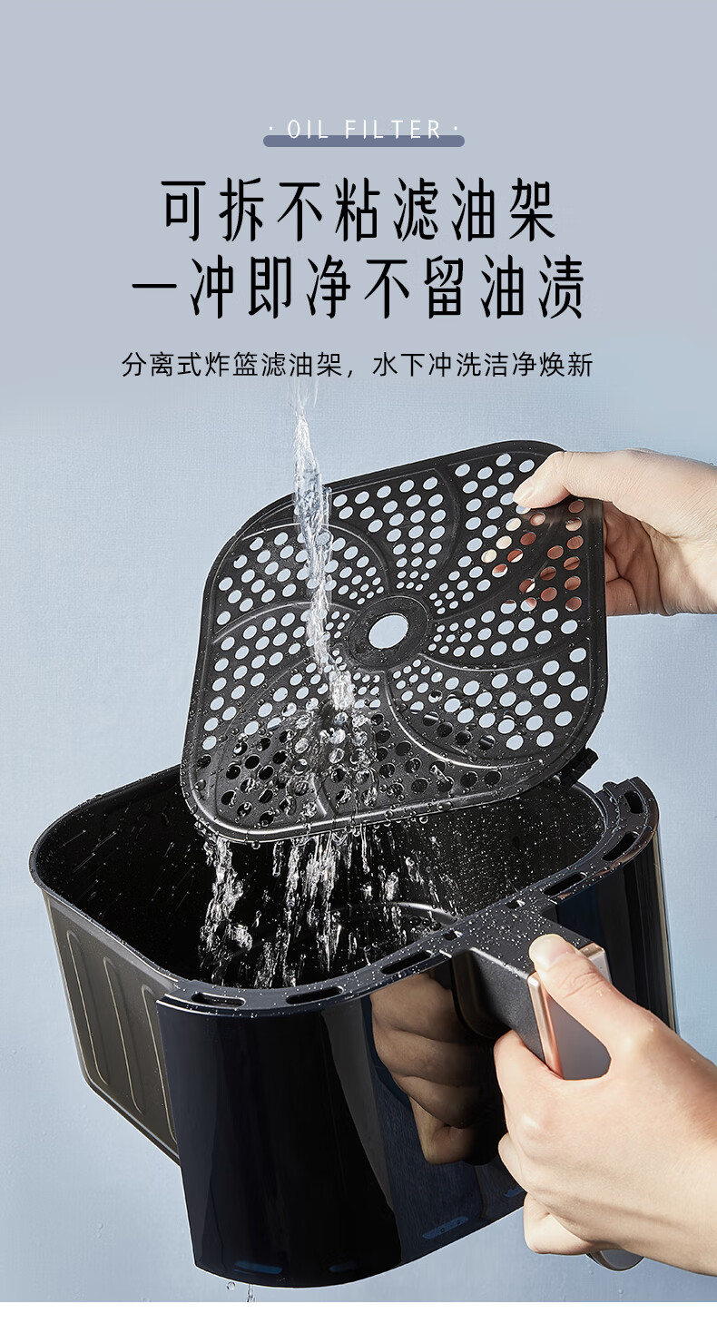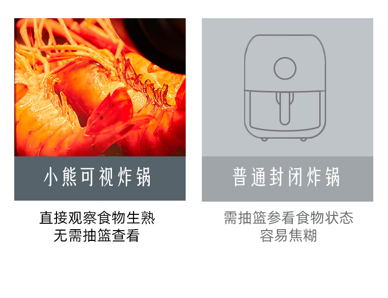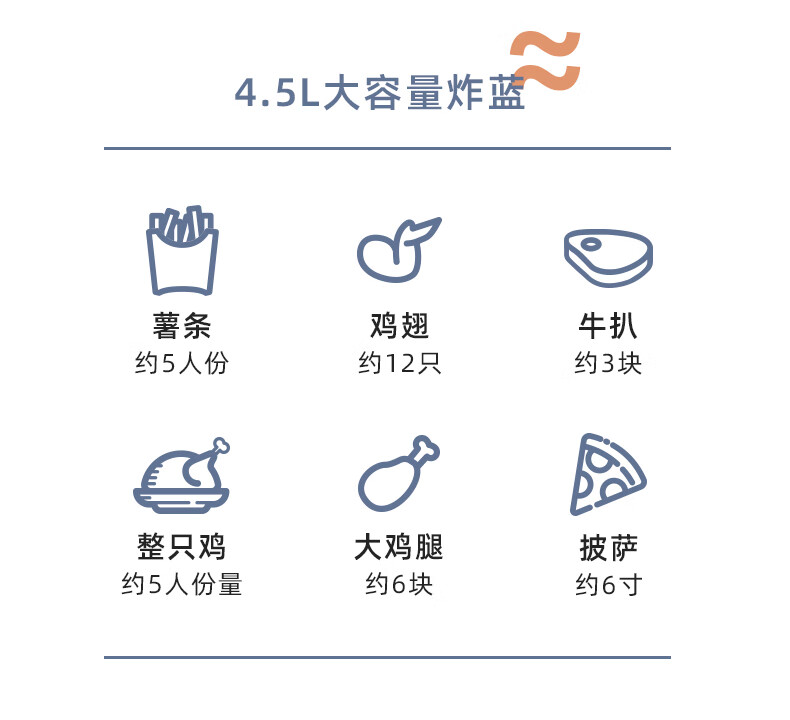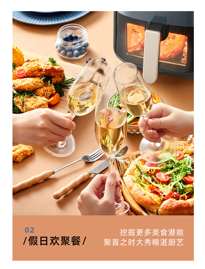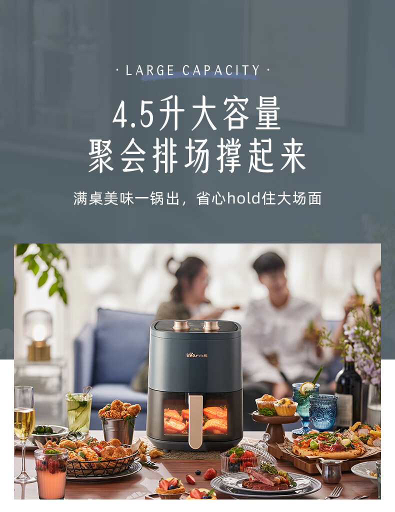 4.5L大容量,够全家享用;可视化炸篮,酥脆过程看得见;光波管热风烤,升温快温场均匀