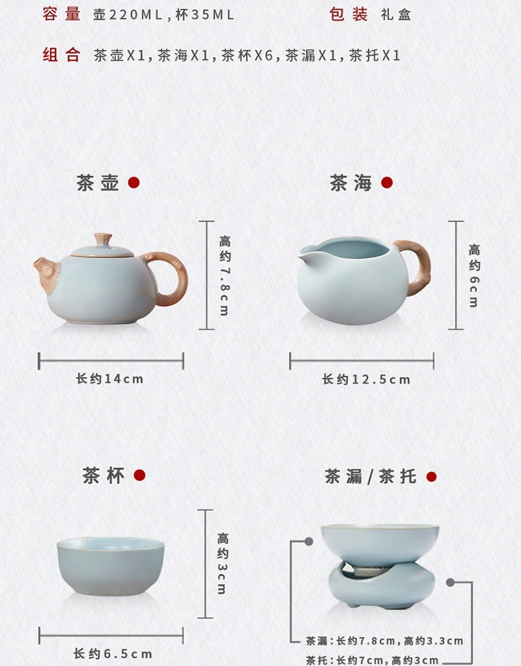配置清单:茶壶*1茶海*1茶杯*6茶漏*1茶漏架子*1