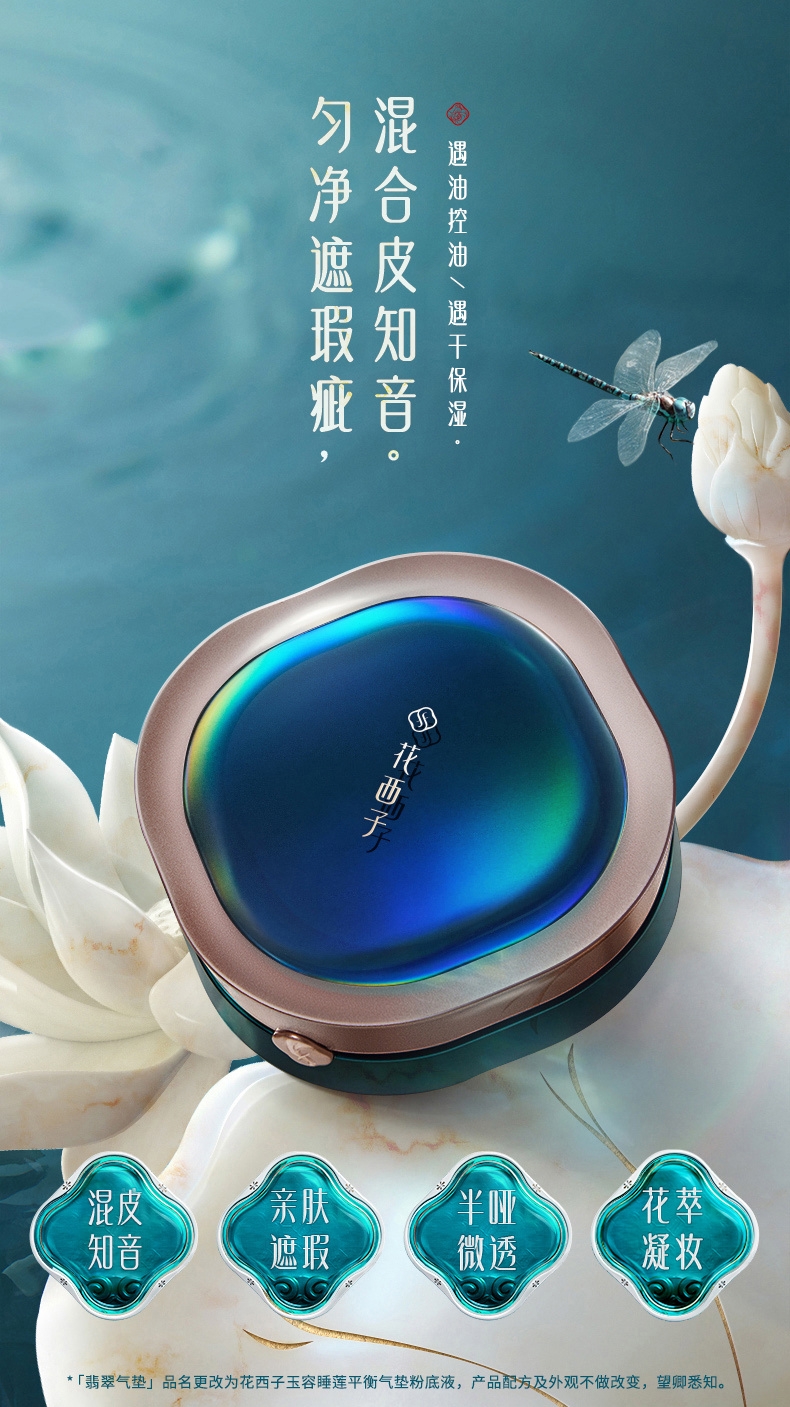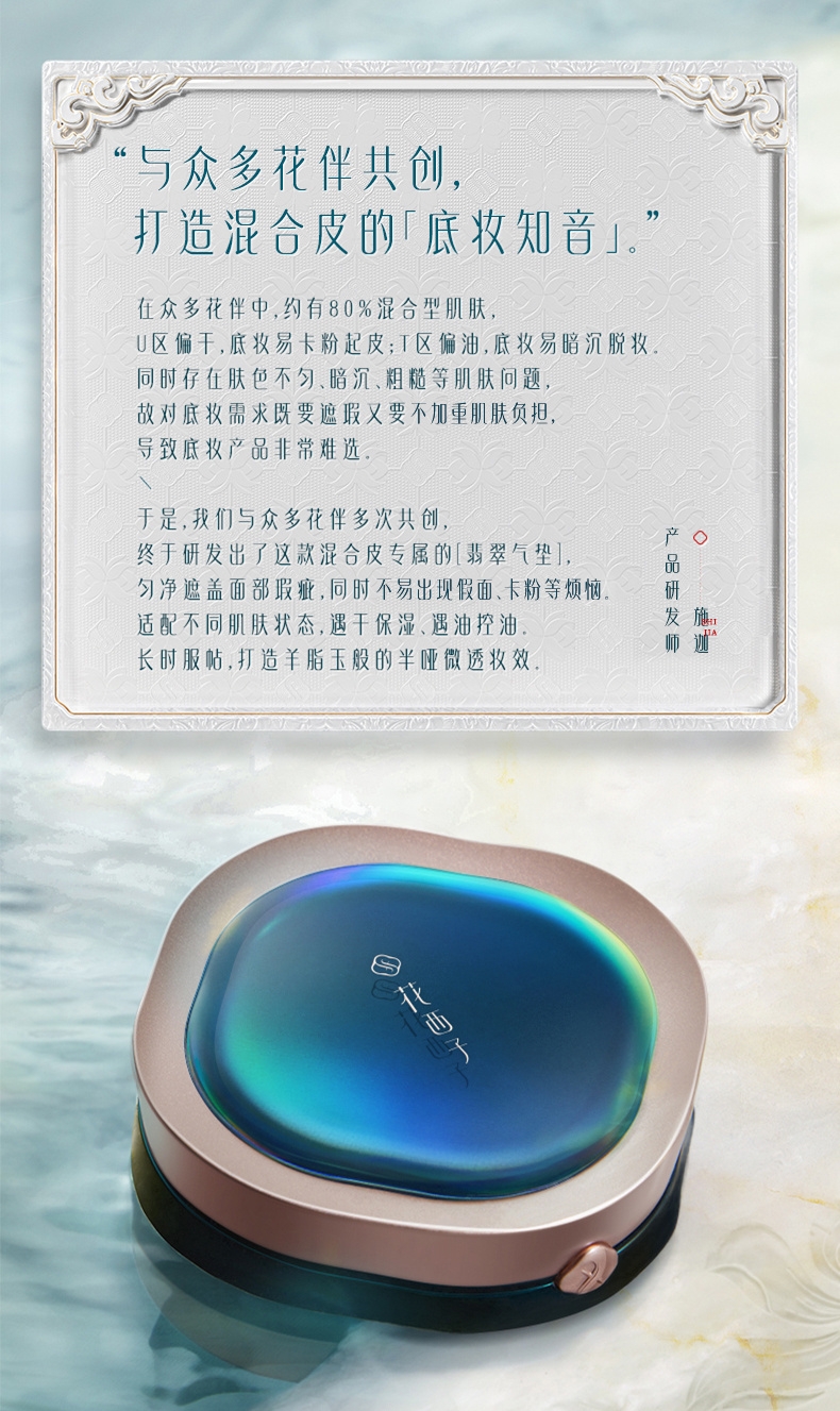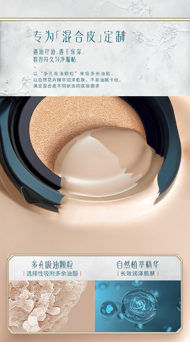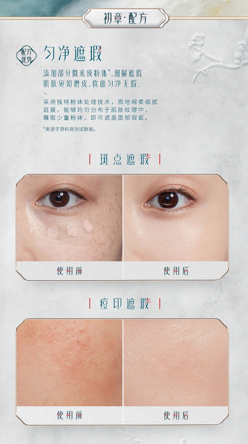 成分养肤:东方植物精粹,化妆即护肤;妆效自然:半哑光微透,打造“伪素颜”;持妆出色:创新锁妆膜,全天候精致