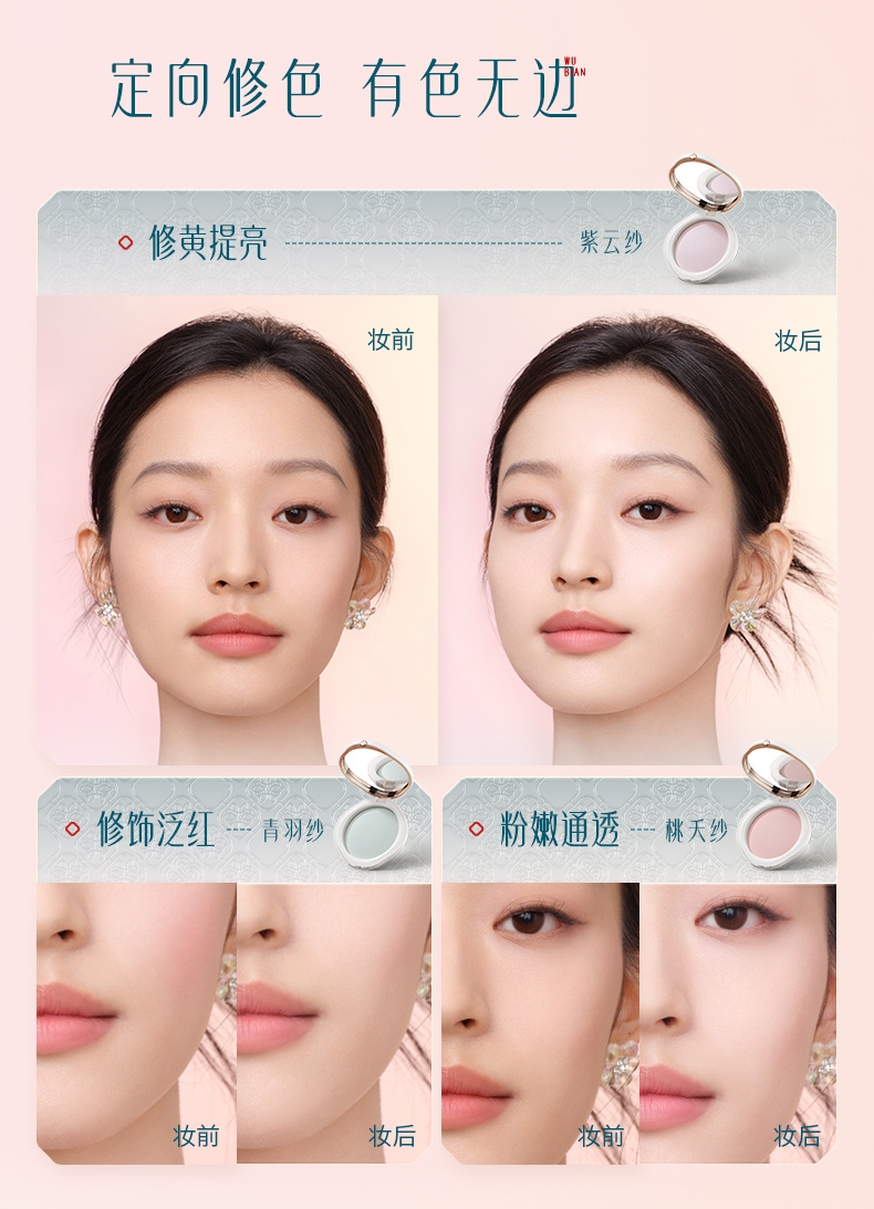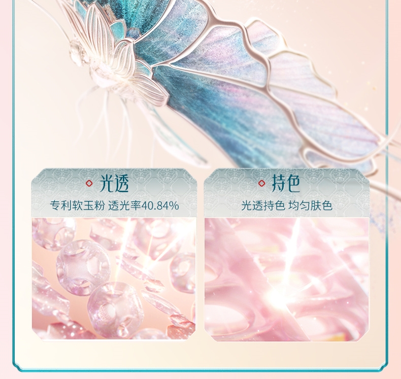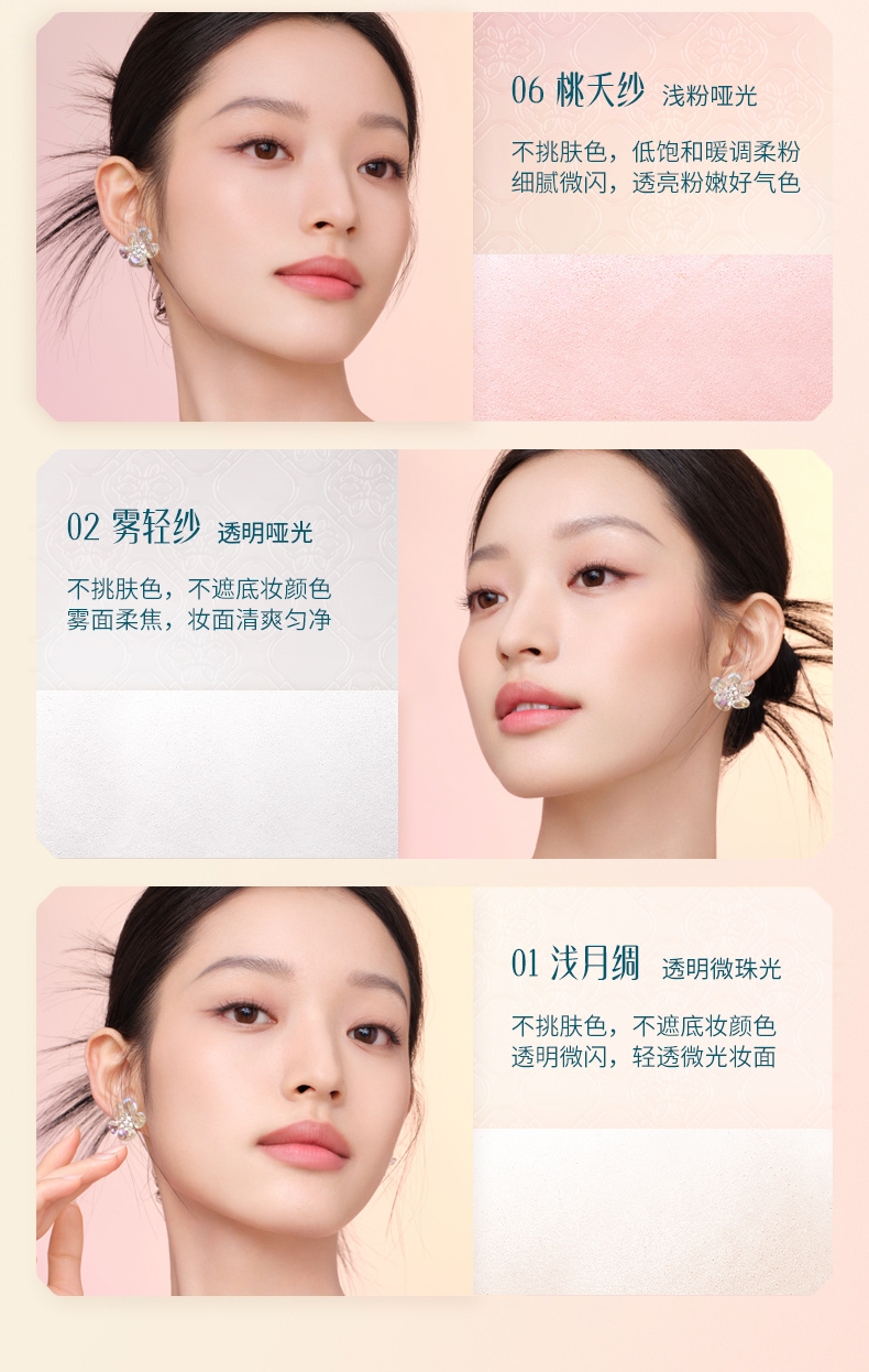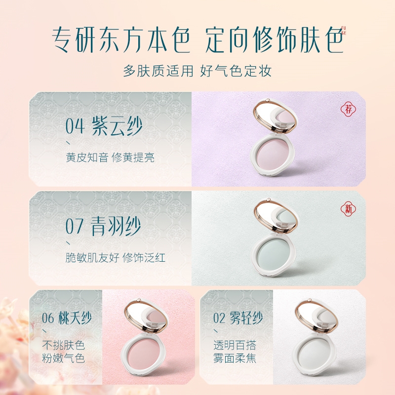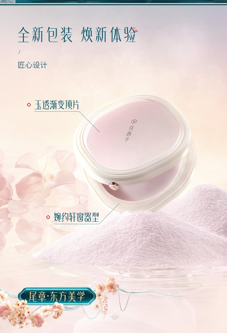 东方美学设计,颜值与实用并存;粉质细腻轻盈,打造自然柔焦妆效;控油持妆,妆容持久清新