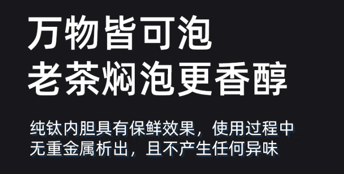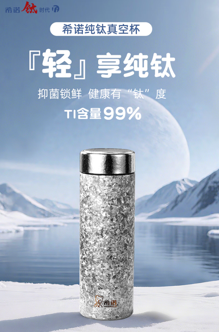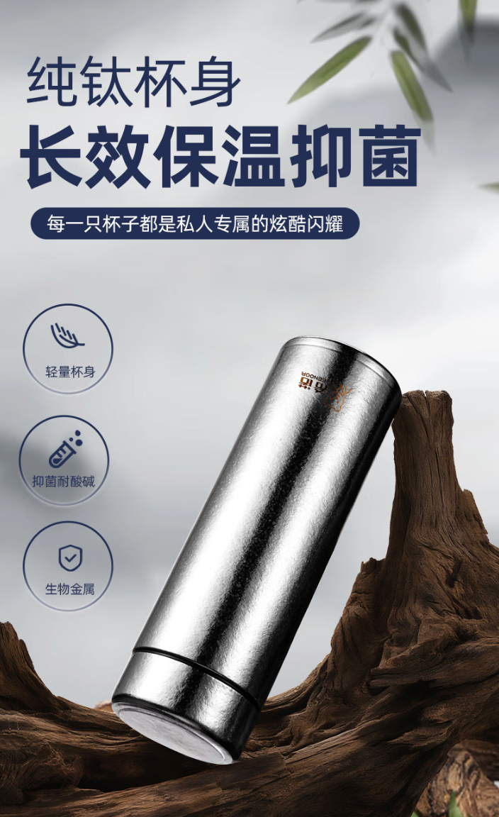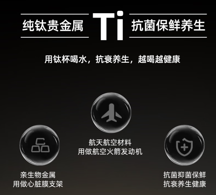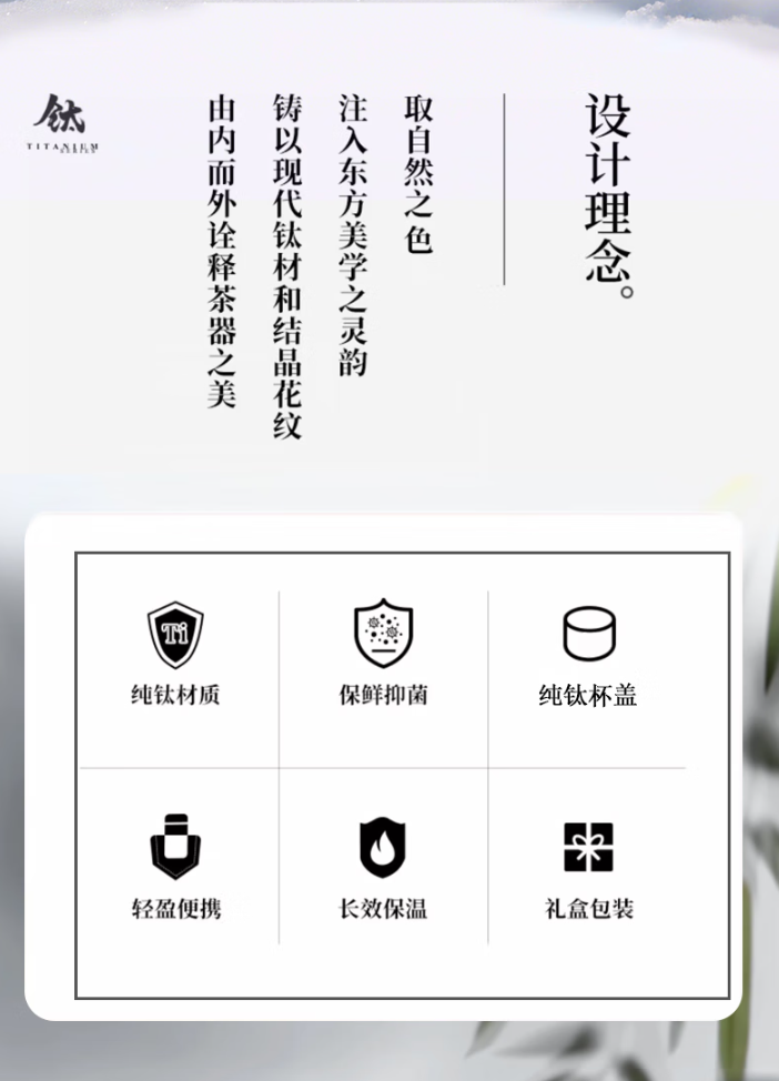 纯钛杯身,长效保温抑菌;用钛杯喝水,抗衰养生,越喝越健康;99%内外纯钛,轻巧材质,随行随饮