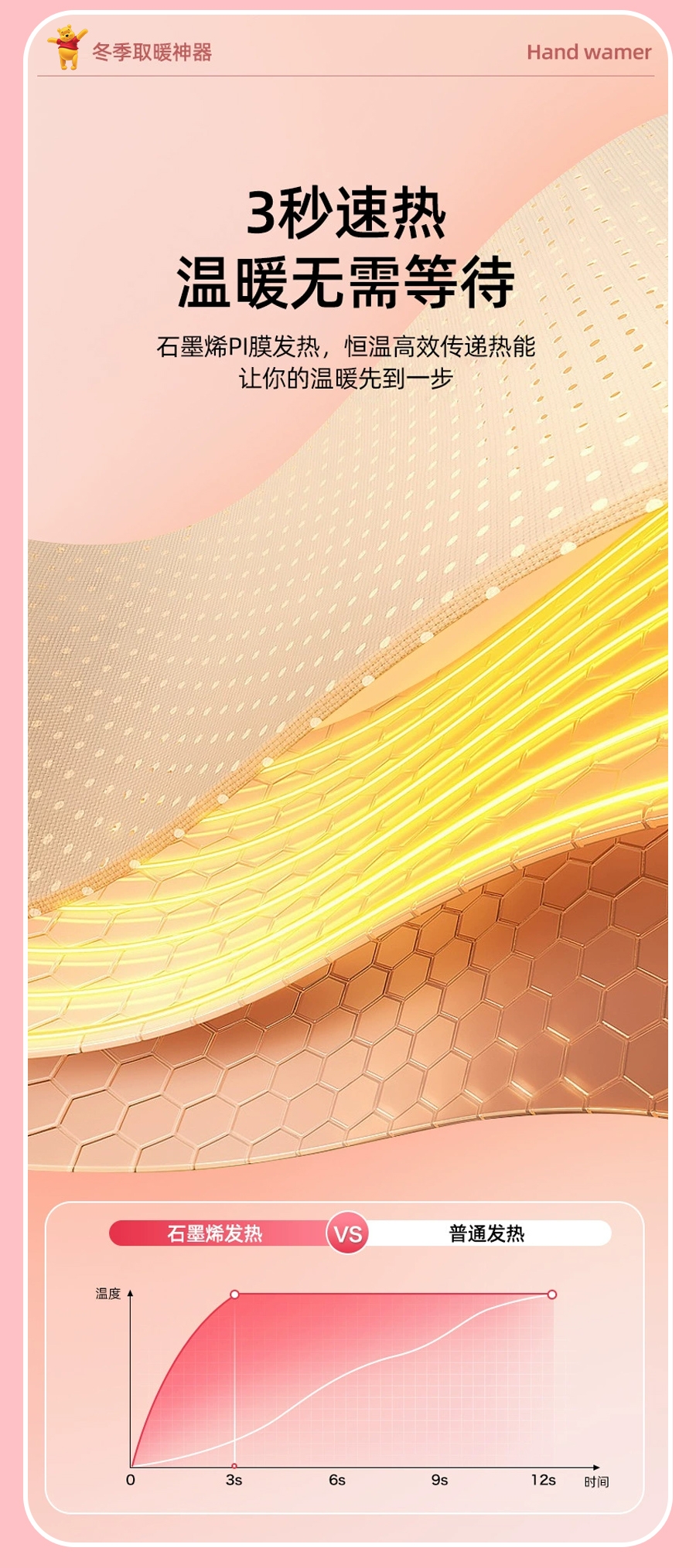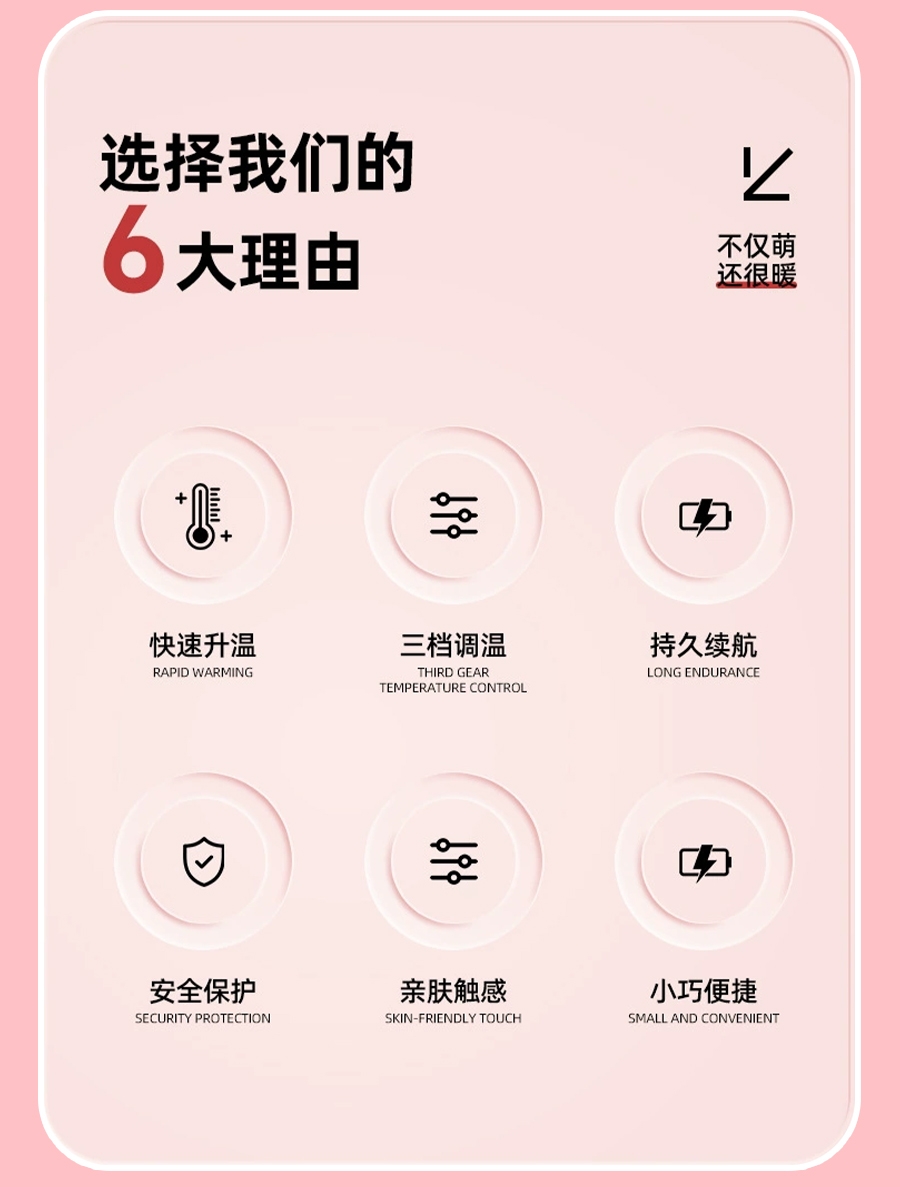 三档调温,一按即热;石墨烯360°环绕发热;usb充电,又暖又安全