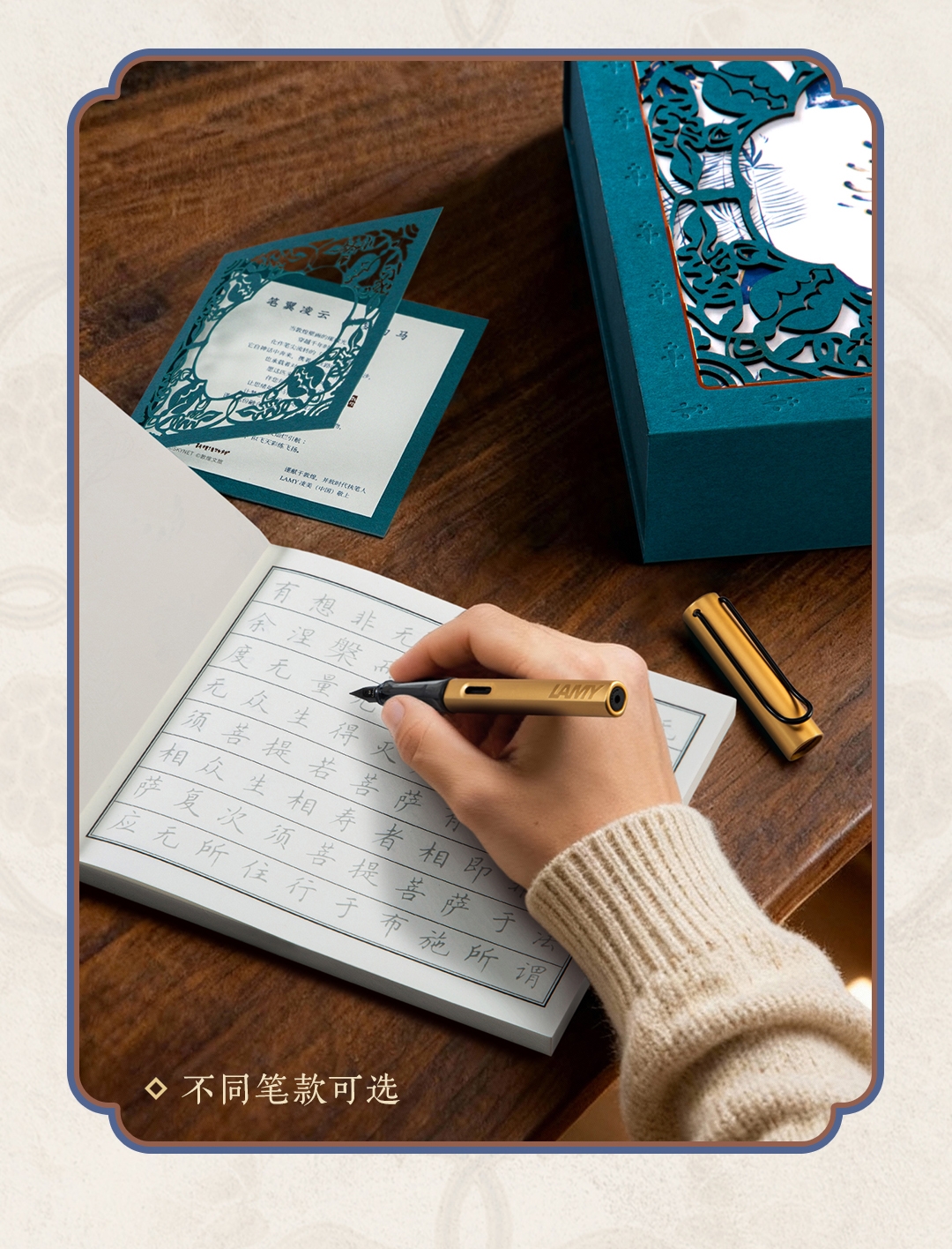 配置清单:包装盒一个、书法字帖一本、墨水笔一支、故事卡一张、吸墨器一支、墨水芯一盒