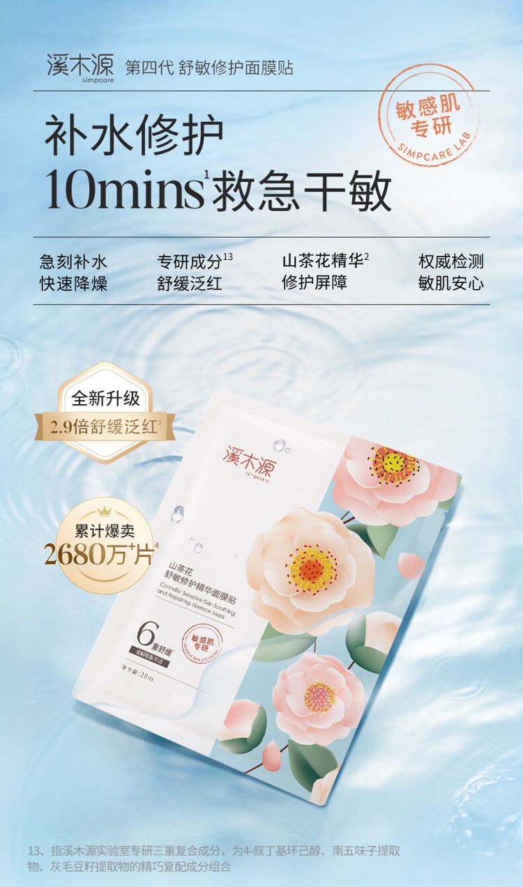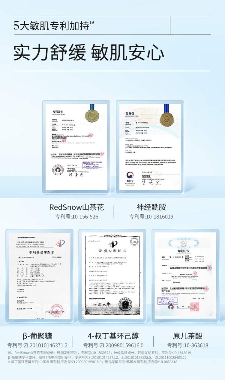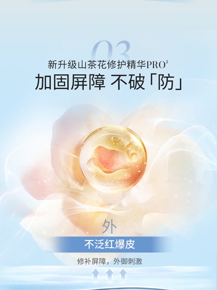 含有RedSnow PRO™山茶花精萃;优异的储水力和修护力,加速修护肌肤屏障;含有山茶花提取物,有助于舒缓肌肤,减少红肿和刺激