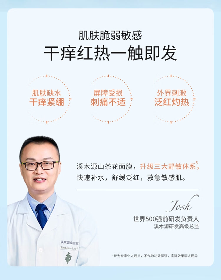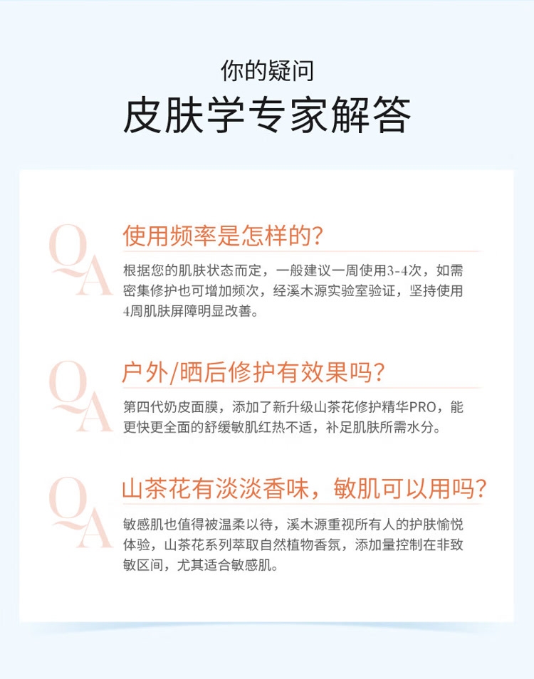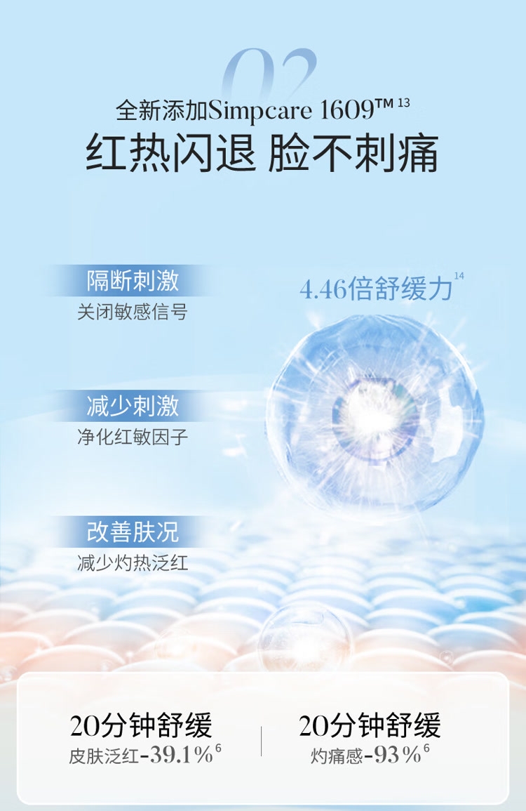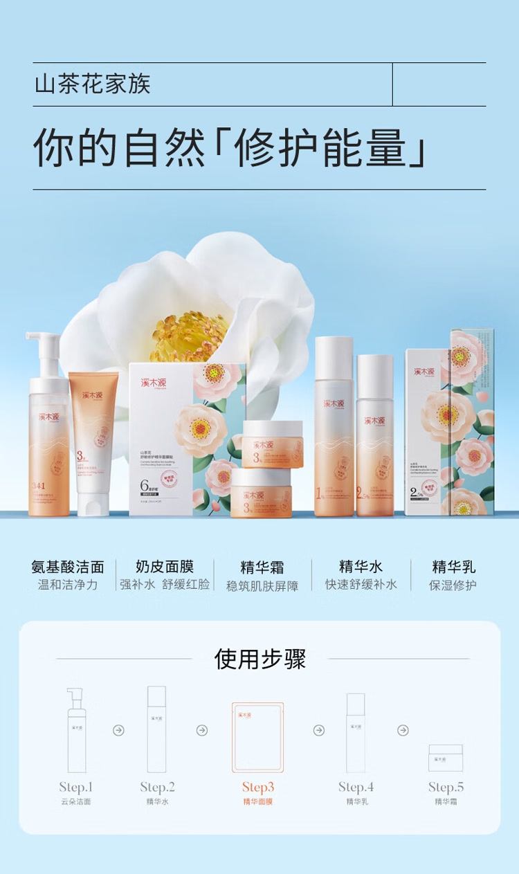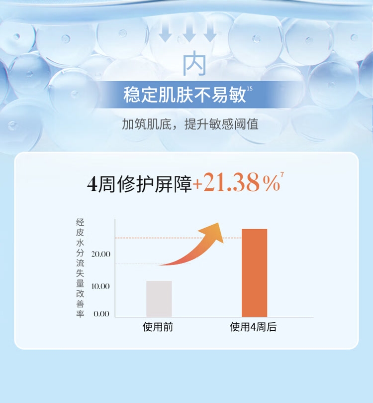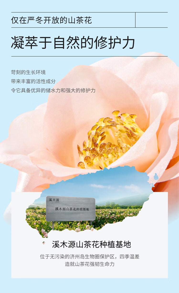 含有山茶花提取物,有助于舒缓肌肤,减少红肿和刺激;集修护、舒缓、保湿于一体;具有优异的储水力和修护力,加速修护肌肤屏障