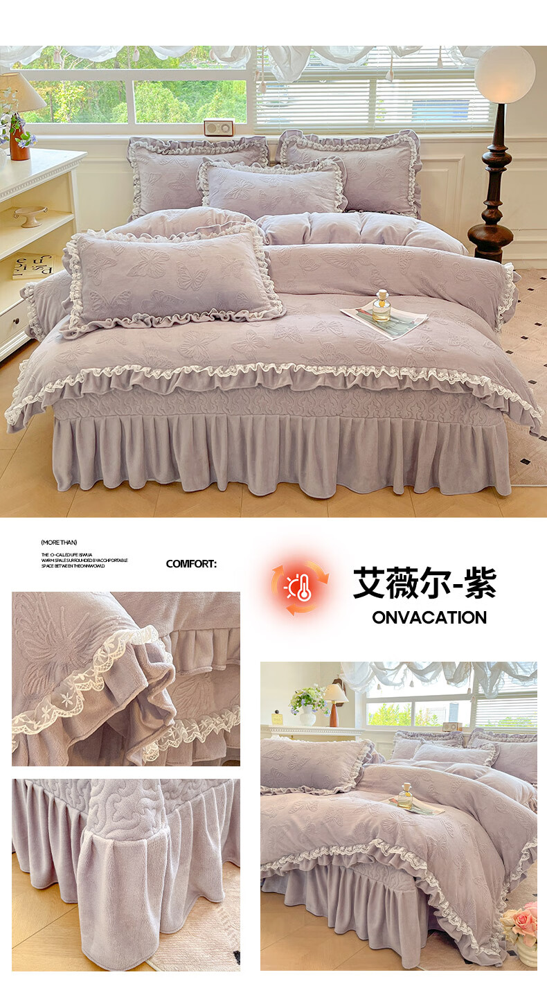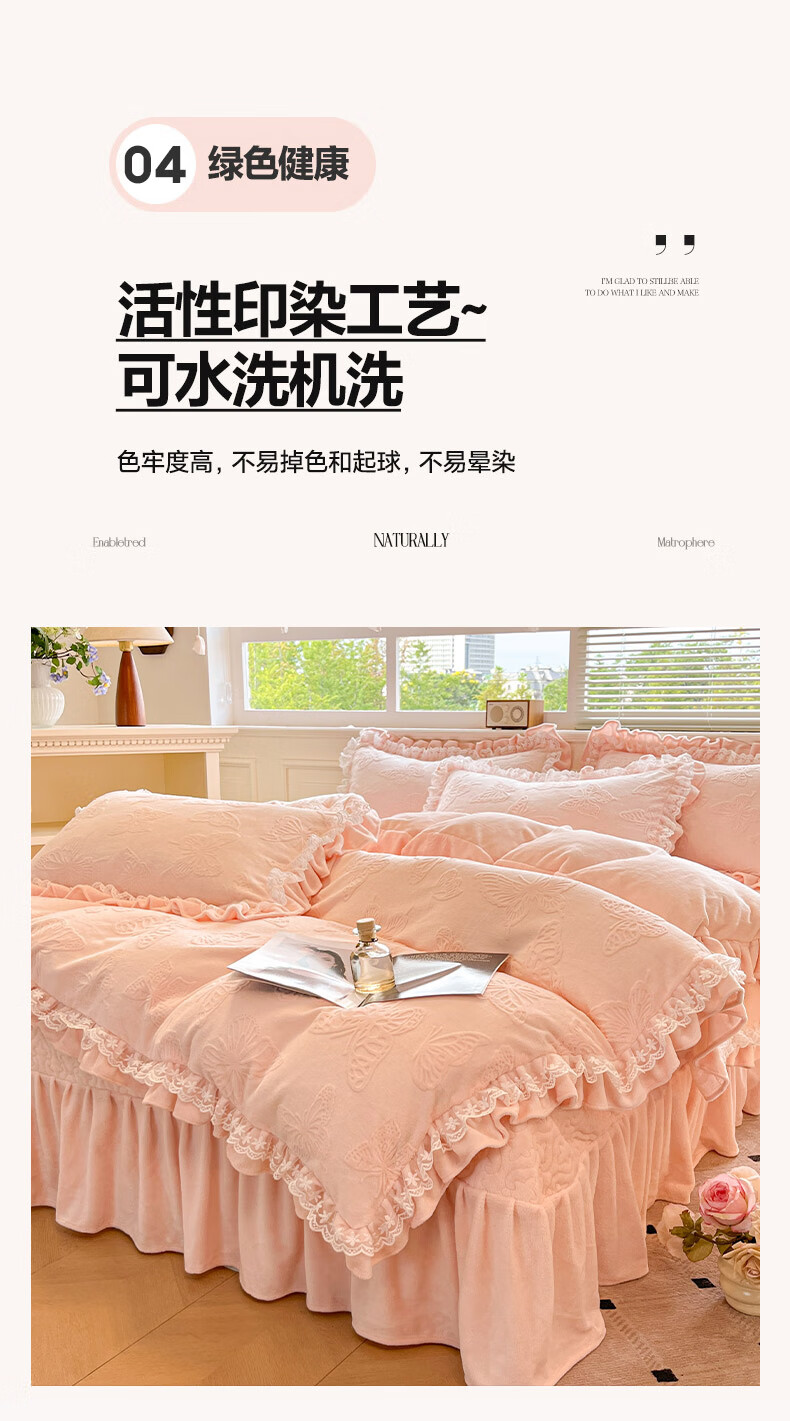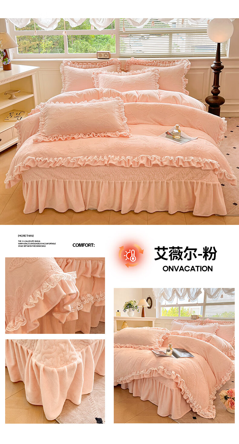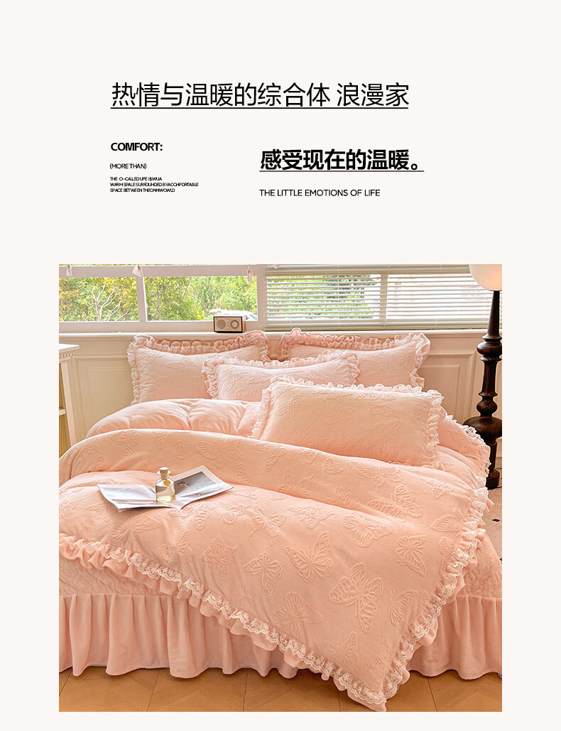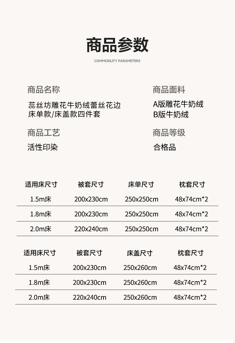 雕花牛奶绒床单款蕾丝边四件套 热情与温暖的综合体;A版雕花牛奶绒面料 B版牛奶绒面料 让保暖持续;蓬松柔软 足够抵御外界冷空气