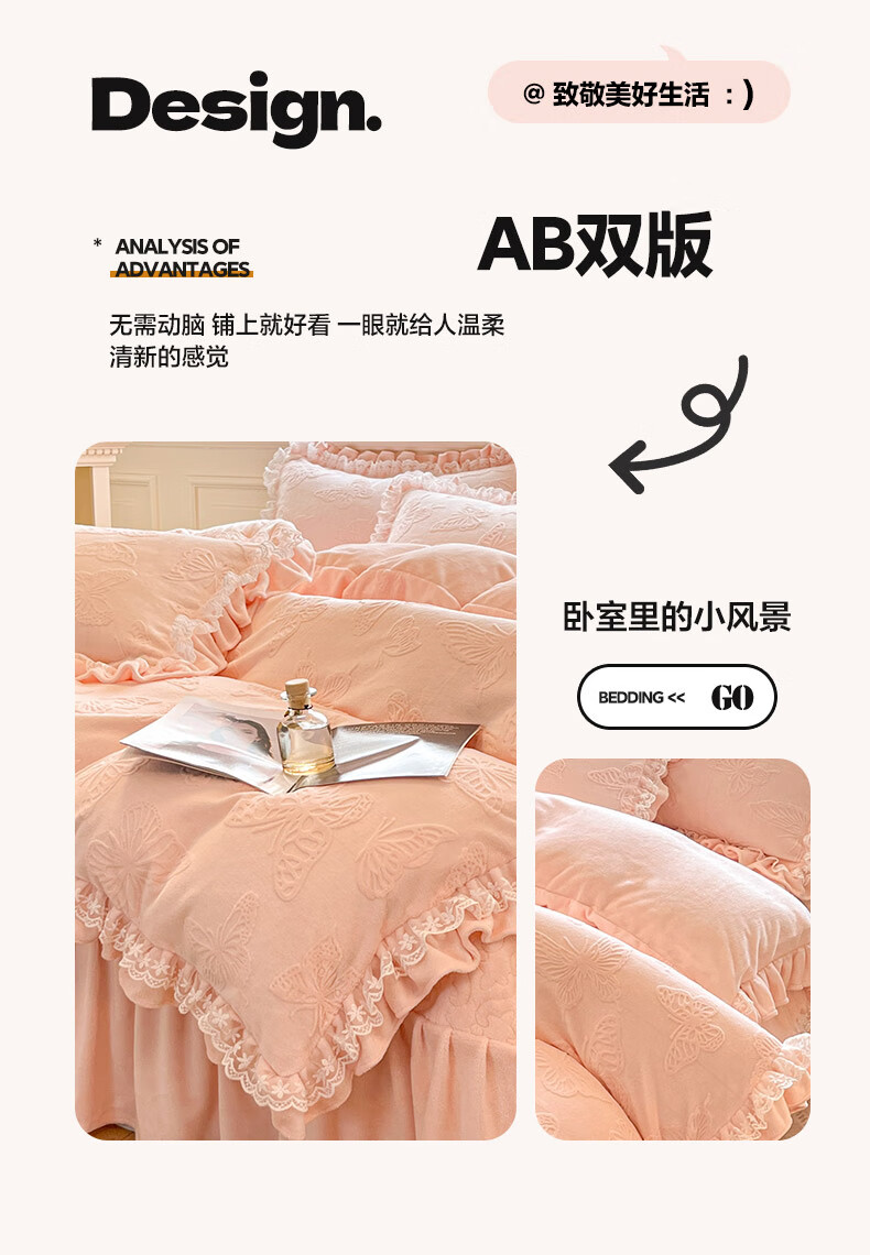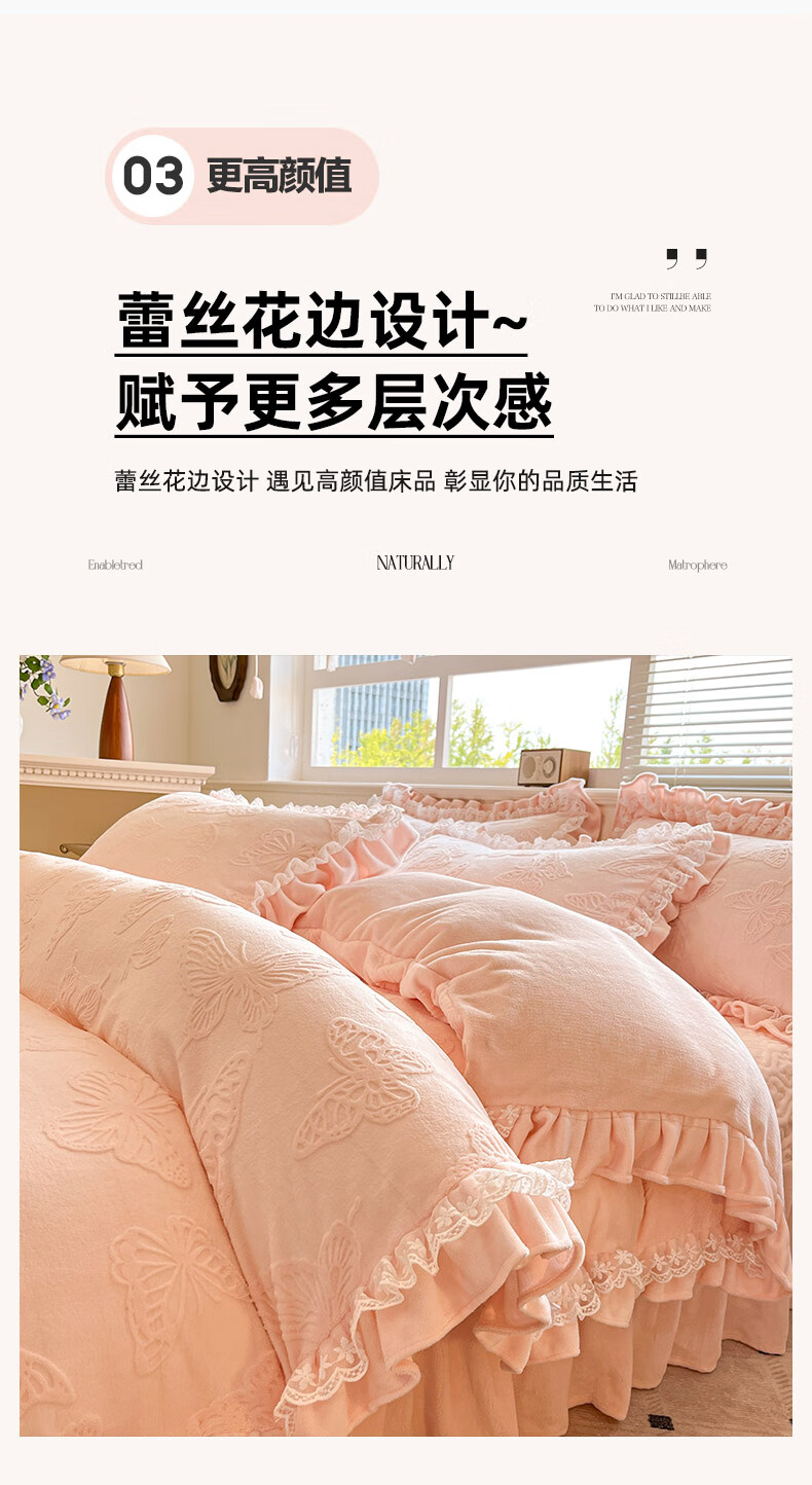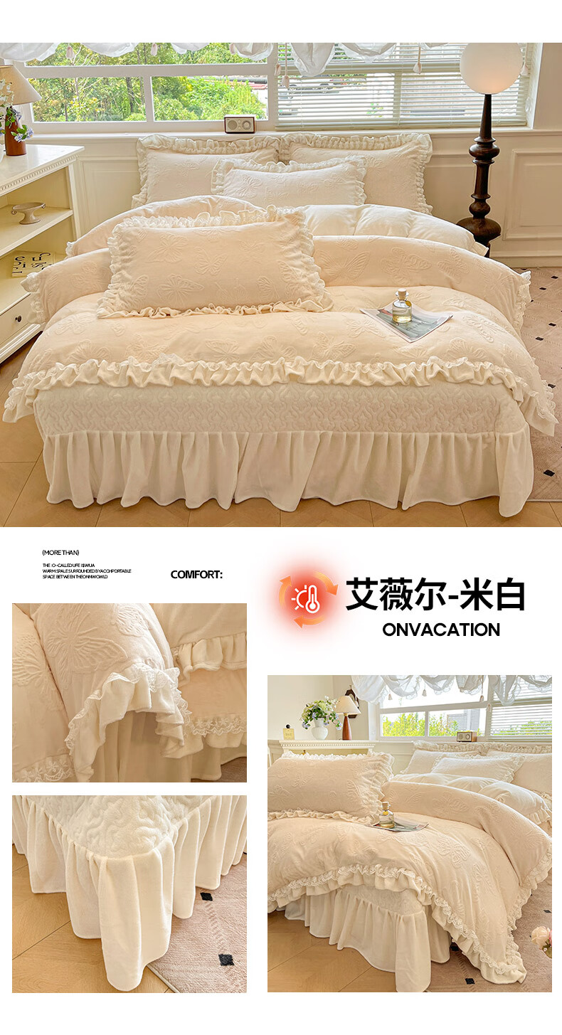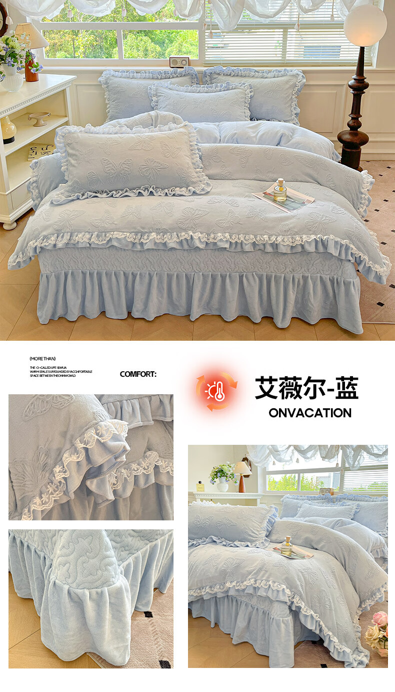 雕花牛奶绒床单款蕾丝边四件套 热情与温暖的综合体;A版雕花牛奶绒面料 B版牛奶绒面料 让保暖持续;蓬松柔软 足够抵御外界冷空气