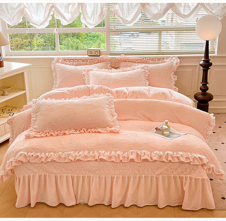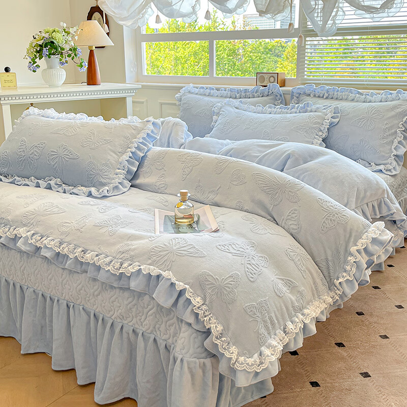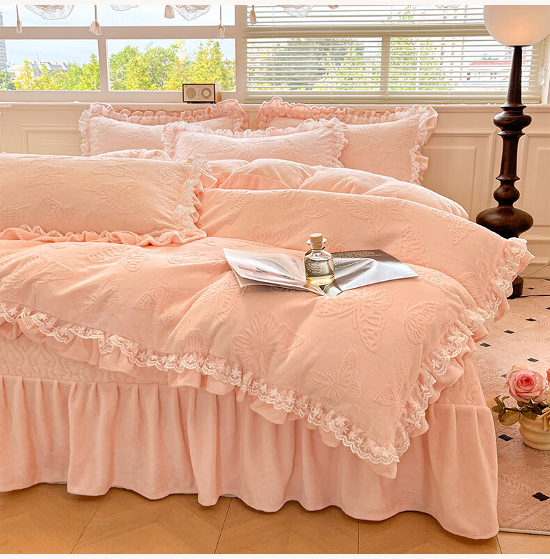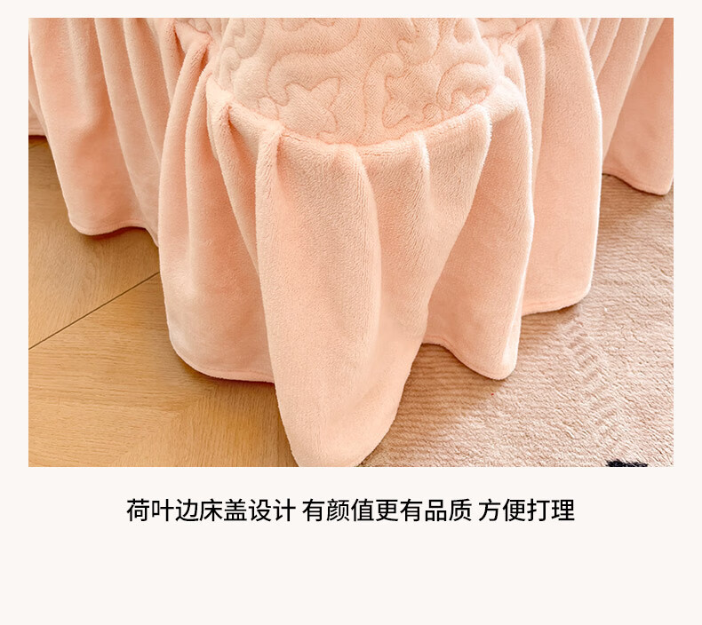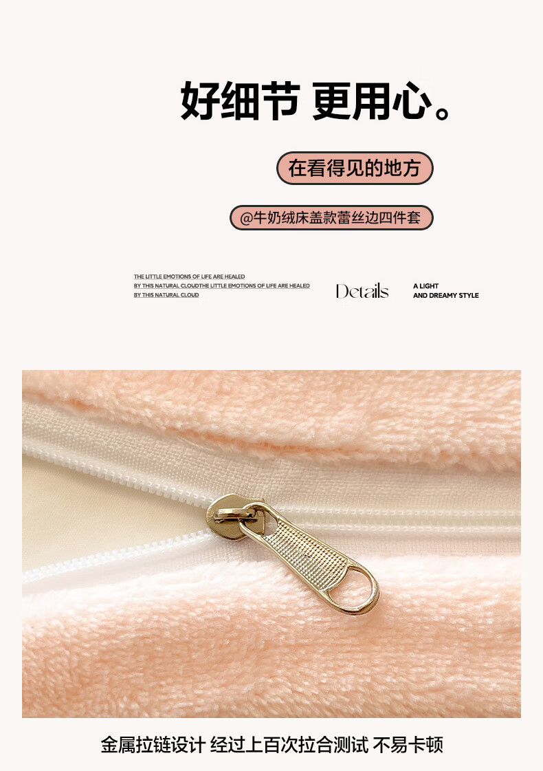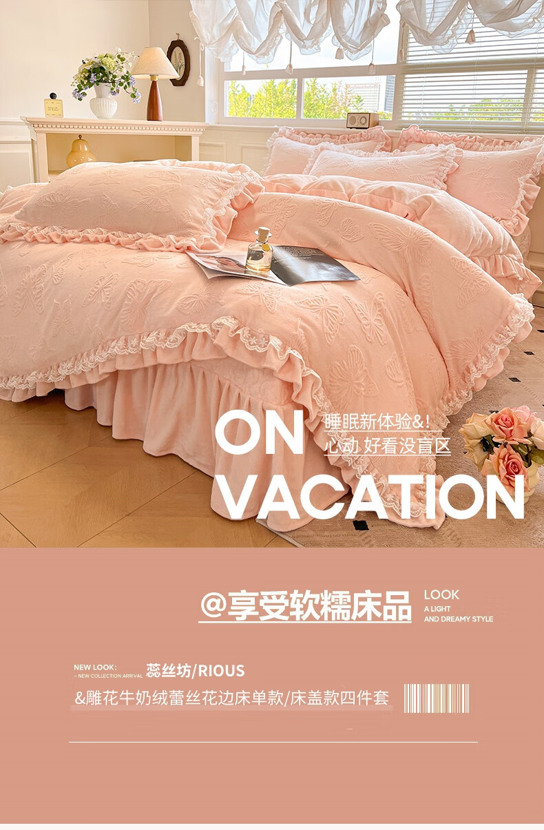 雕花牛奶绒床单款蕾丝边四件套 热情与温暖的综合体;A版雕花牛奶绒面料 B版牛奶绒面料 让保暖持续;蓬松柔软 足够抵御外界冷空气