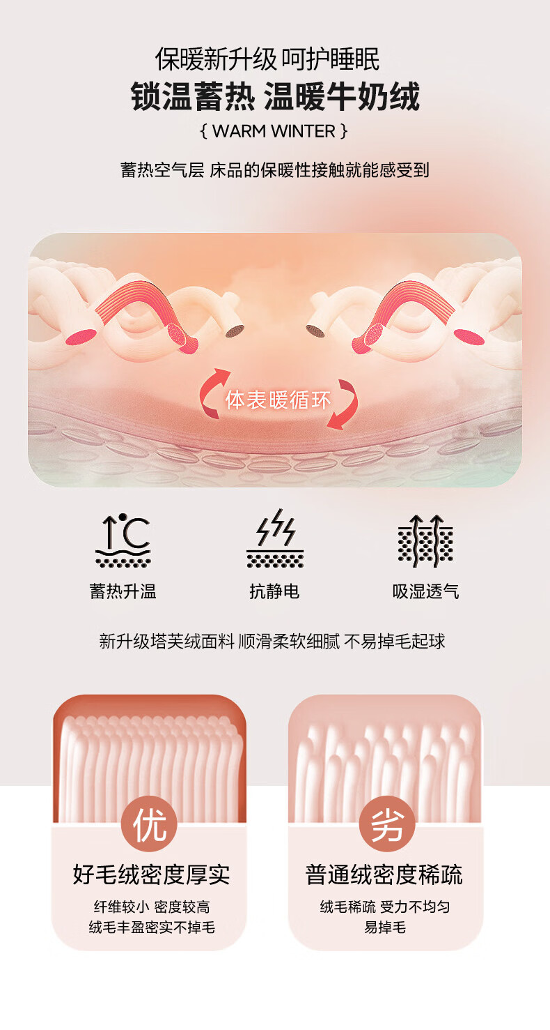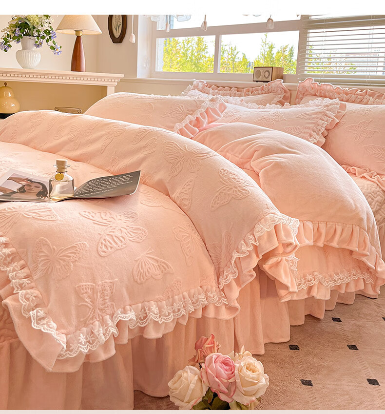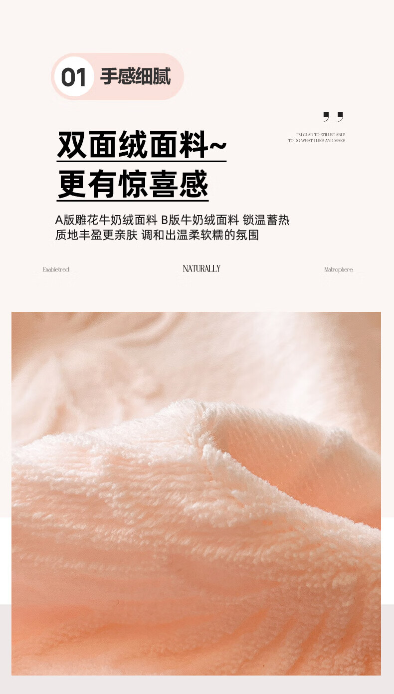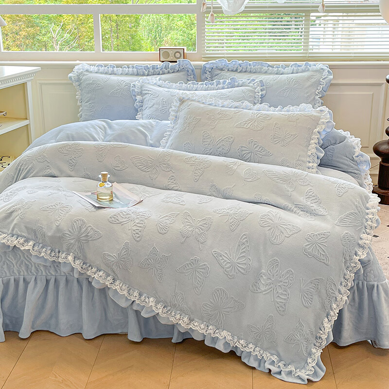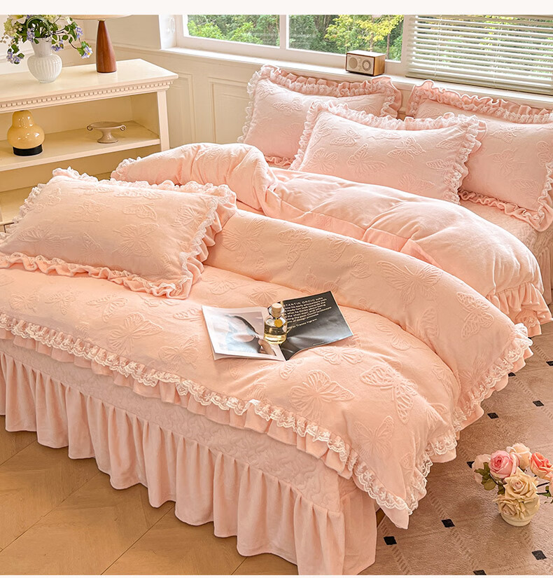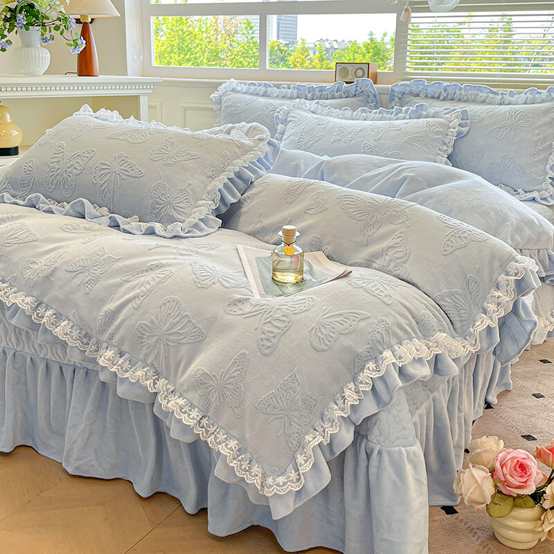 雕花牛奶绒床单款蕾丝边四件套 热情与温暖的综合体;A版雕花牛奶绒面料 B版牛奶绒面料 让保暖持续;蓬松柔软 足够抵御外界冷空气
