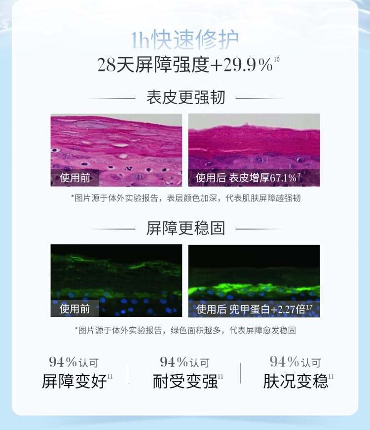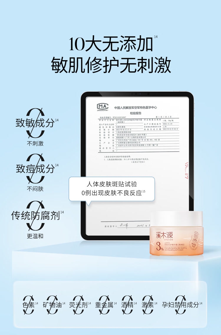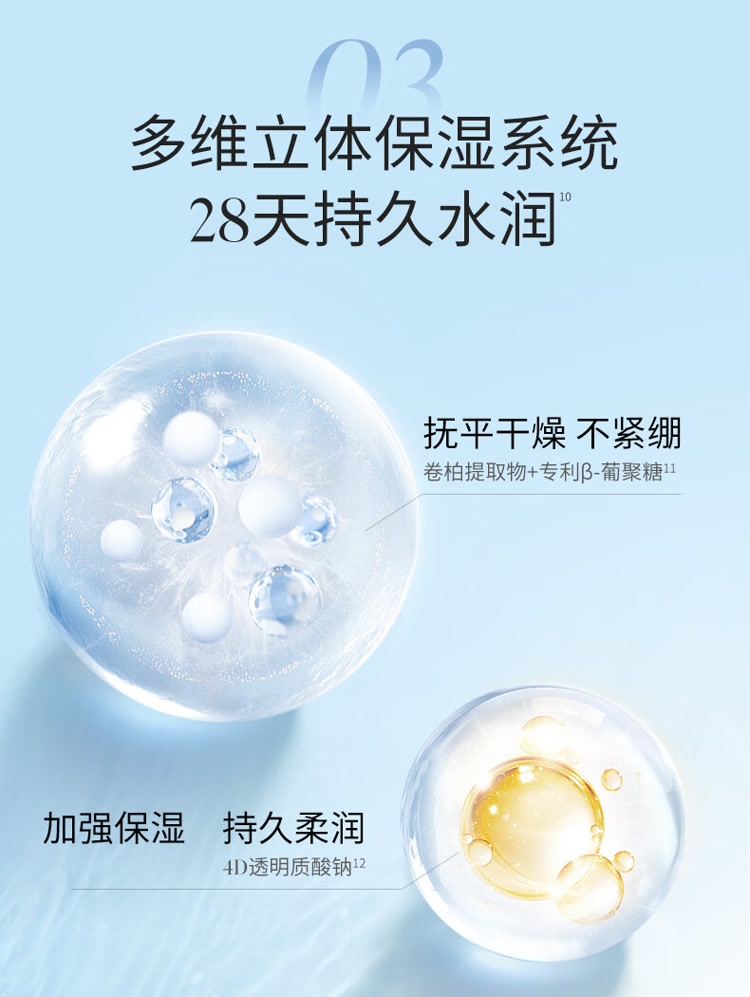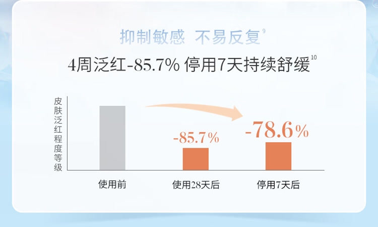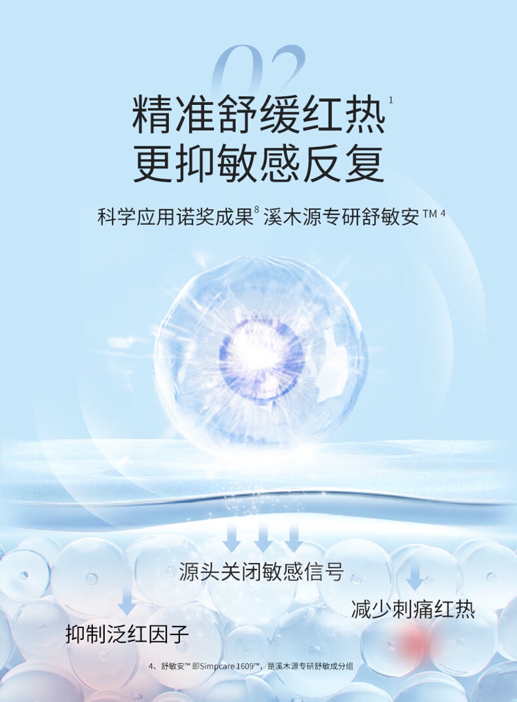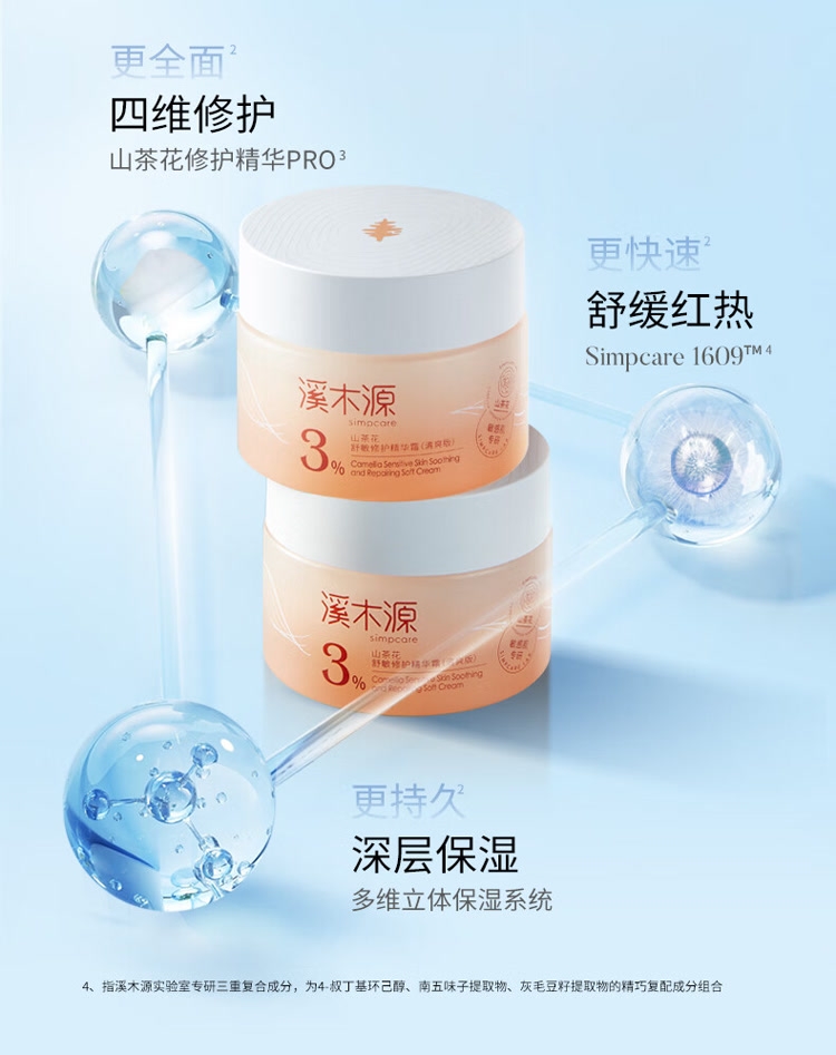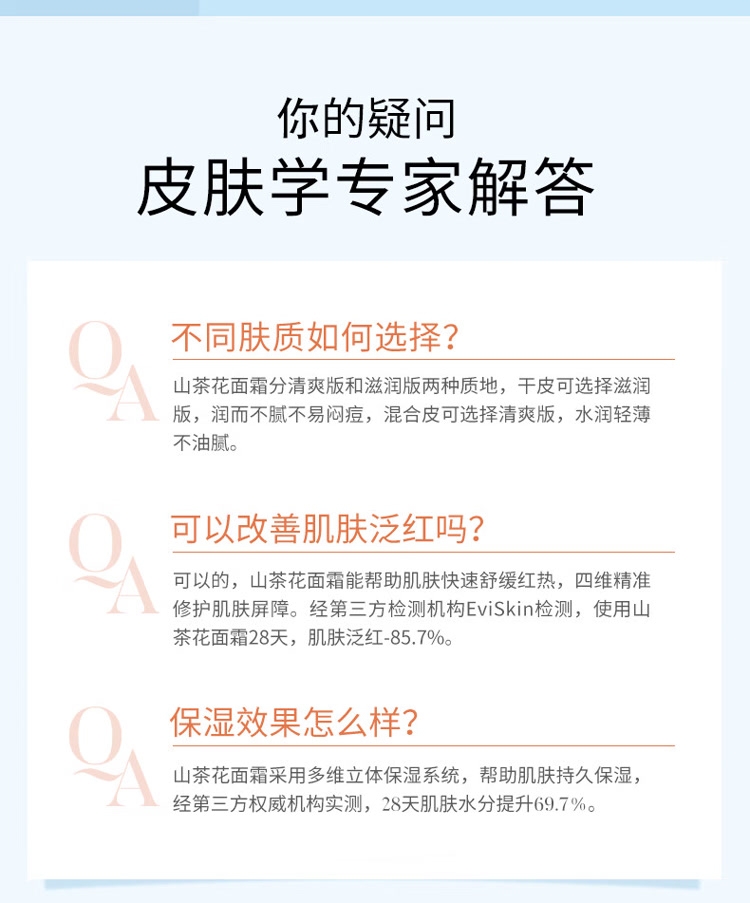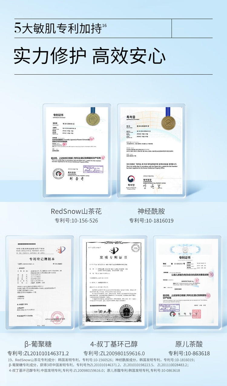 有效缓解肌肤泛红、灼热、发痒、刺痛等不适问题;实现快速补水和长效保湿;山茶花精萃有助于强韧肌肤屏障,改善肌肤脆弱敏感问题