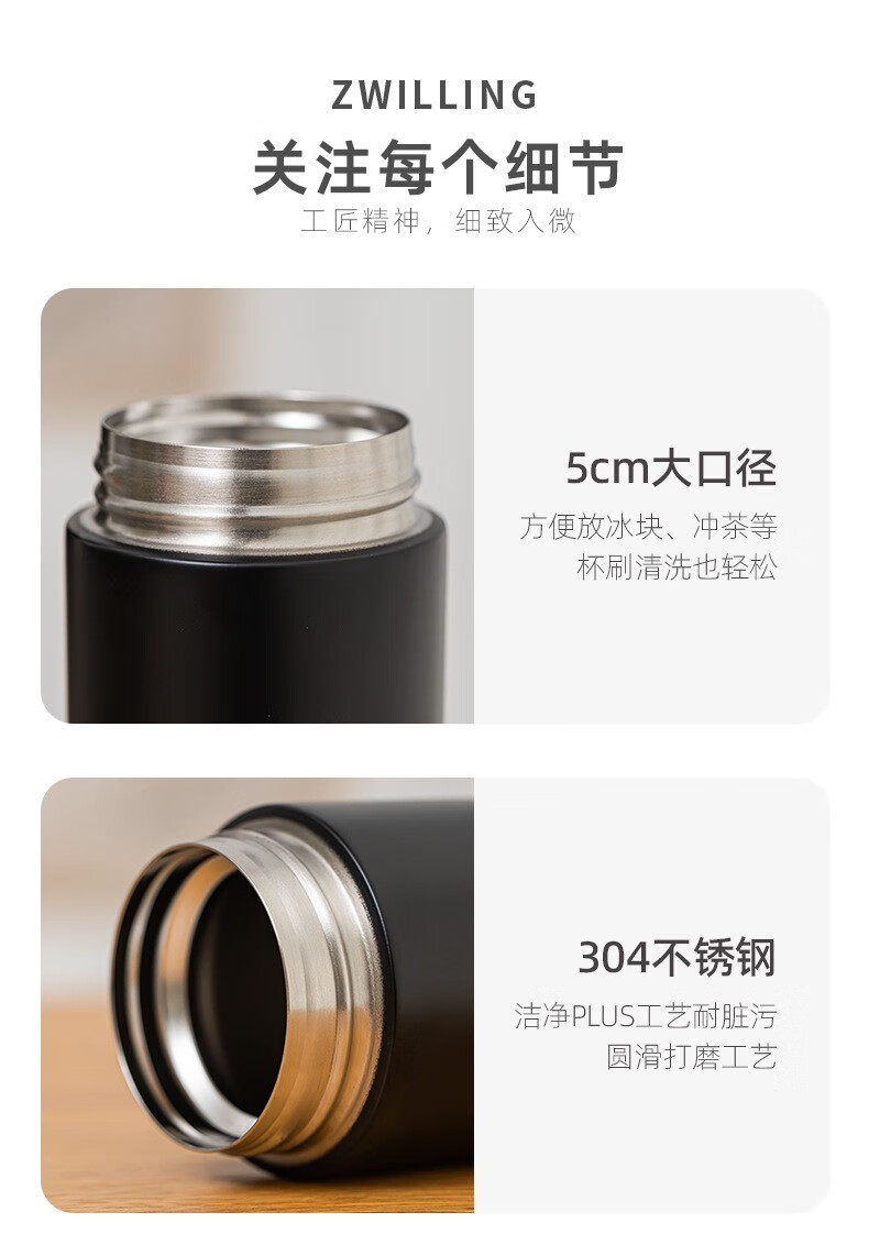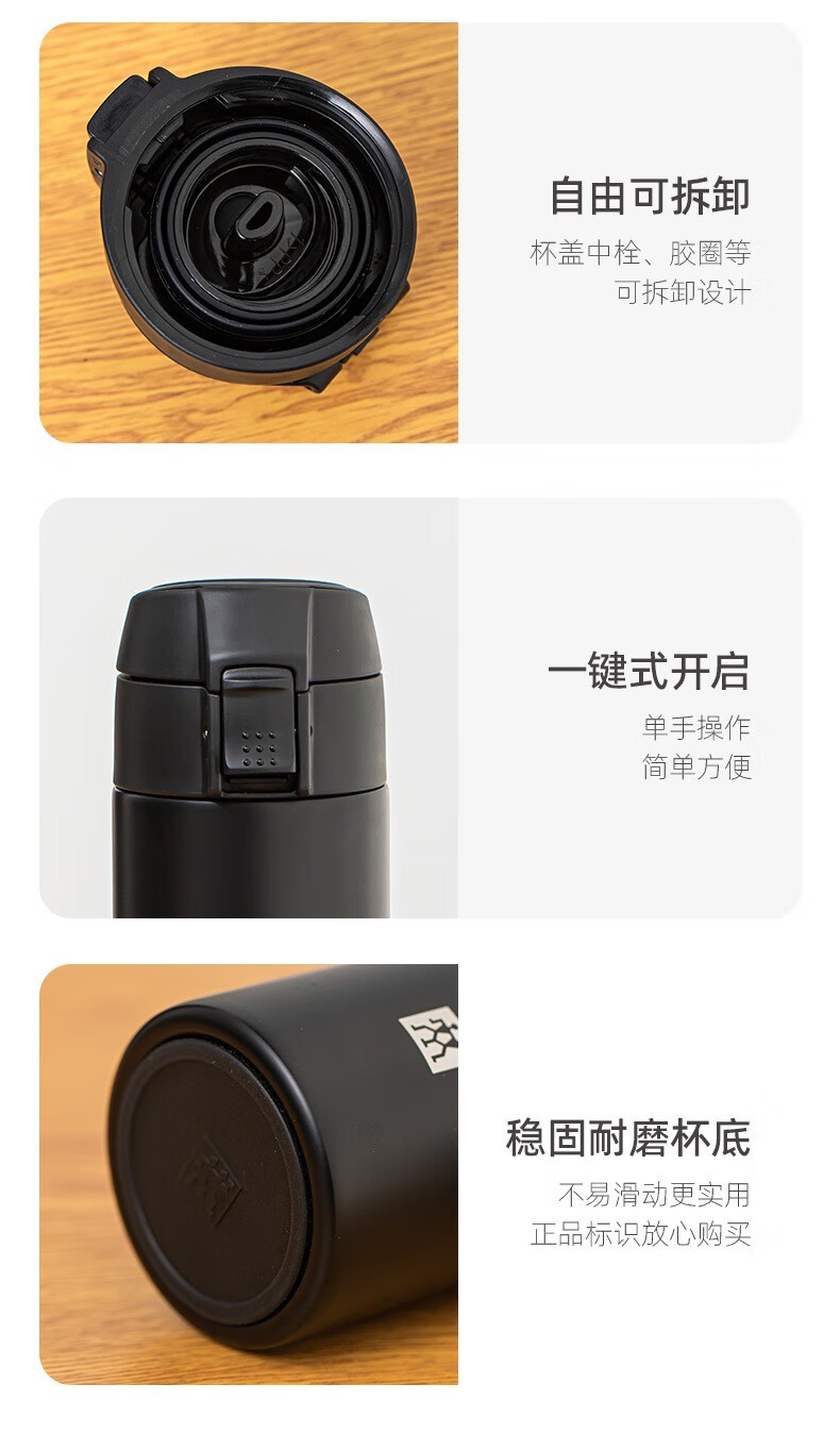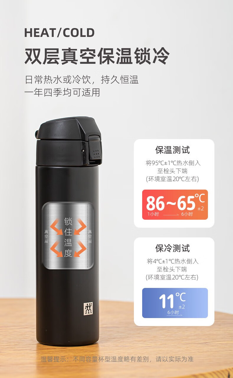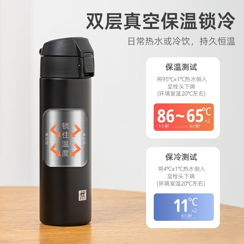 品质不锈钢材质,食品级安心;双层真空杯身,保温保冷;单手按键即开,方便饮用