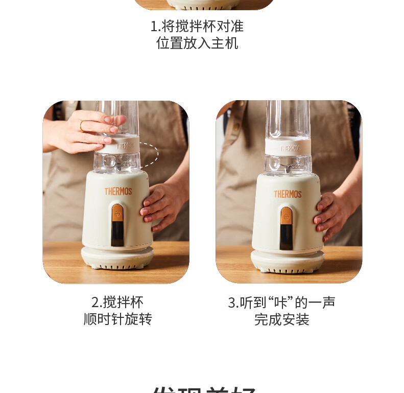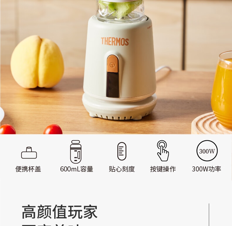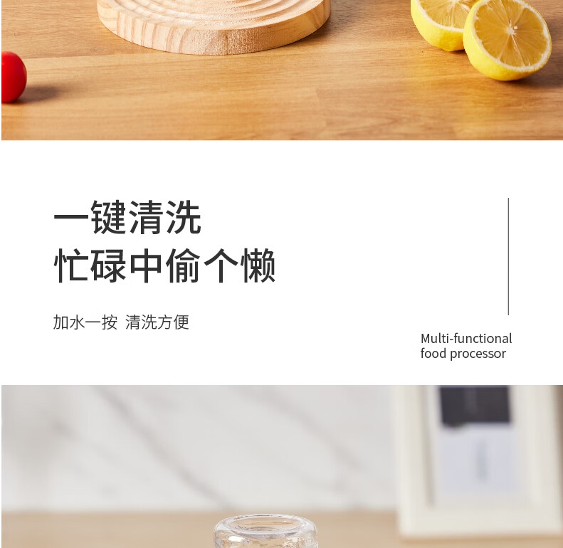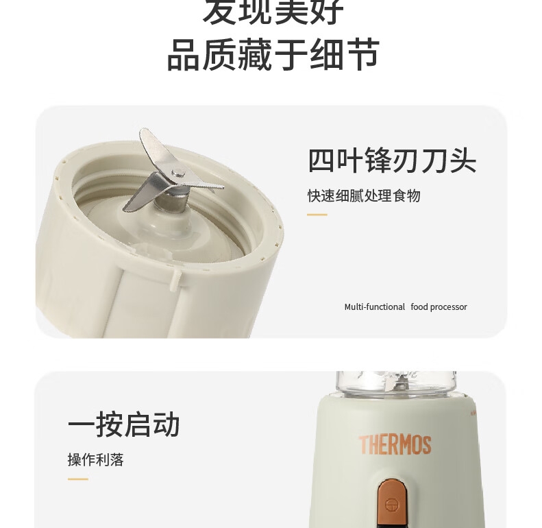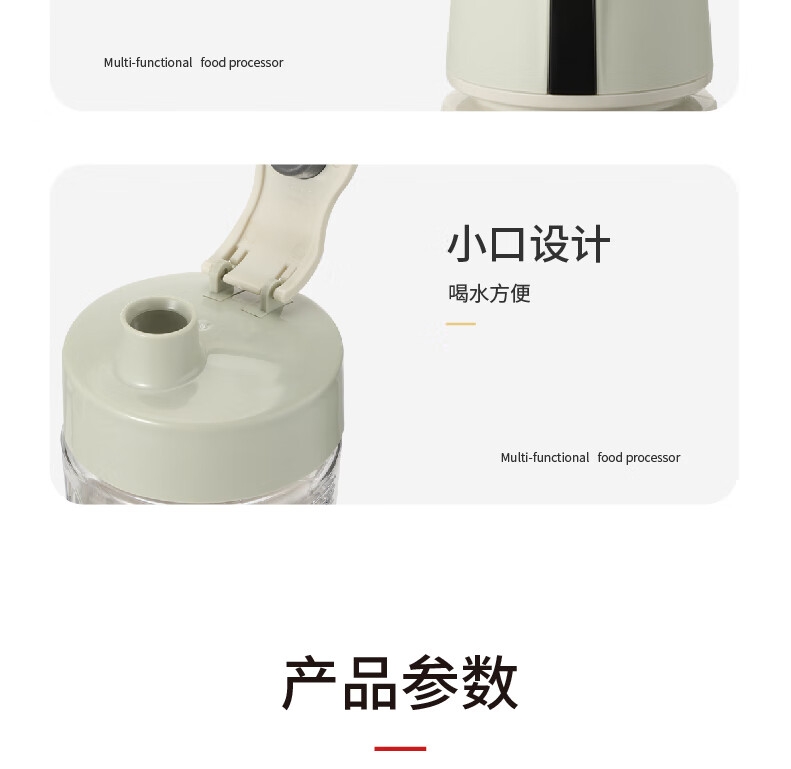 配600ml搅拌杯,携带方便;四叶锋刃刀头快速细腻处理食物;底盘盘线功能,收纳便携;一键启动,操作利落