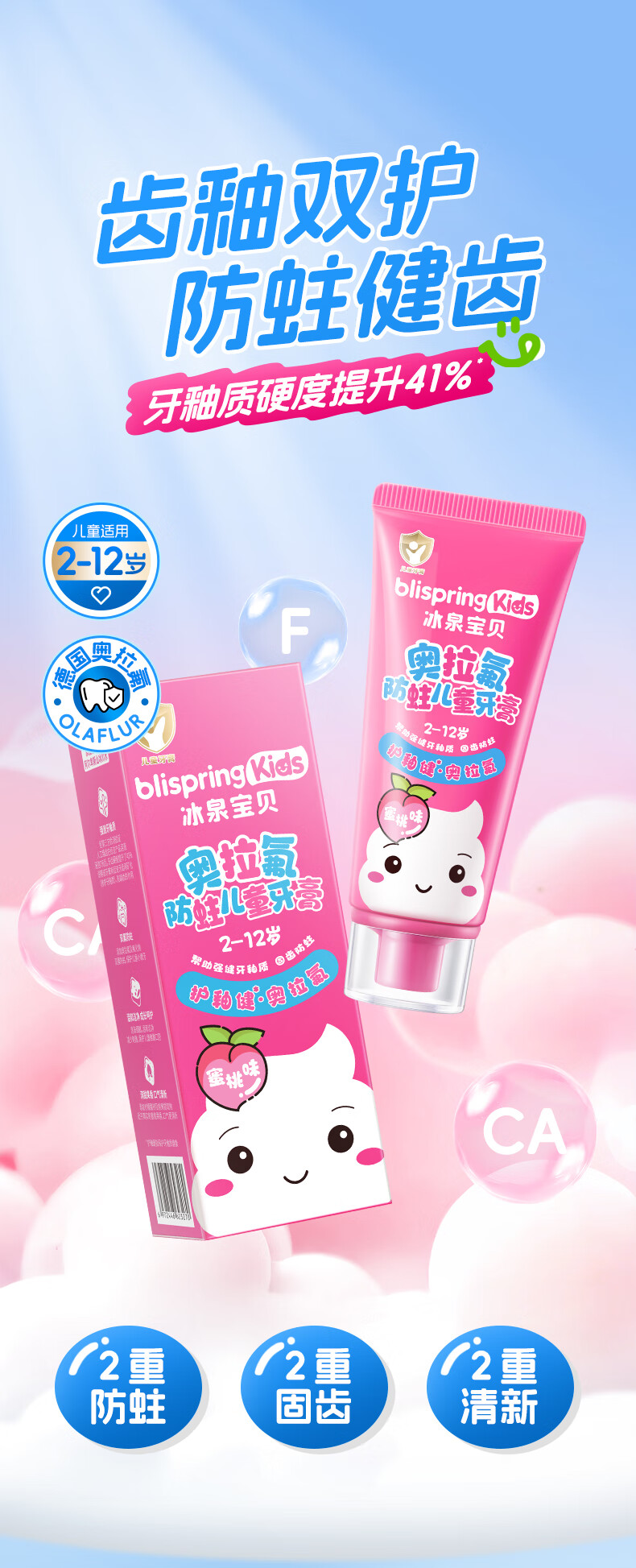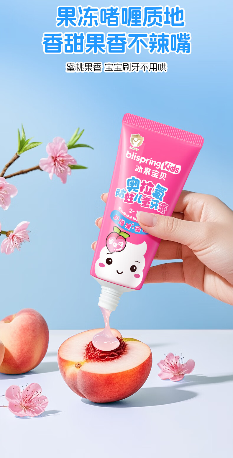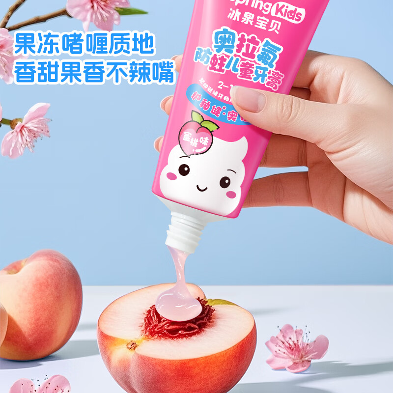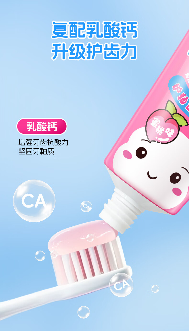 低泡温和深入清洁不刺激;蜜桃果香宝宝刷牙不用哄;专业质检,安心防蛀健齿