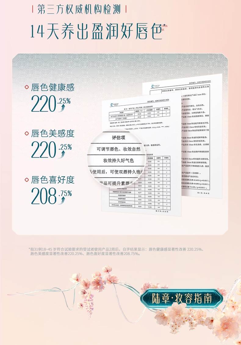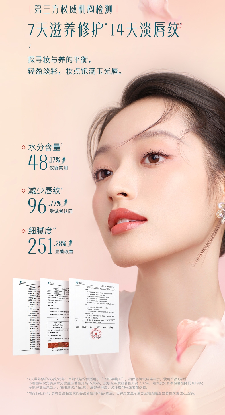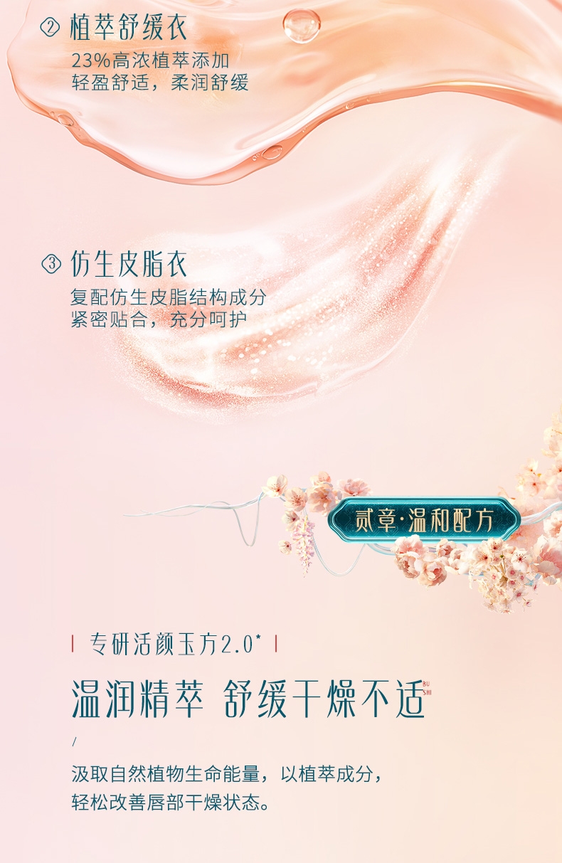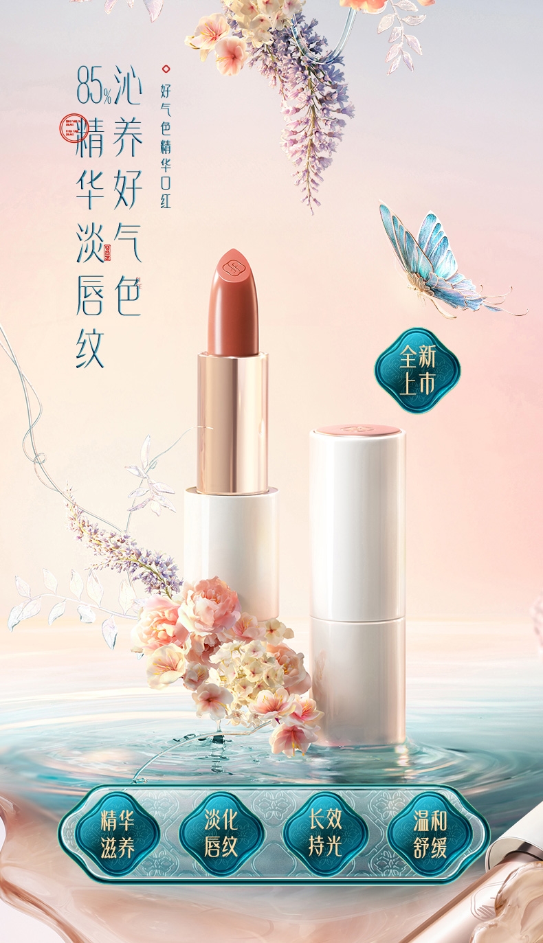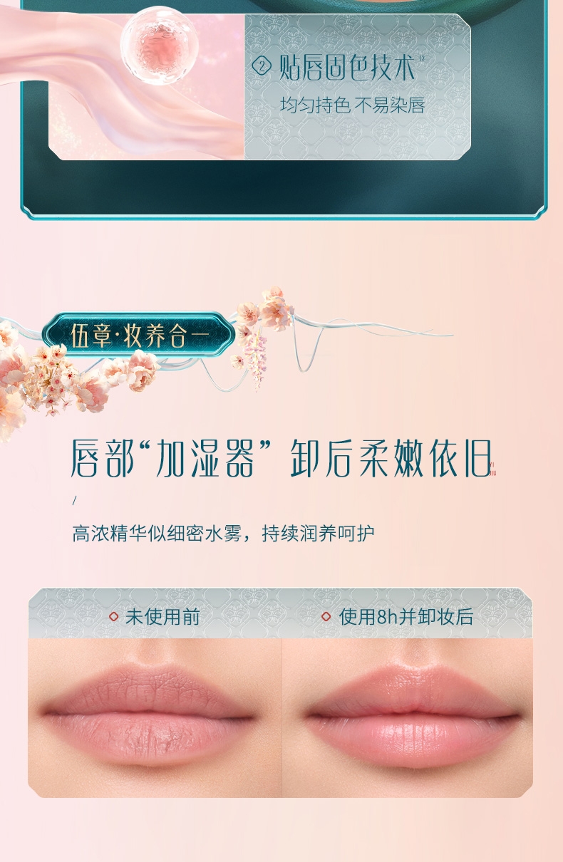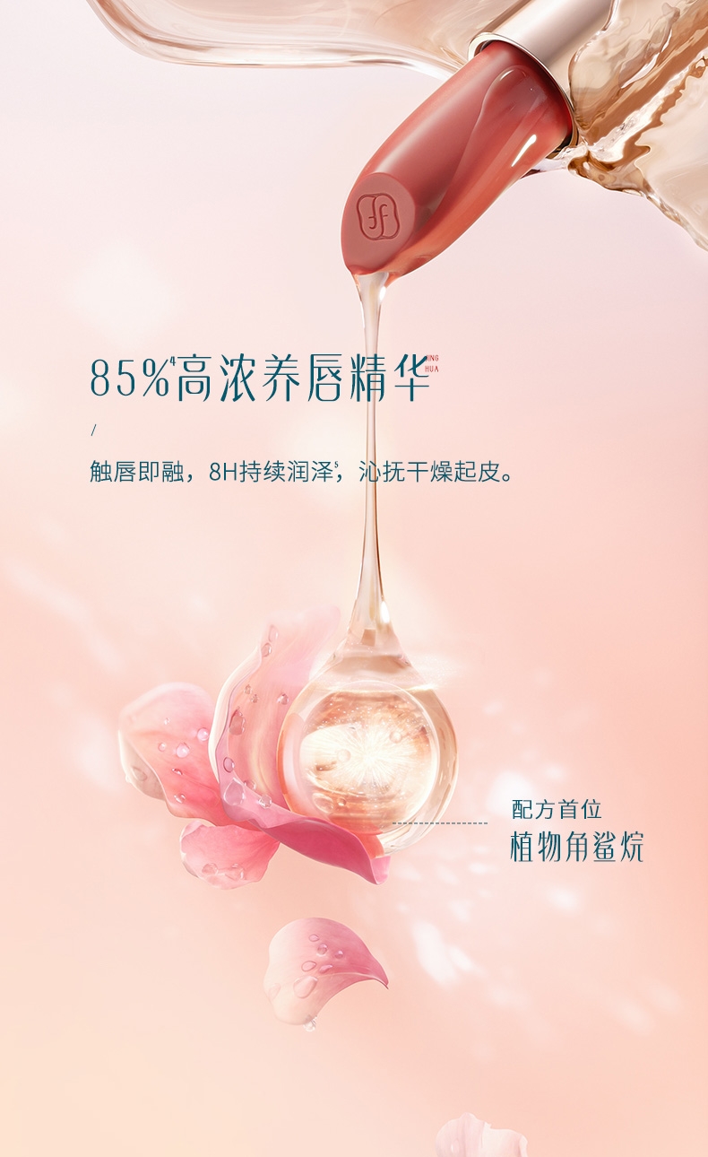 深层滋养唇部,防止水分流失,保持唇部水润丰盈;质地如贵妇精华般丝滑,上唇后轻盈舒适,无厚重感;外壳采用粉白渐变的磁吸金属材质,质感十足,精致高级