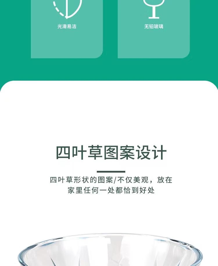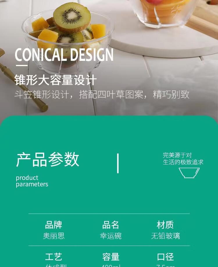 斗笠锥形设计,搭配四叶草图案,精巧别致;碗口圆润自然,线条细腻,质地厚实;四叶草形状的图案/不仅美观,放在家里恰到好处