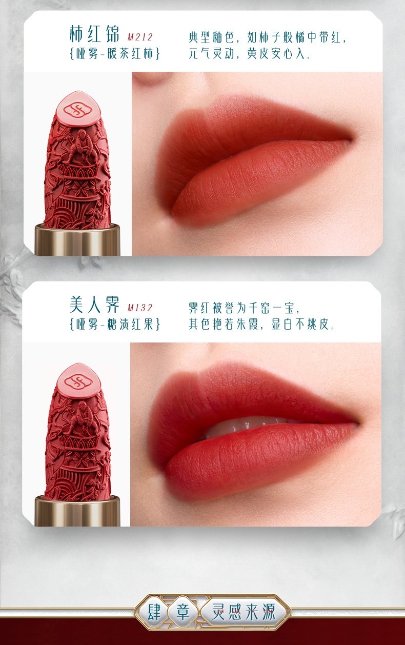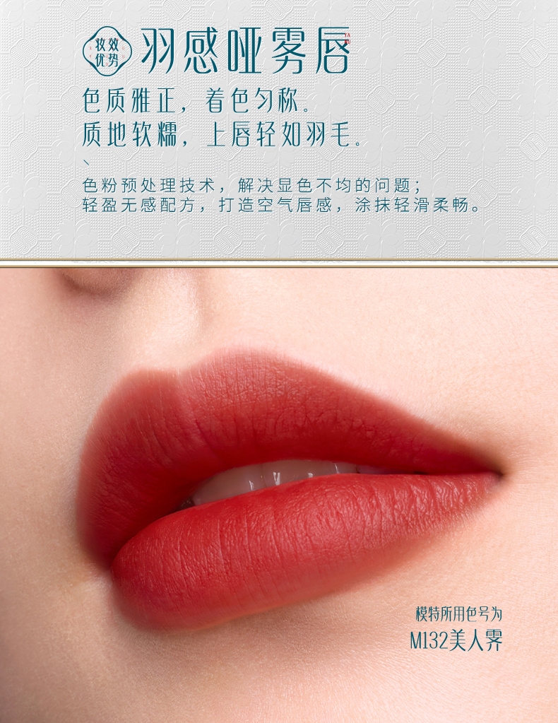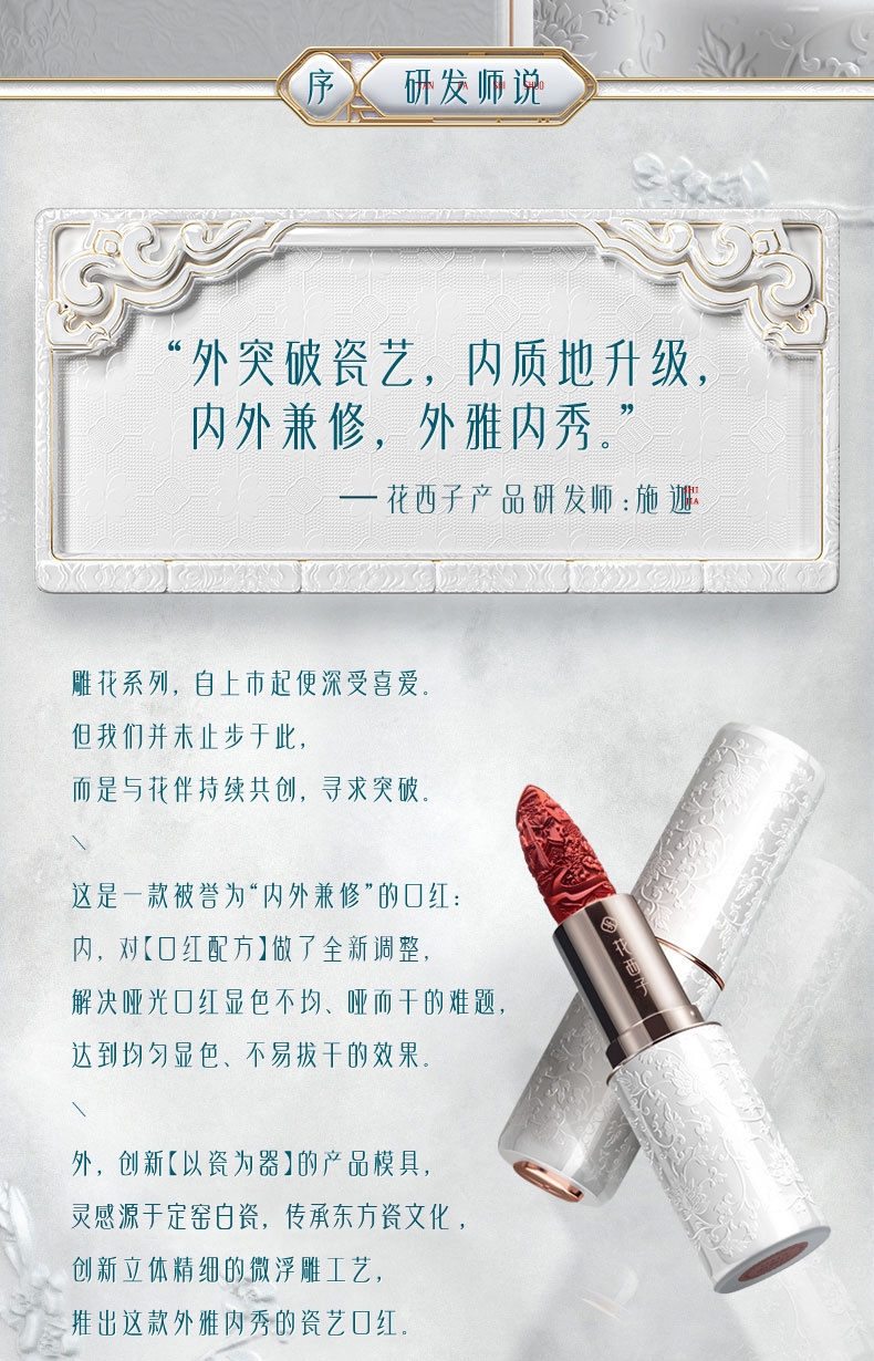 采用复刻宋窑白瓷工艺,管身触感温润;色调明媚不荧光,充满春日氛围感;色彩饱和度高,涂抹后能持久保持鲜艳度,不易脱妆