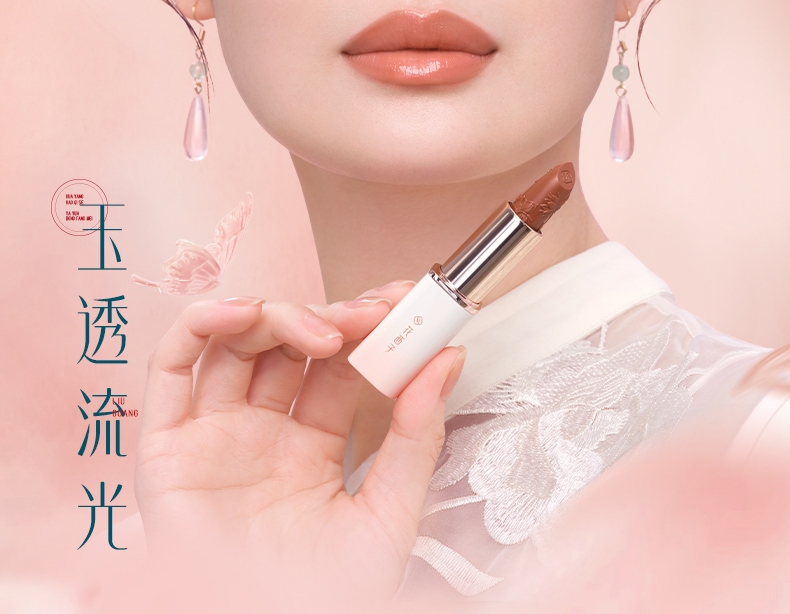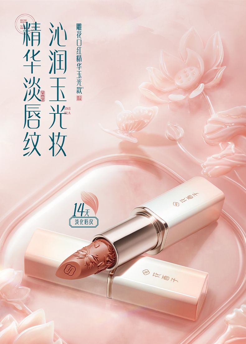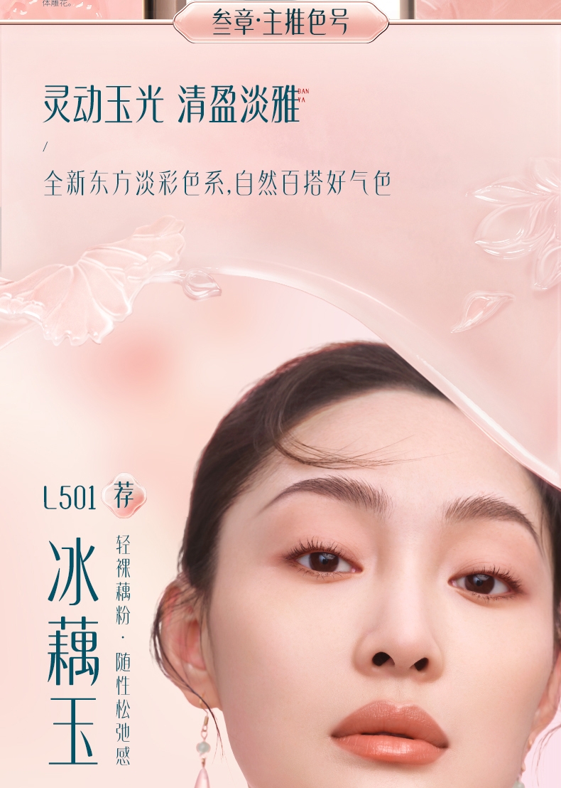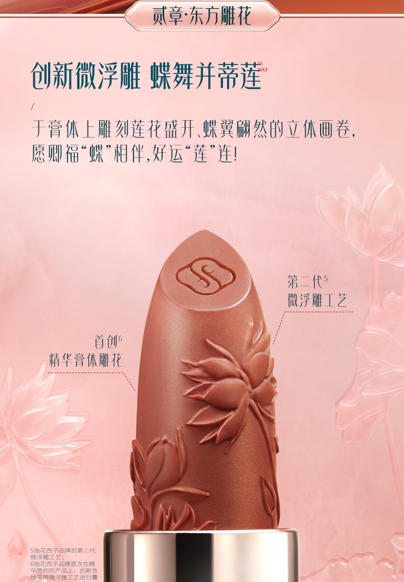 膏体采用微雕工艺,雕刻着莲花、蝶翼等立体图案;色号呈现细闪粉调,薄涂自然提气色;无论是白皮、黄皮还是黄黑皮,都能轻松驾驭,展现自然