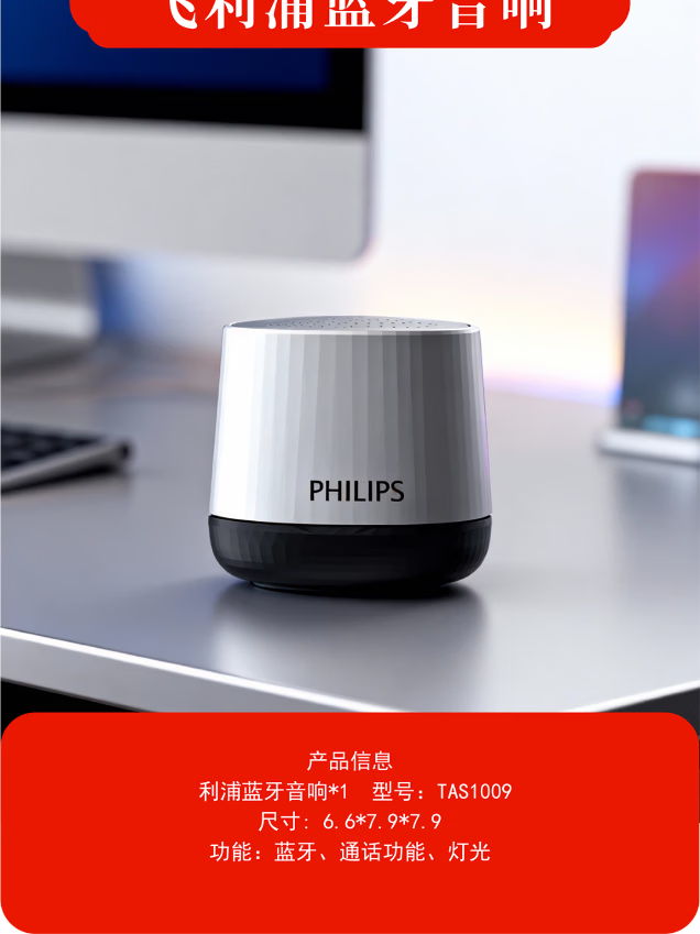 飞利浦蓝牙音响:型号:TAS1009 尺寸: 6.6*7.9*7.9 功能:蓝牙、通话功能、灯光