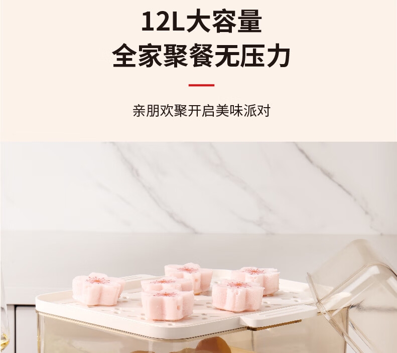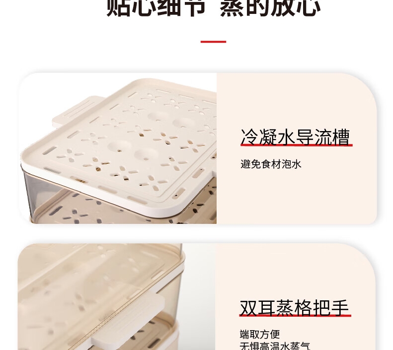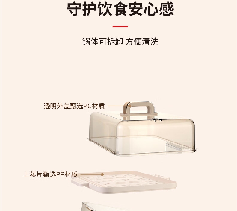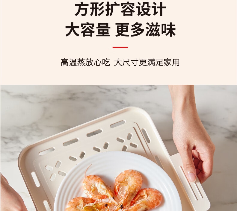 12L大容量,双层组合,可蒸整鱼/整鸡;800W大功率发热盘,聚能结构,快速出蒸汽;可拆卸的PC蒸罩和PP蒸盘,烹饪过程可视化;定时器简易操作,蒸煮时间自由设置。;内置接水盘,脏水净水分离好清洗