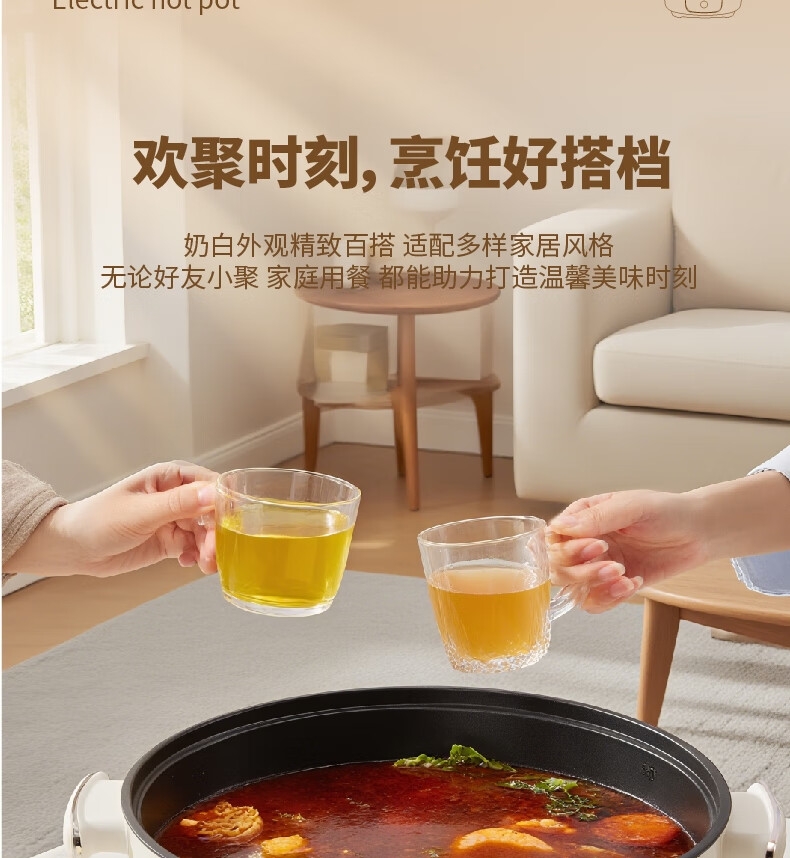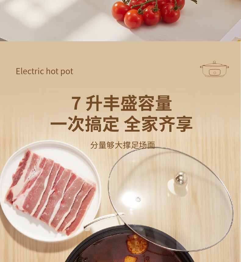 新型外观,时尚高档。机线分离,轻松收纳不沾地。;7L大容量,宴客聚餐不用愁。;食品级不粘涂层,易清洗。;火力可调节,双重安全保护。;可视玻璃盖,烹饪过程一目了然。