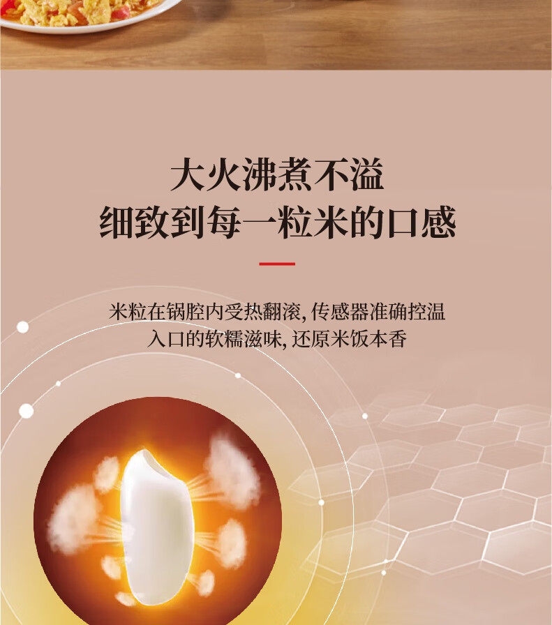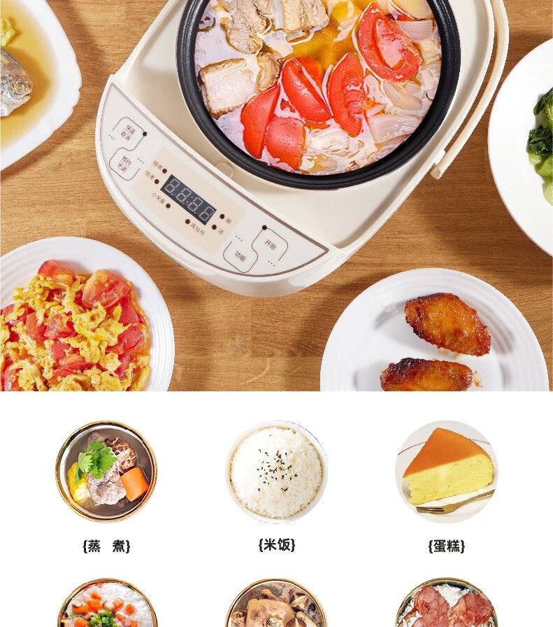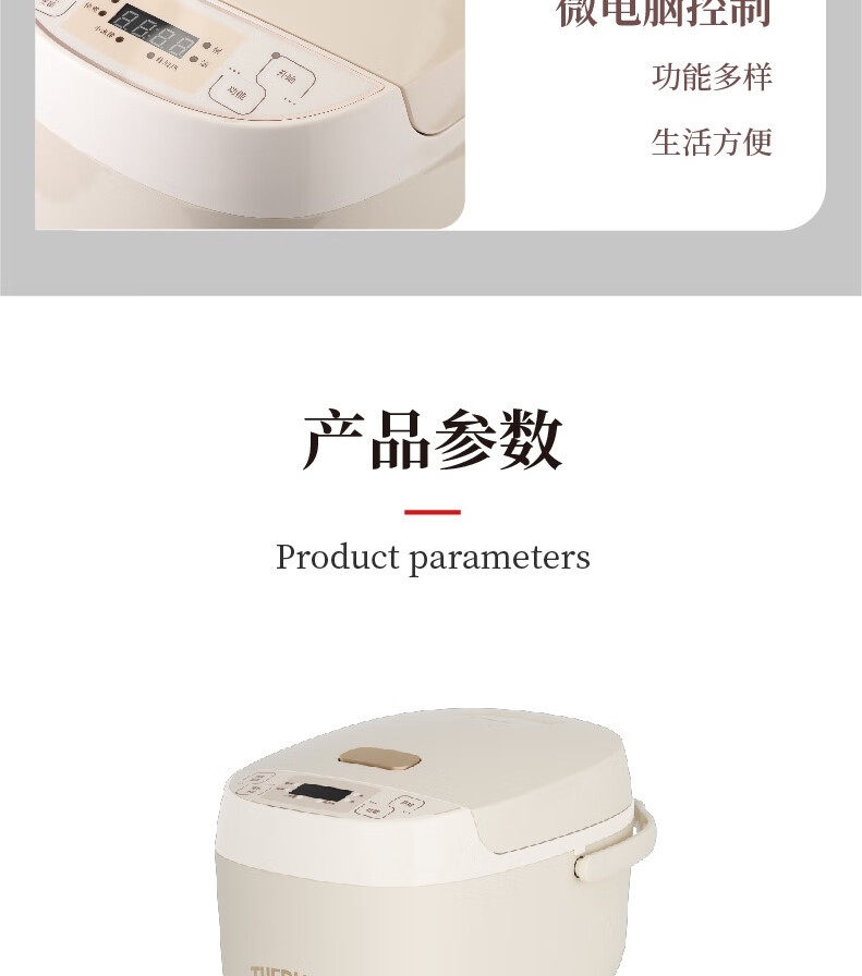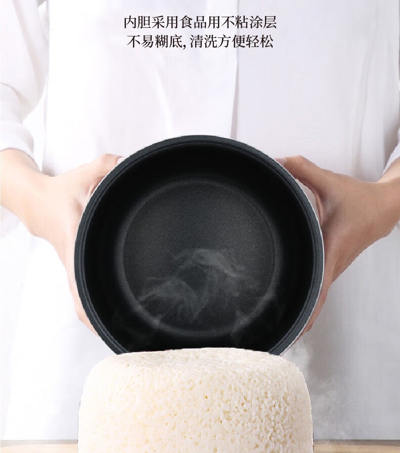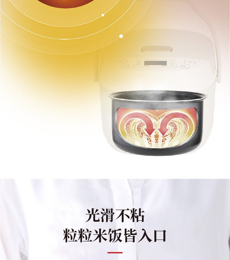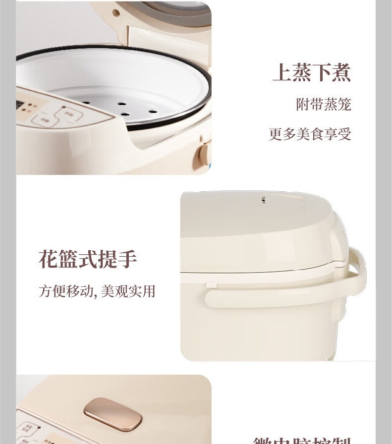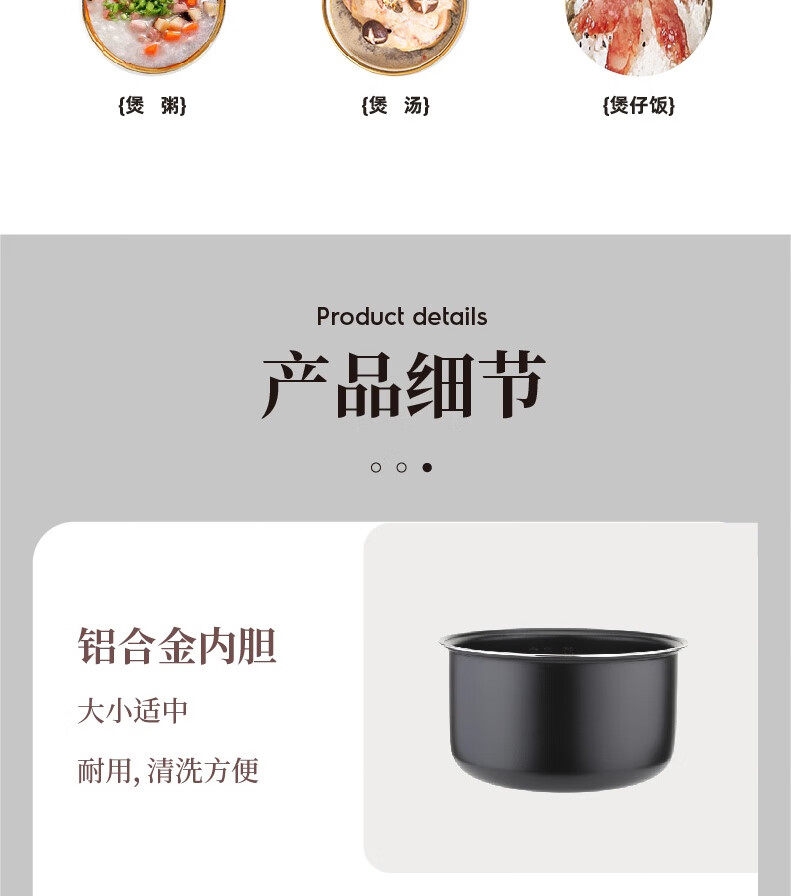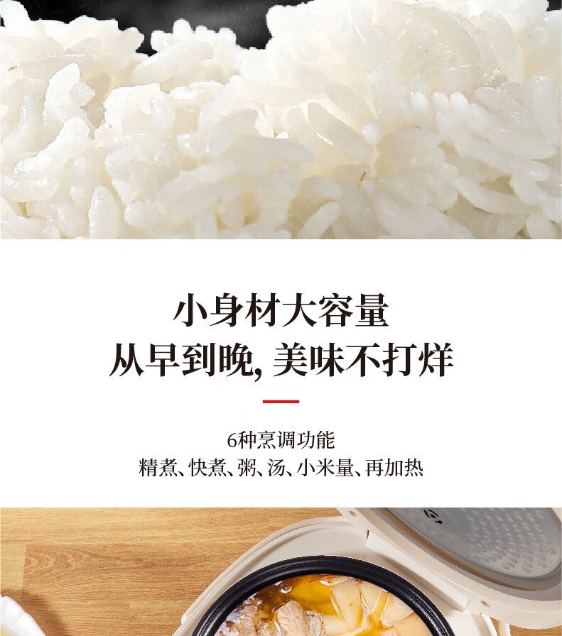 3L容量,大小适中,适合3-4口之家使用;6种烹调功能:精煮、快煮、粥、汤、小米量、再加热; 易洁涂层内胆,容易清洗