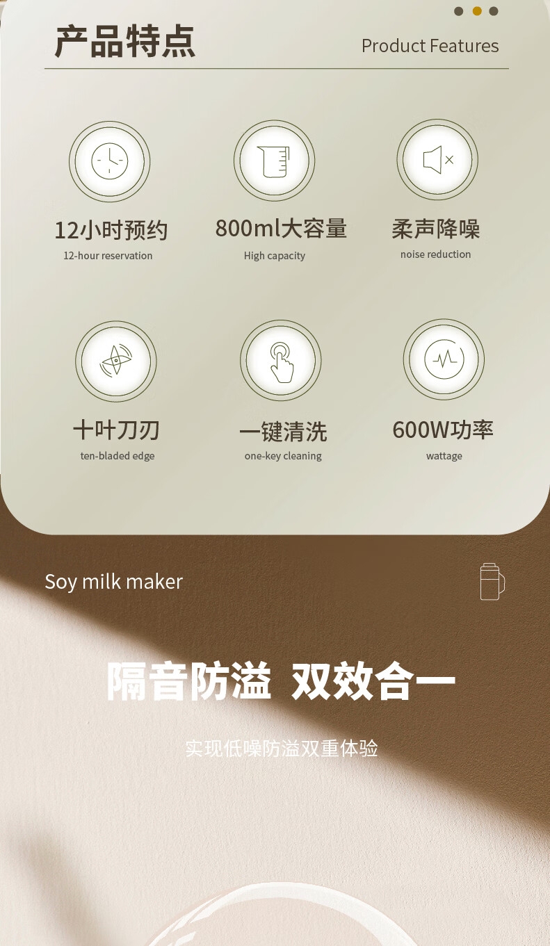 800ml容量, 满足3-4人畅饮;双层降噪防益设计,一键清洗功能;微电脑智能控制, 10叶精钢刀刃;1-12小时预约,醒来就能喝上热饮。