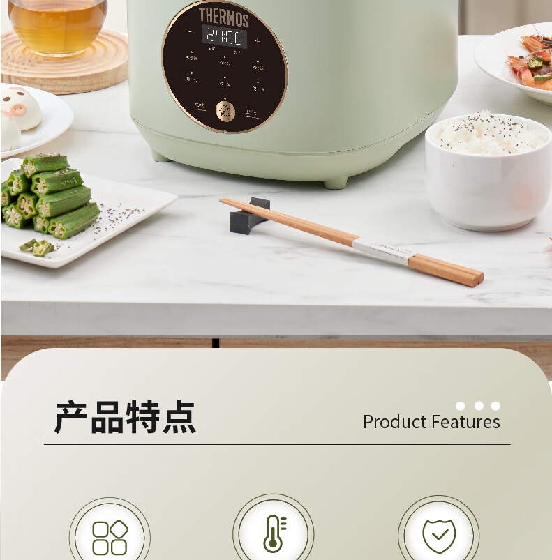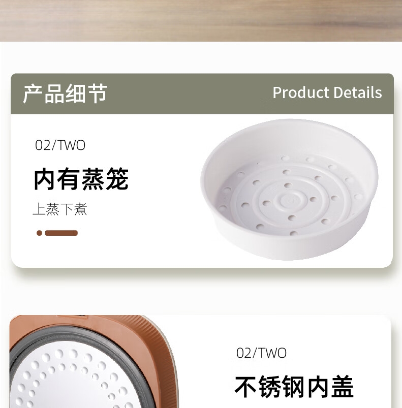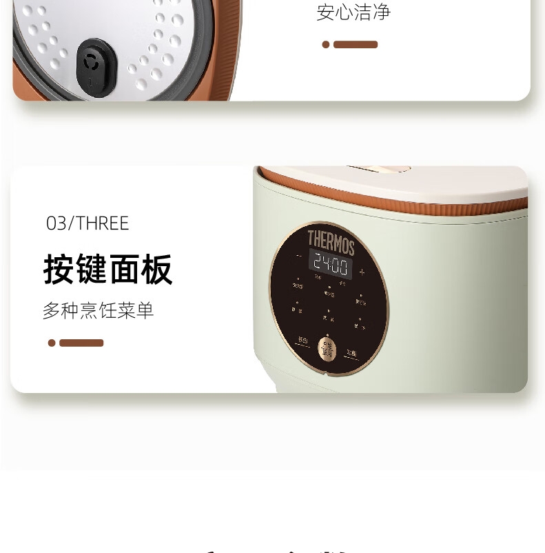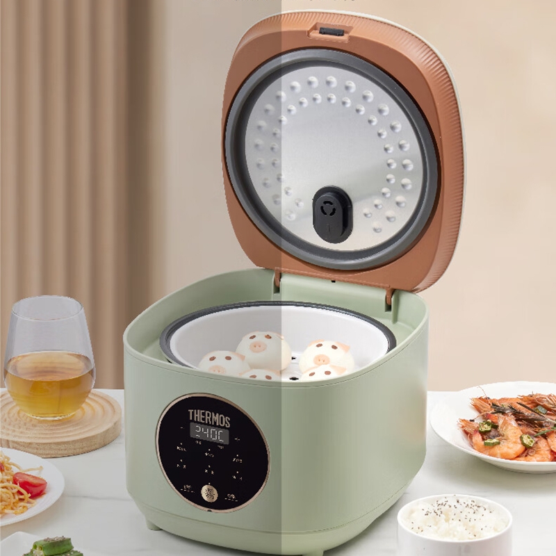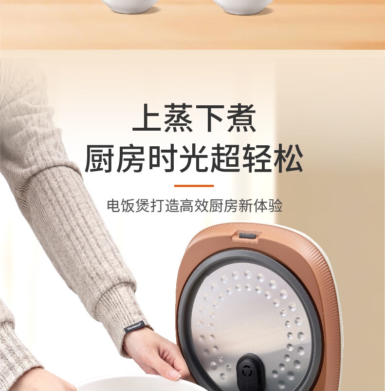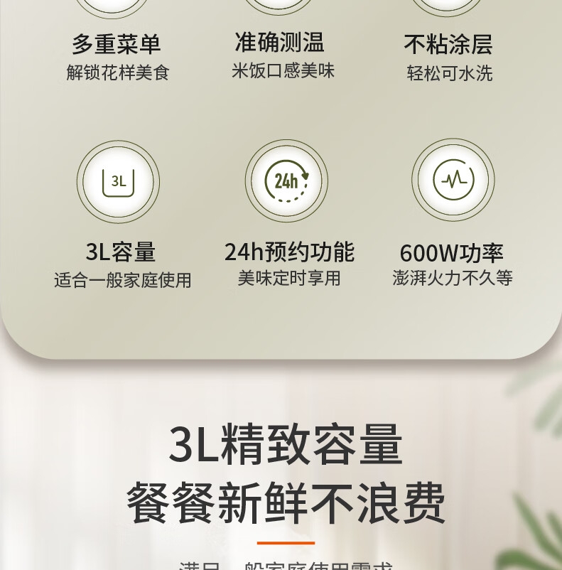 创新薄盖造型,纤薄美观精致;多种功能设计,满足日常需求;600W大功率,即享香喷米饭;智能感温探头,煮饭专业不溢锅;金属机身,百搭厨房显高端