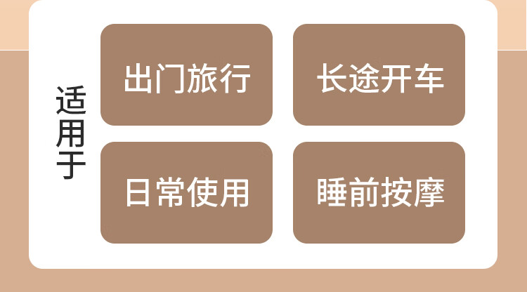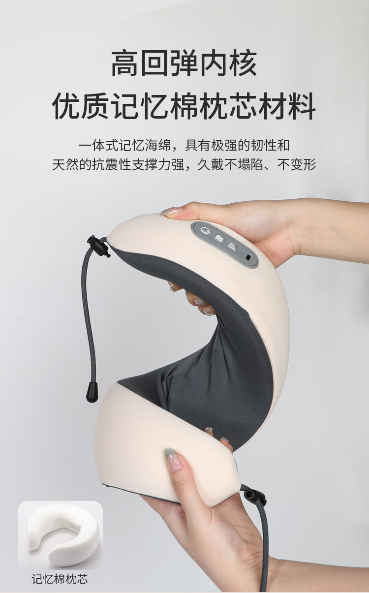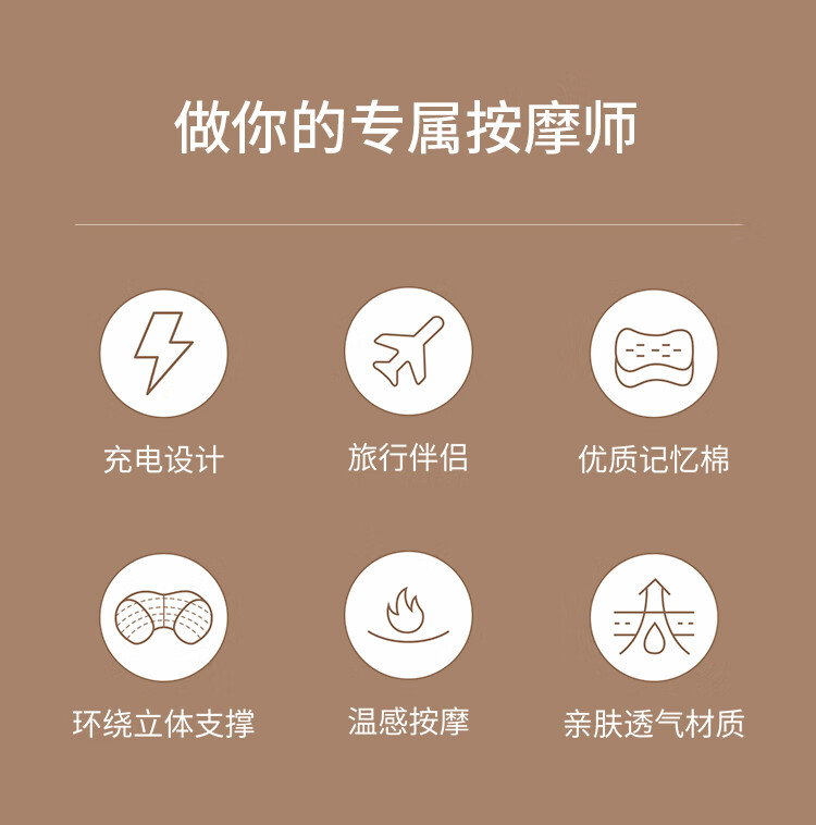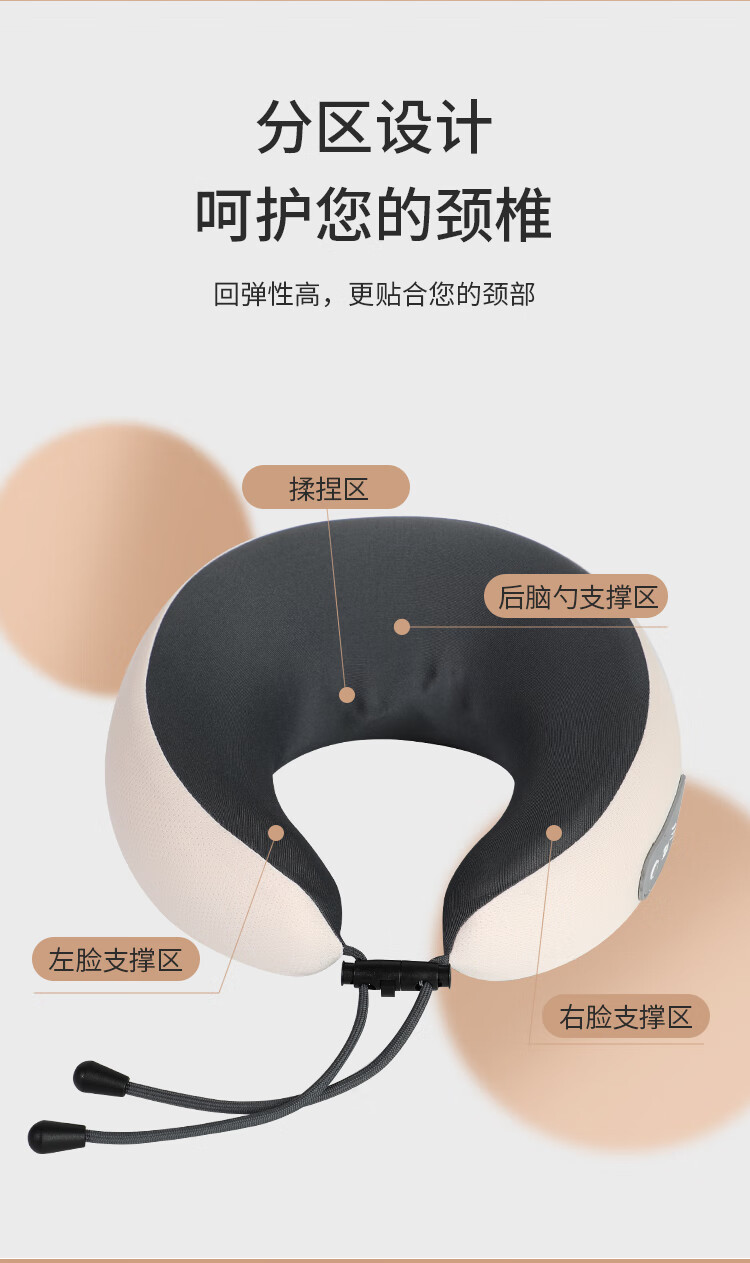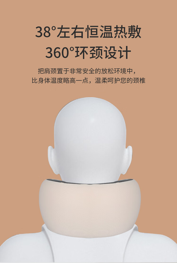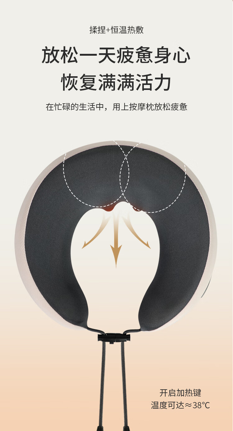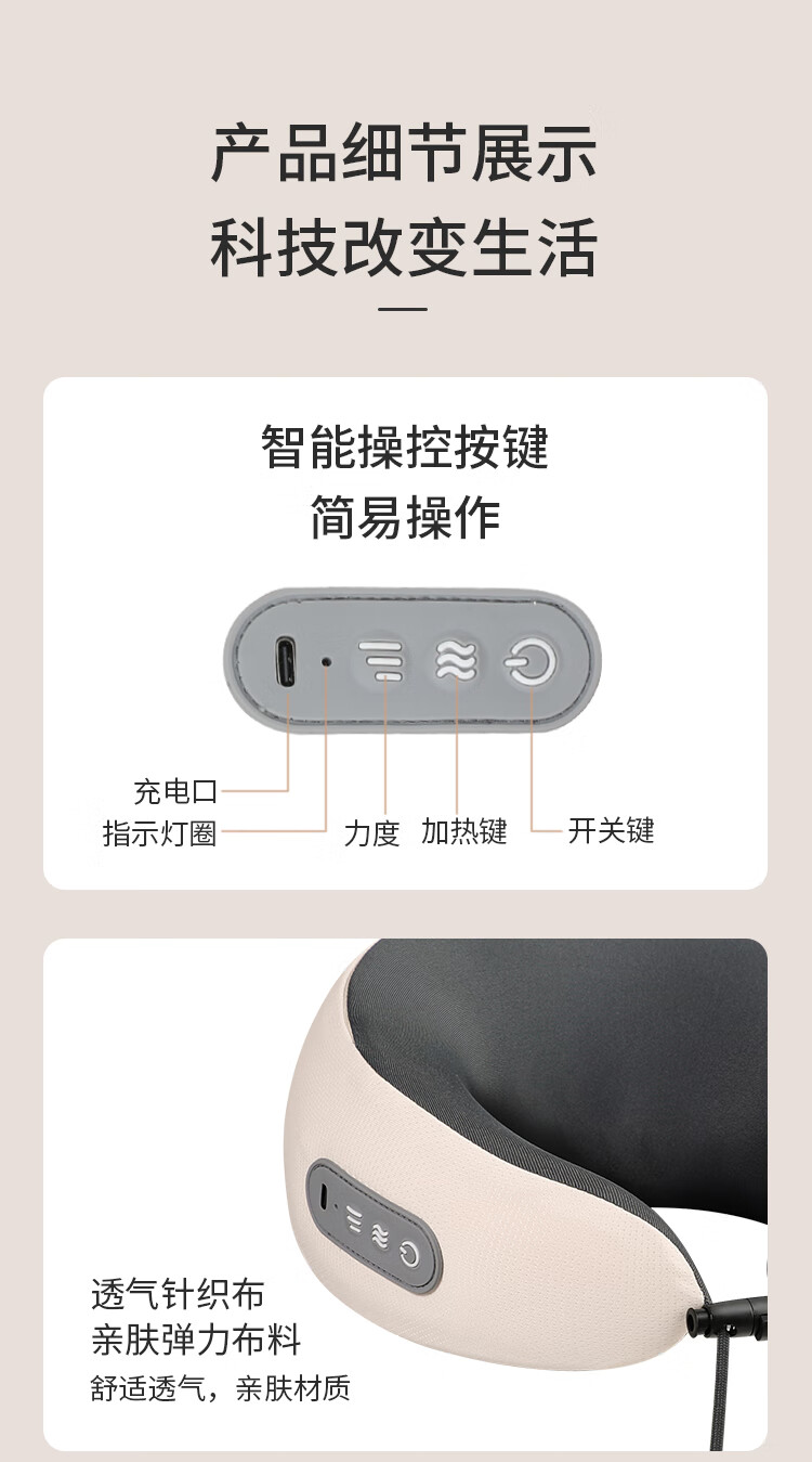 时尚外观,无线便携设计;一键电源开关启动,大容量电池;布套材质:透气针织布+菜卡料,亲肤更柔和;360°揉捏按摩,红光照射及加热功能