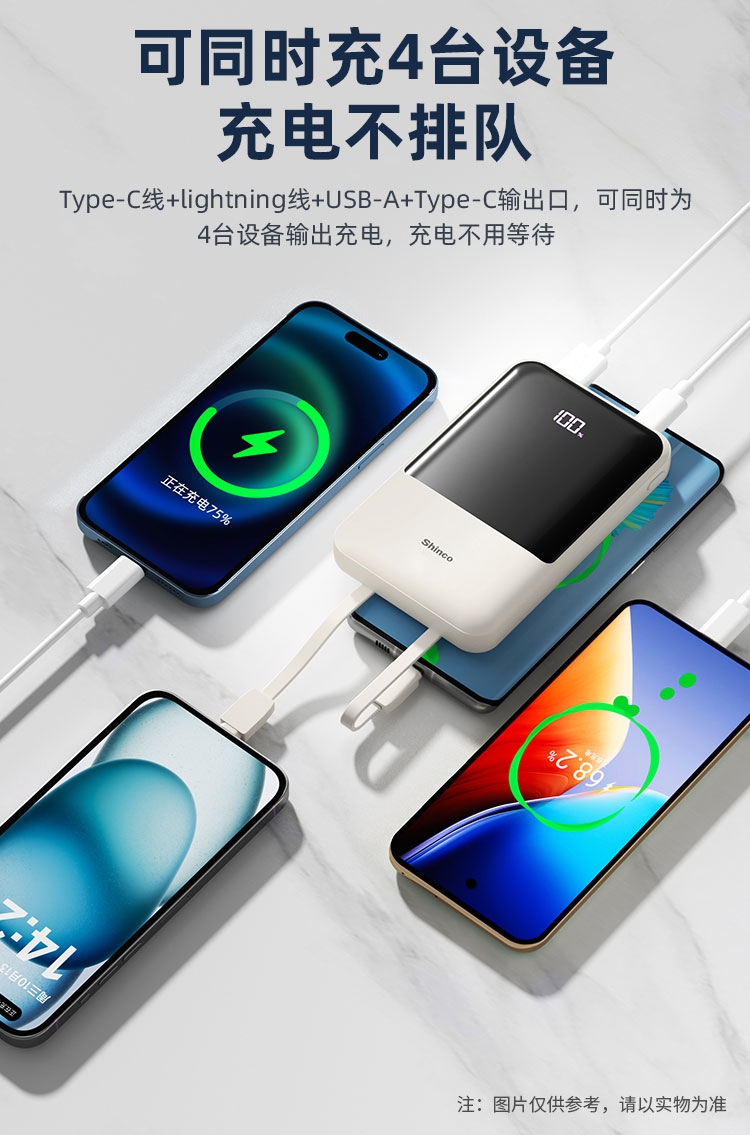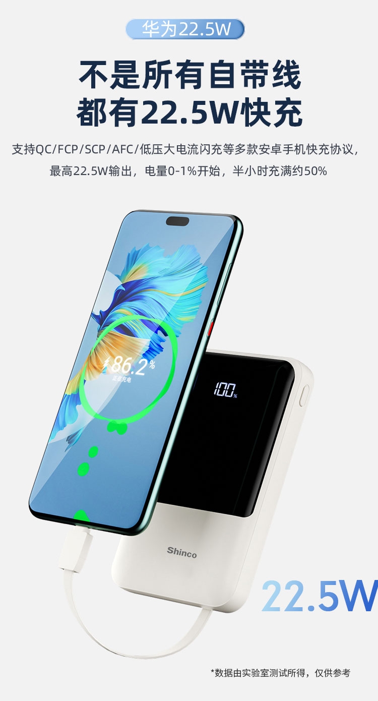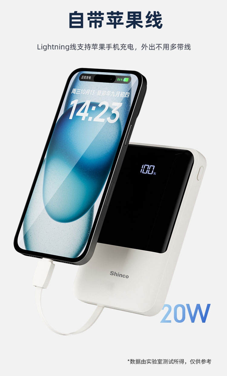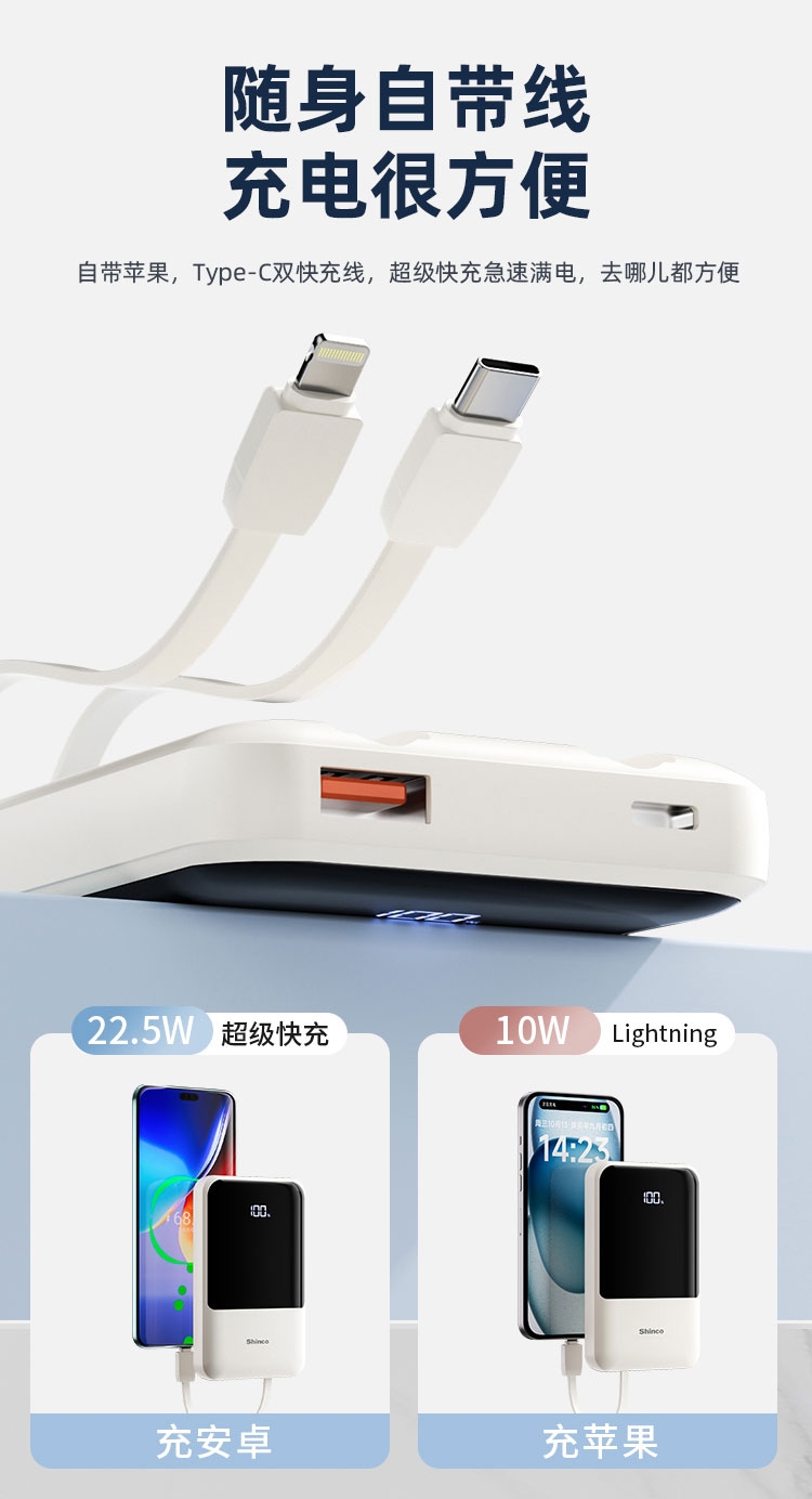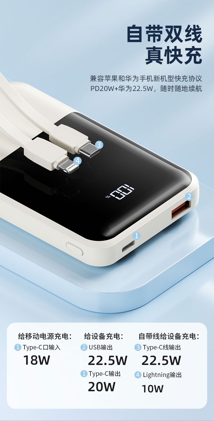 随身自带线、充电很方便,去哪儿都方便;智能数显、电量不盲猜、告别看灯猜电量,出门更安心;输入输出皆快充、随时随地都可充满电