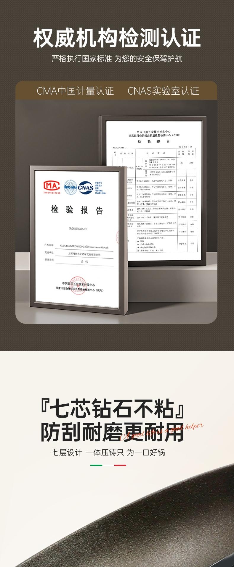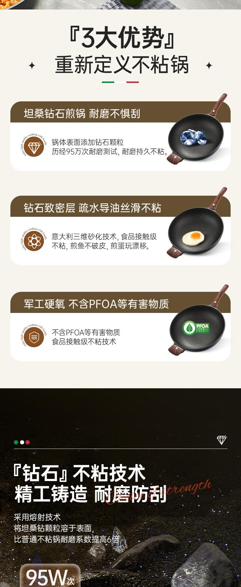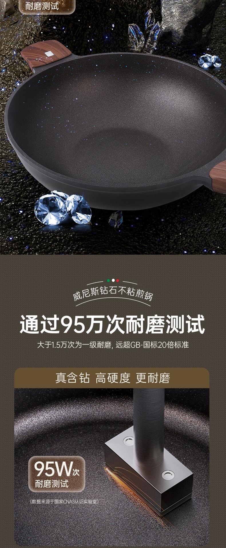 95万次超耐磨不粘;五芯一体仿压铸工艺;一款含钻的不粘锅;军工硬氧强化、耐磨、耐腐蚀、抗酸碱;