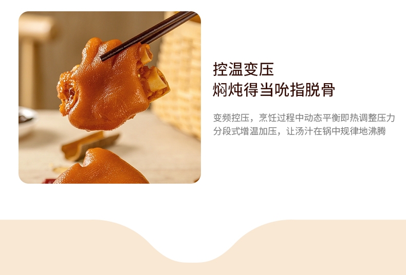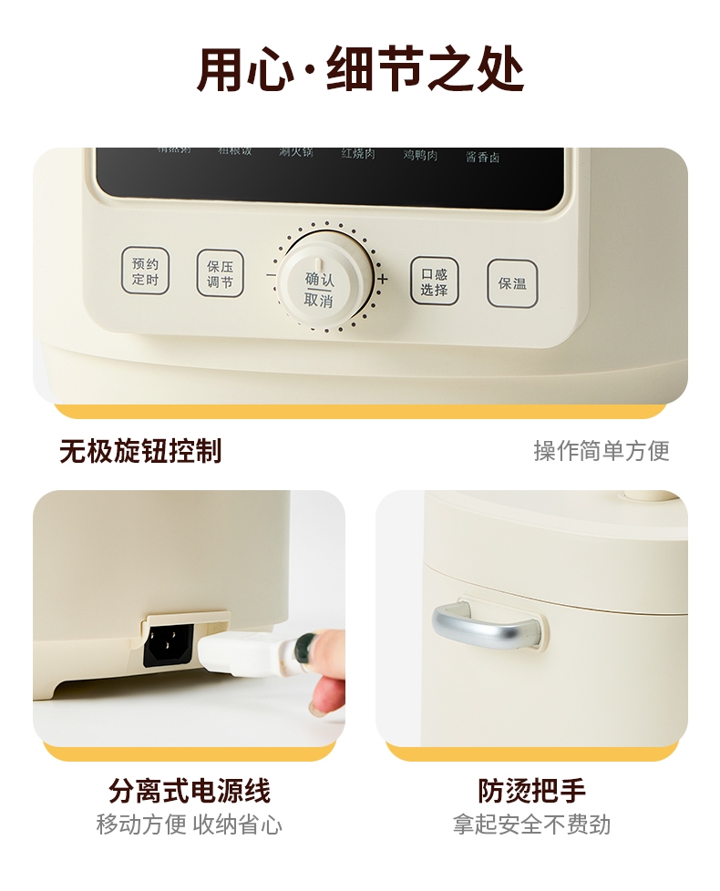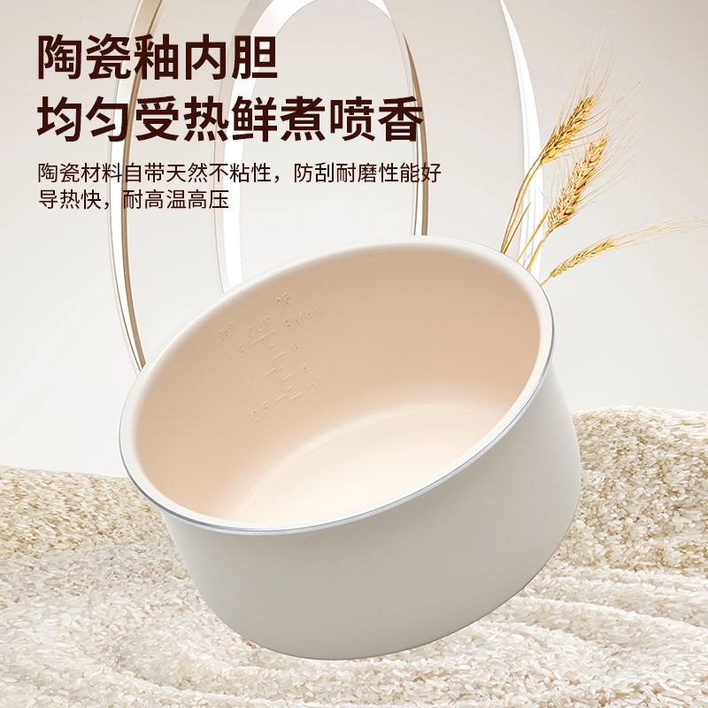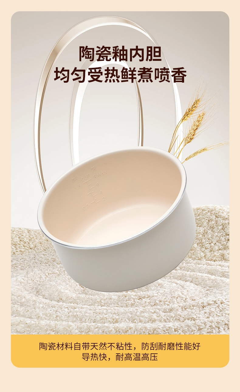 触控+旋钮控制; 70-80Kpa高压快煮;陶瓷釉内胆:陶瓷材料自带天然不粘性,防刮耐磨性能好;超大发热盘1300W大火力;超宽电压100-270