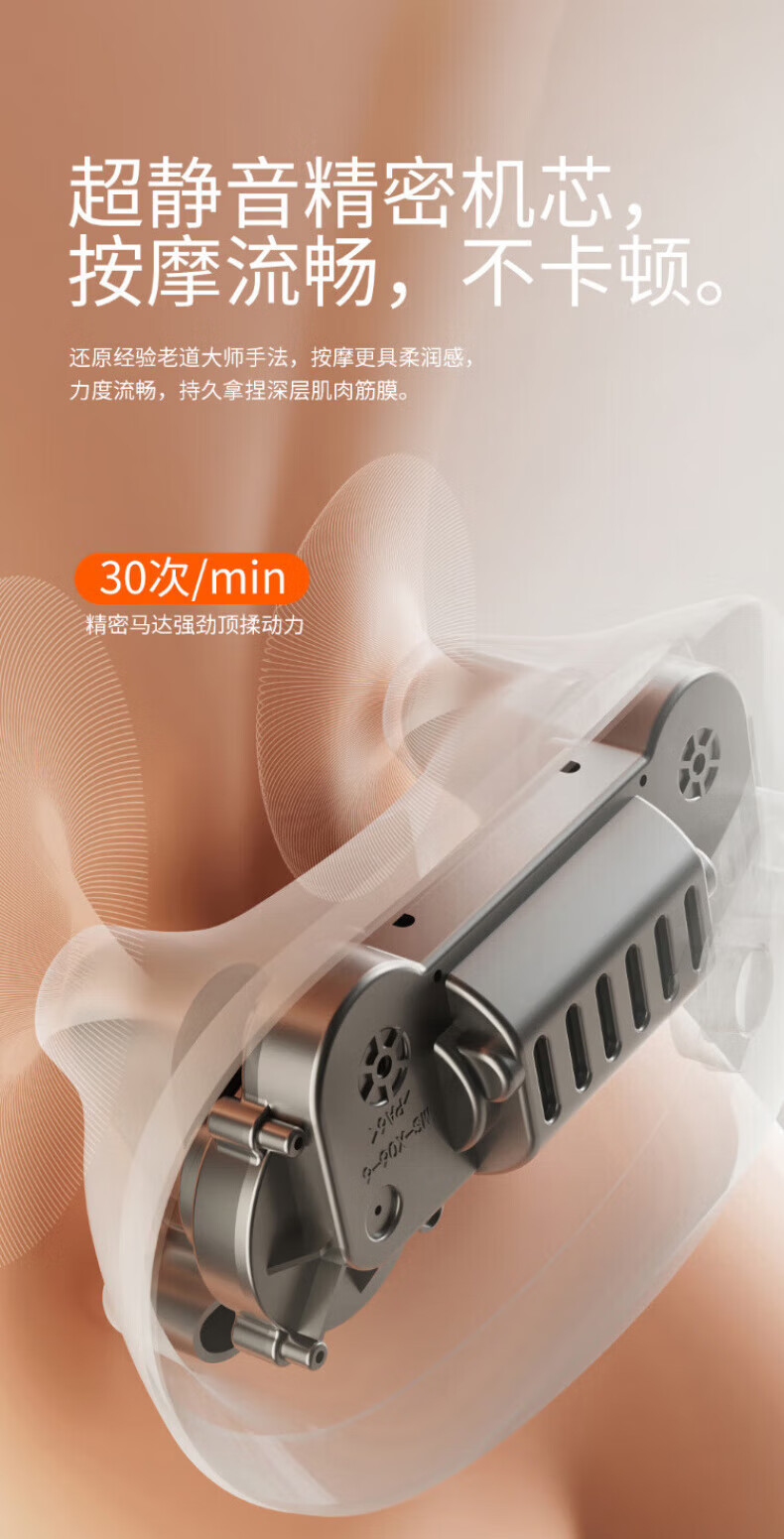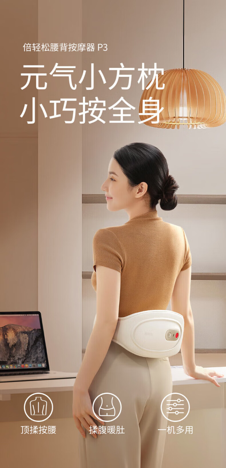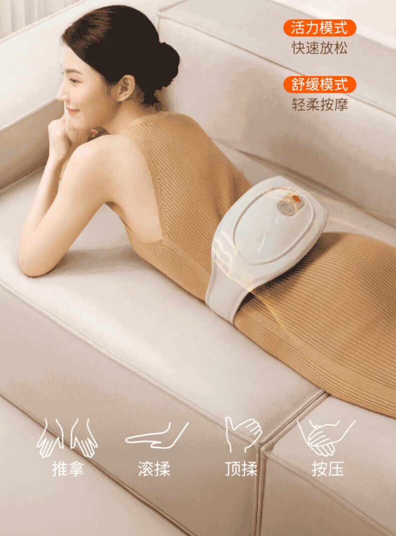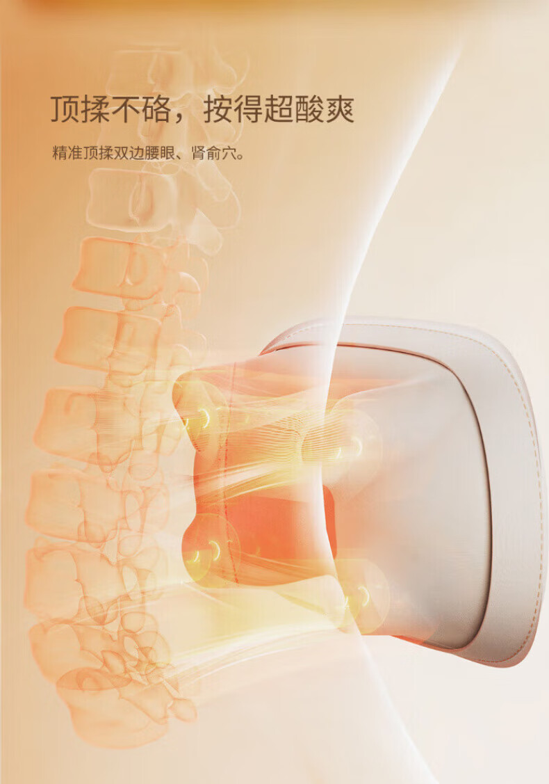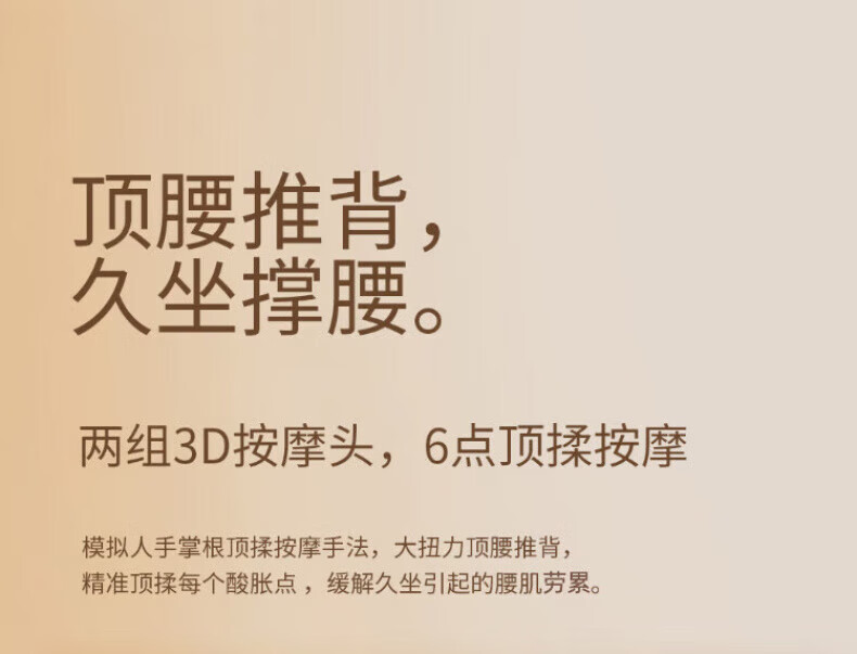 顶腰推背久坐撑腰,两组3D按摩头,6点顶揉按摩;暖肚暖宫。速热恒温,舒适热敷;超静音精密机芯按摩流畅,不卡顿