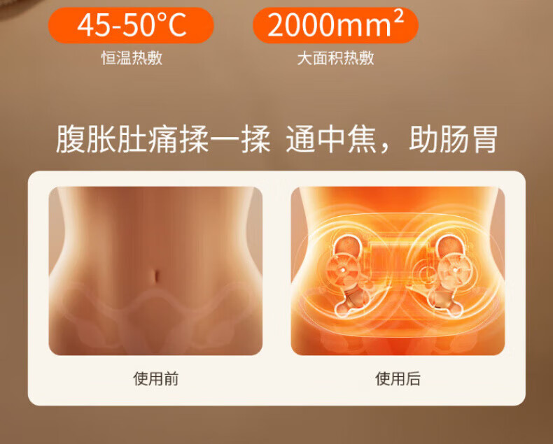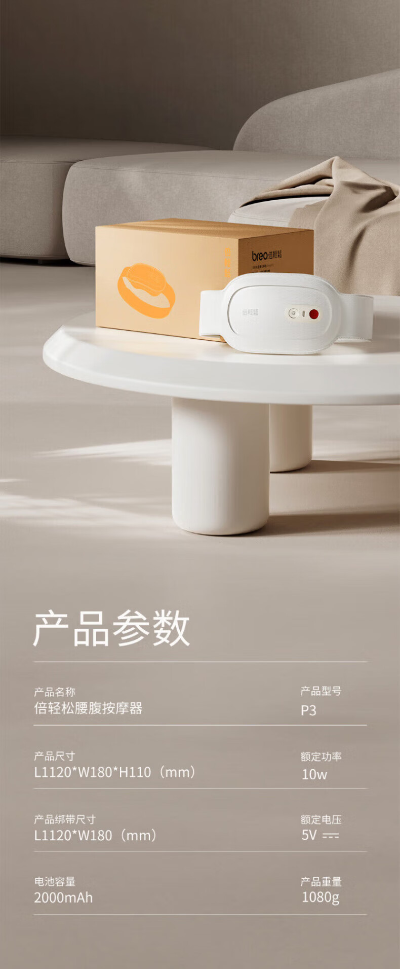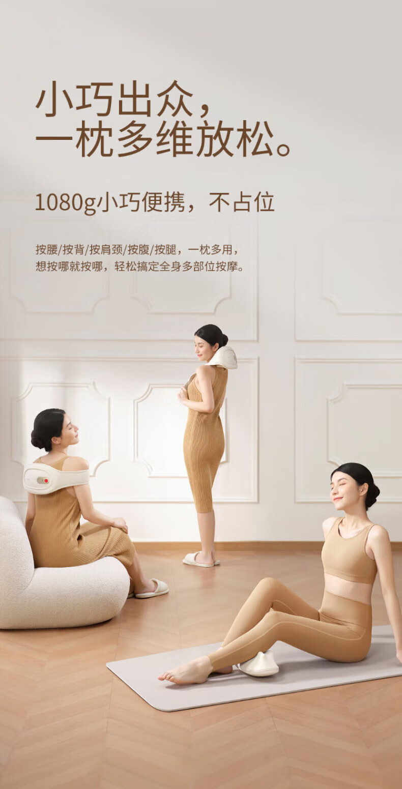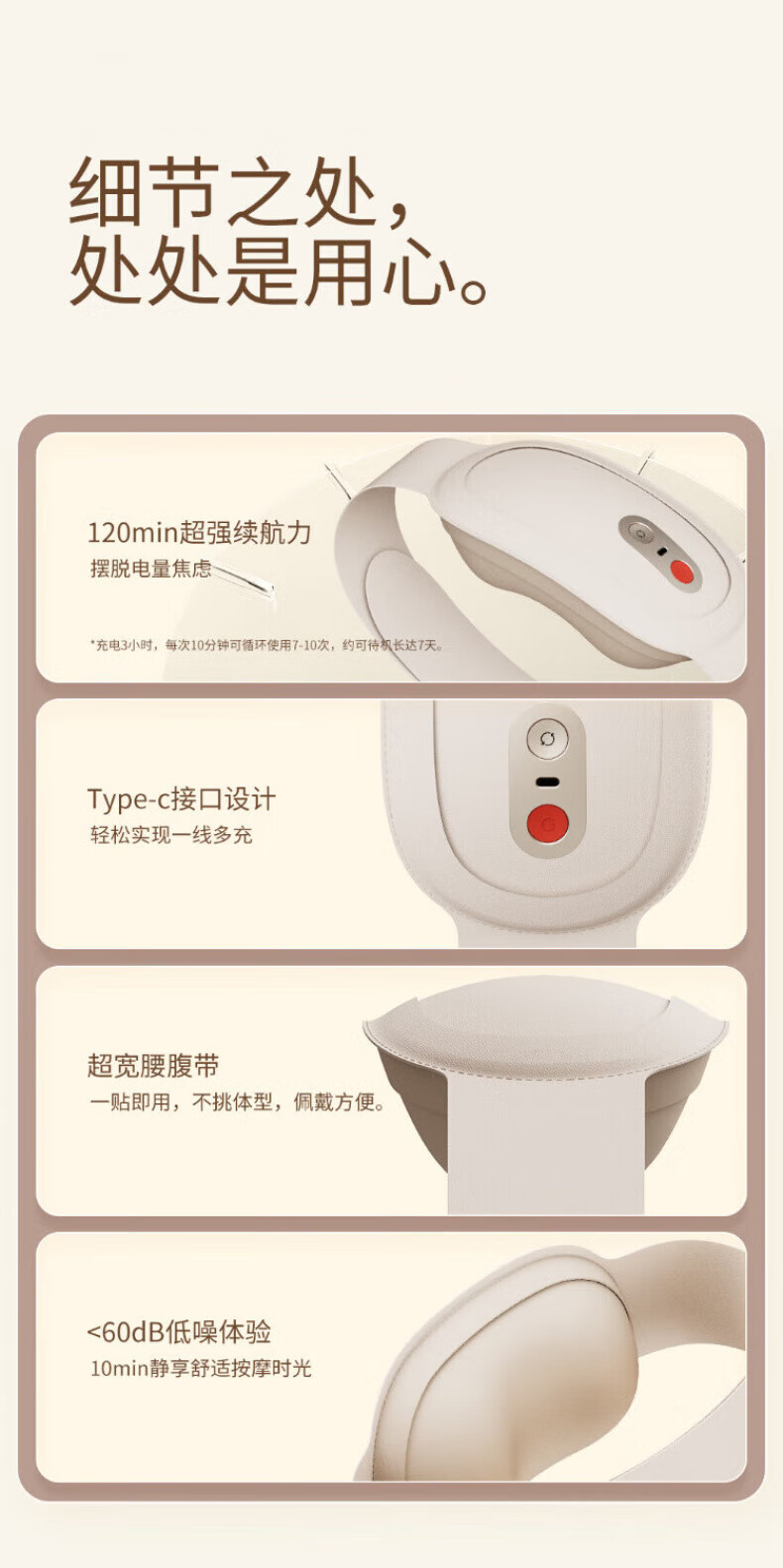 顶腰推背久坐撑腰,两组3D按摩头,6点顶揉按摩;暖肚暖宫。速热恒温,舒适热敷;超静音精密机芯按摩流畅,不卡顿