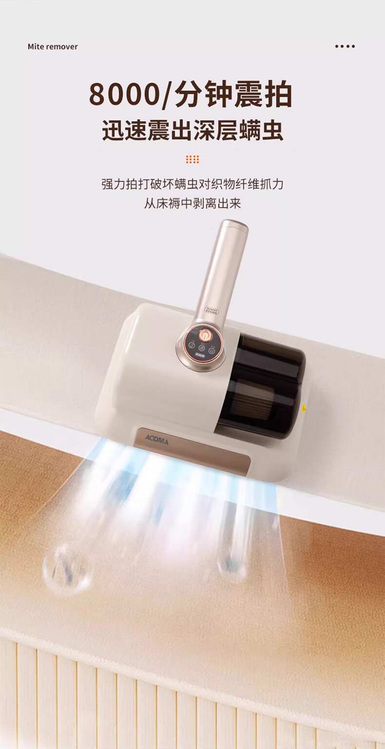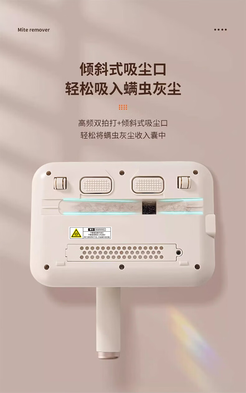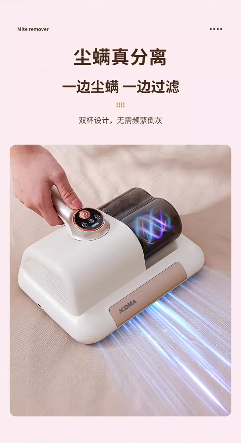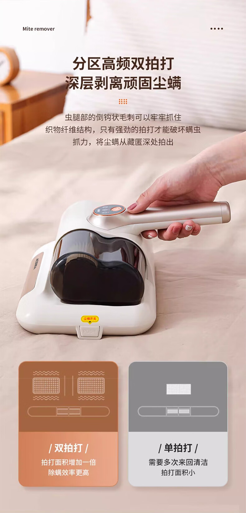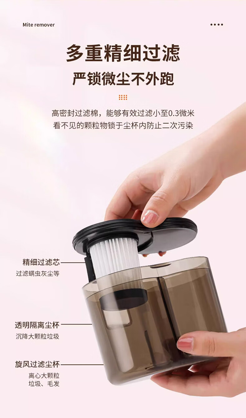 UV紫外线杀菌,纳米级光源照射真实除菌;双杯设计,尘螨真分离,一边尘螨 一边过滤;高频双拍打+倾斜式吸尘口轻松将螨虫灰尘收入囊中