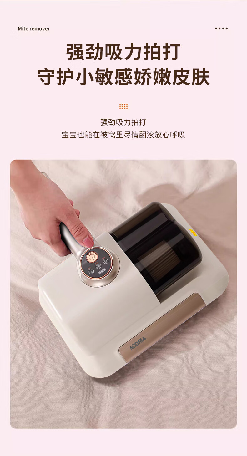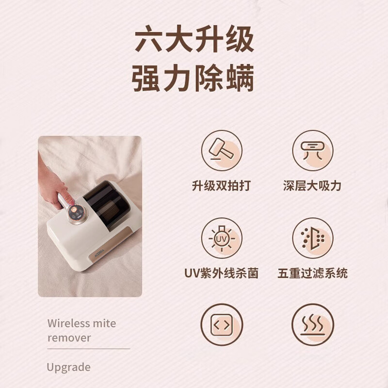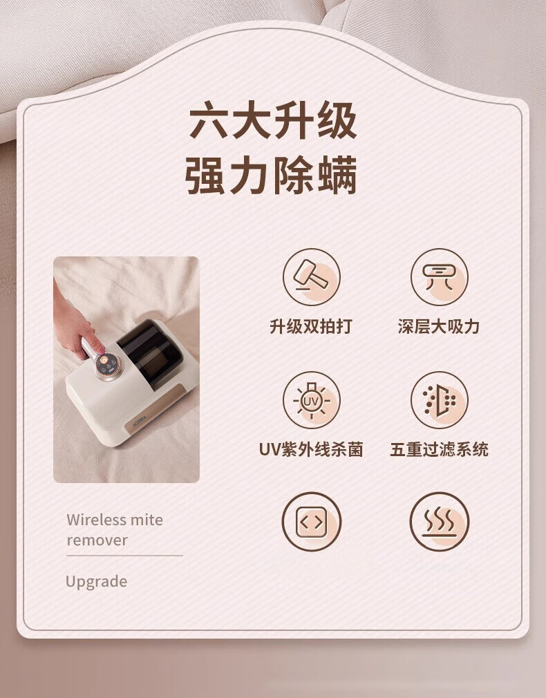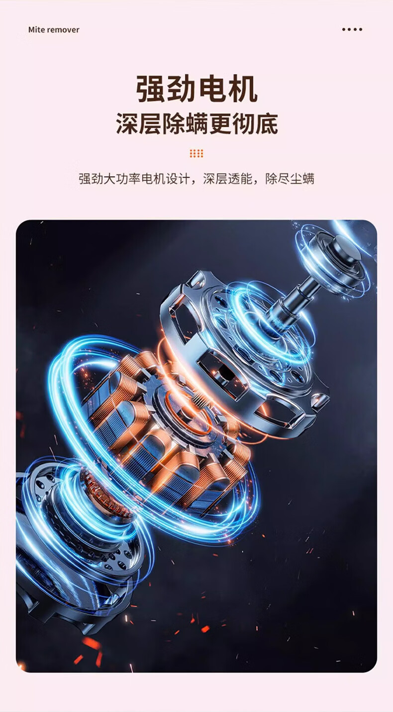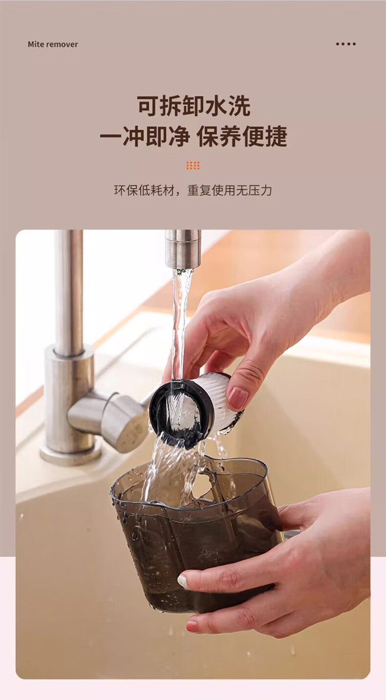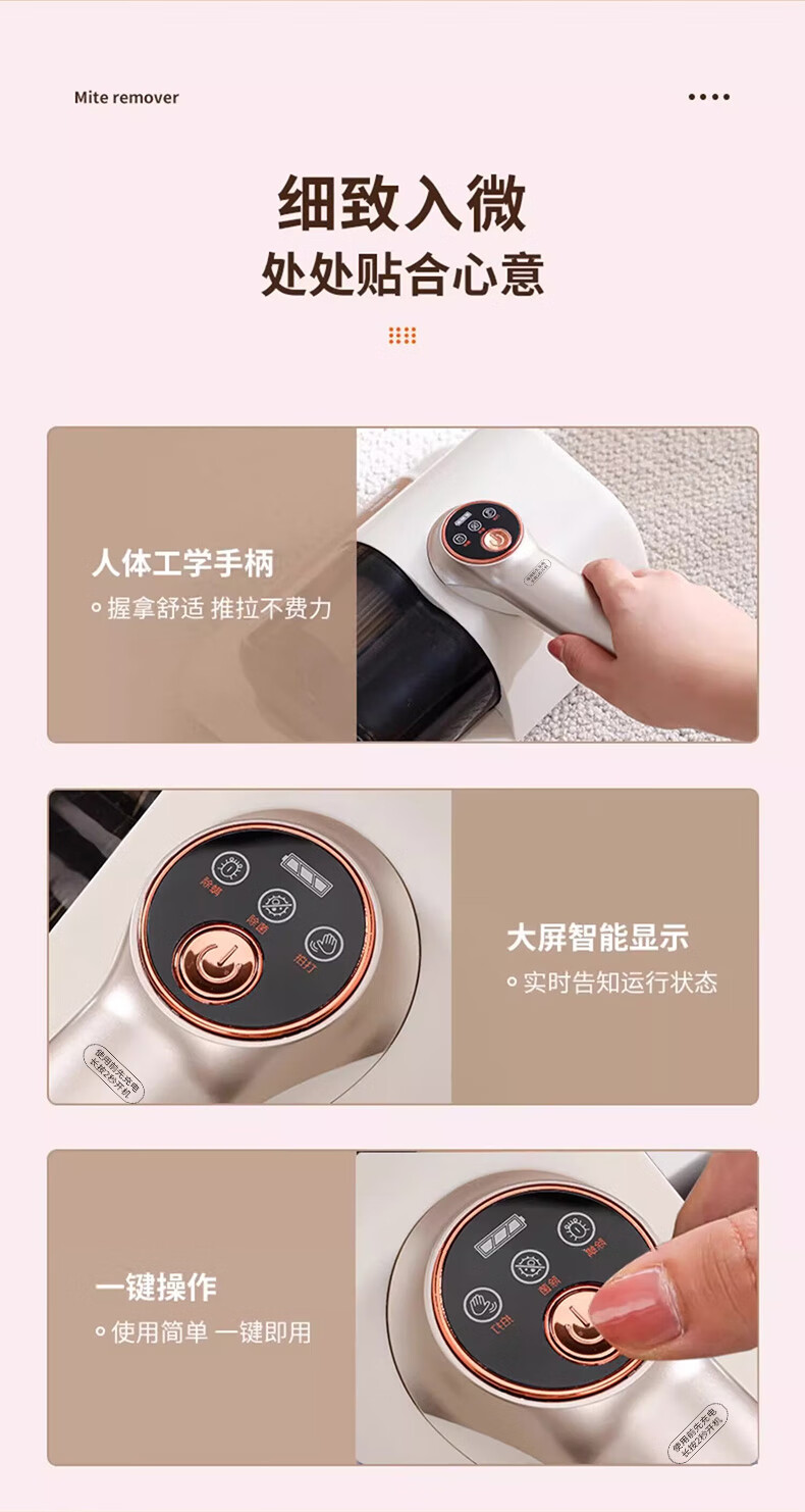 UV紫外线杀菌,纳米级光源照射真实除菌;双杯设计,尘螨真分离,一边尘螨 一边过滤;高频双拍打+倾斜式吸尘口轻松将螨虫灰尘收入囊中