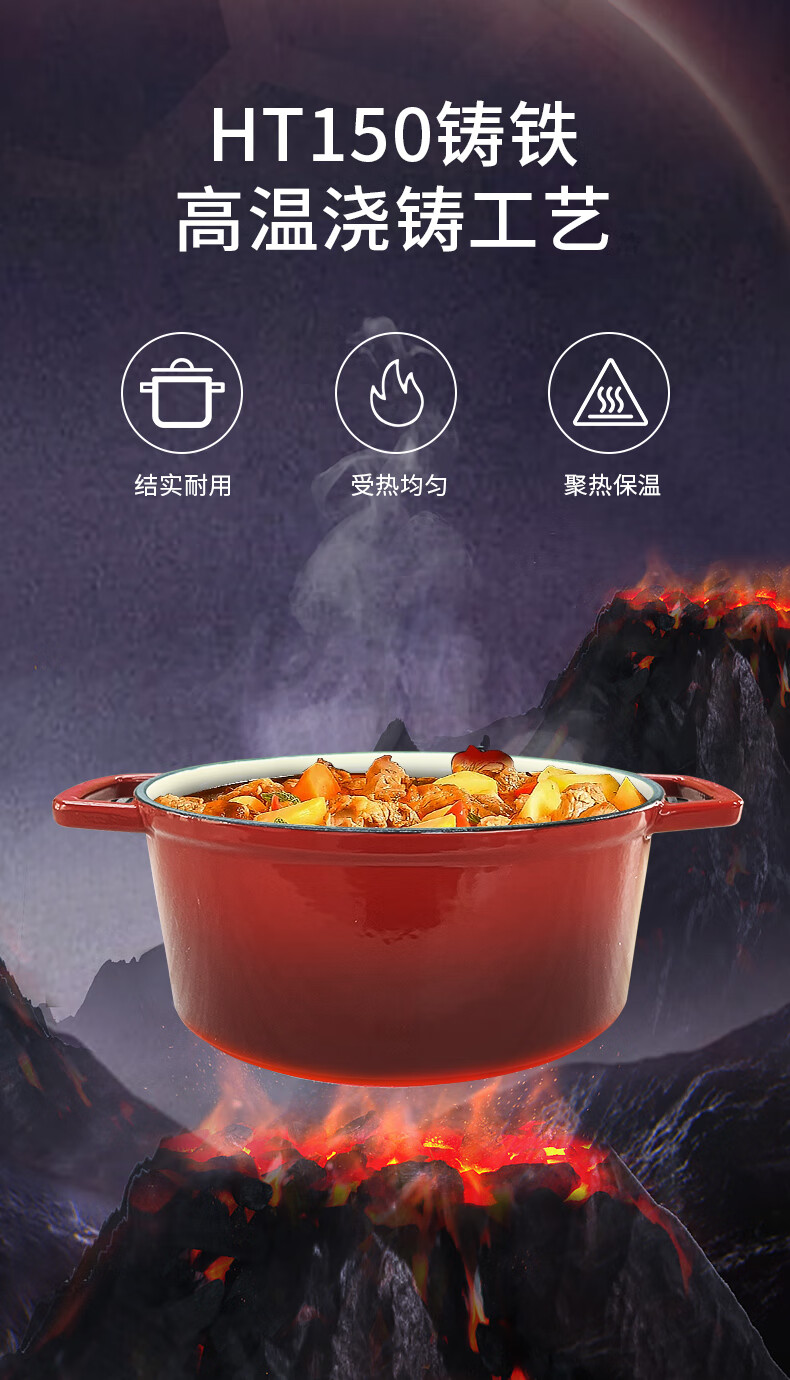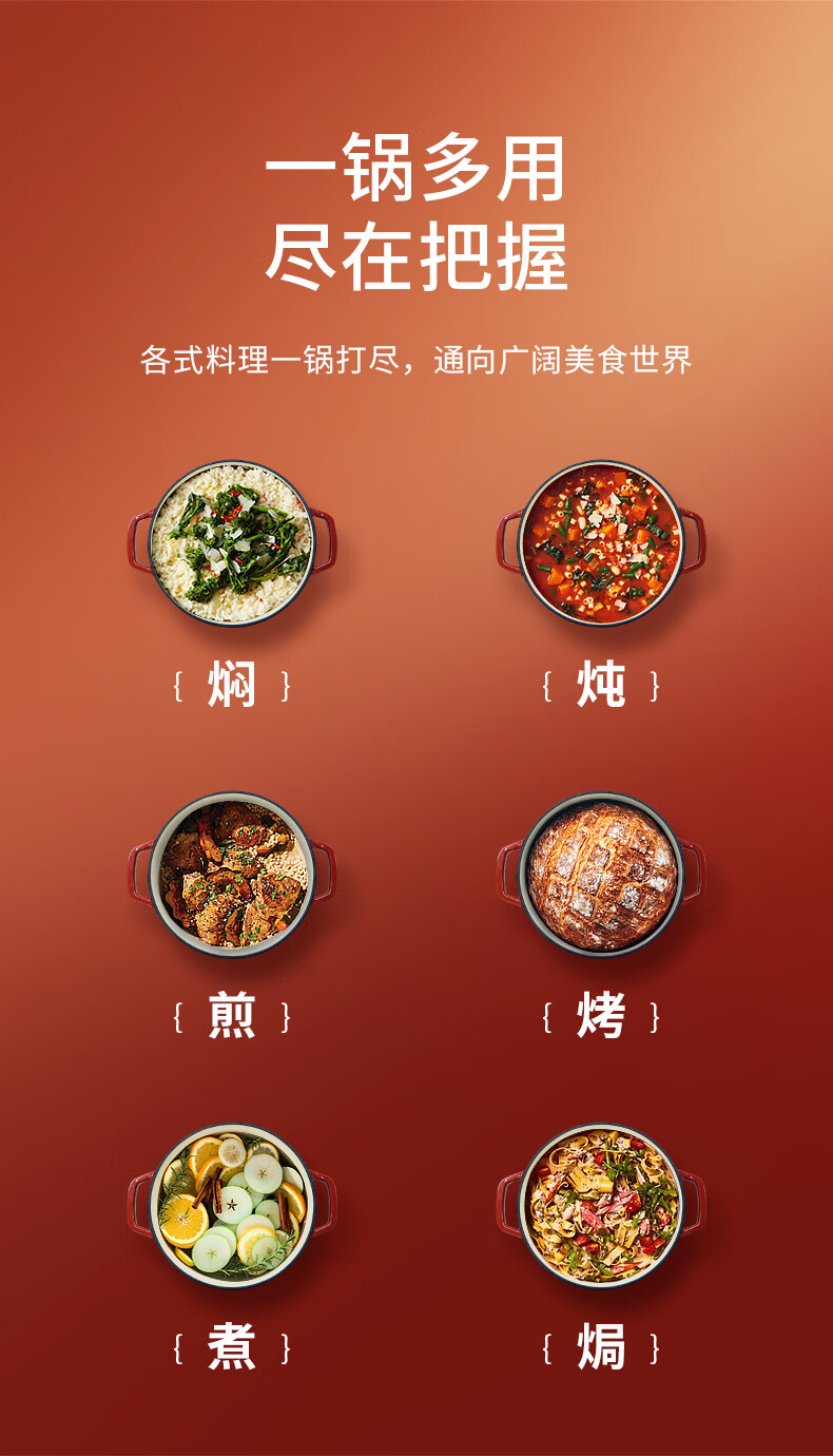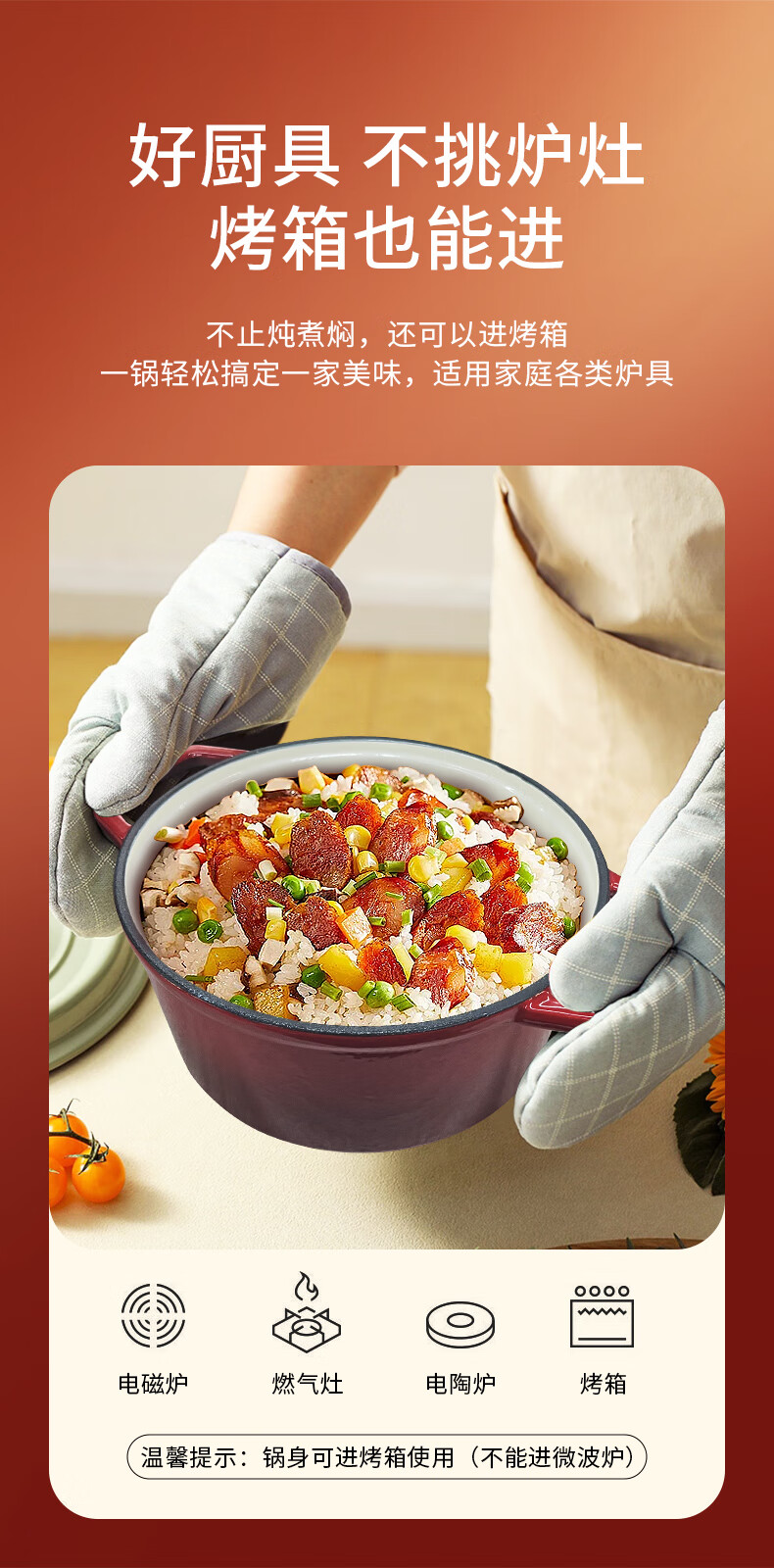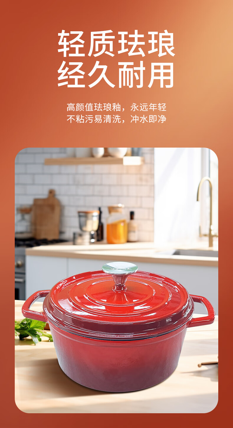 进口珐琅釉,渐变色设计,超高颜值,不沾污易清洗;燃气灶、电磁炉、电丝炉、电陶炉、烤箱等多种炉灶通用;导热快保温能力强,加热后表面会捕获热量 更保温
