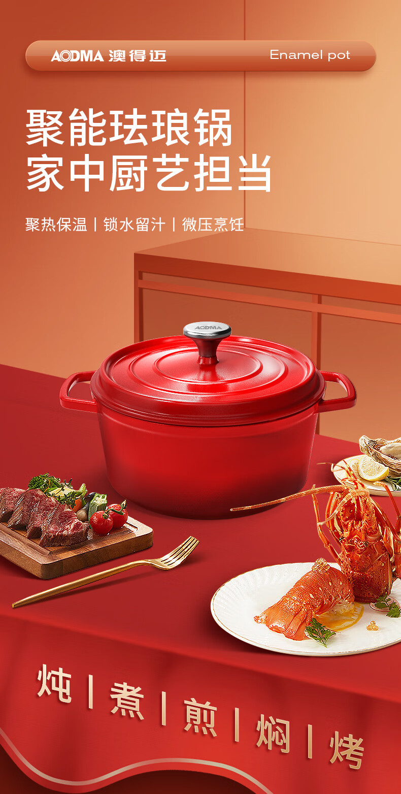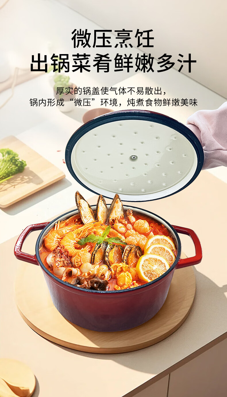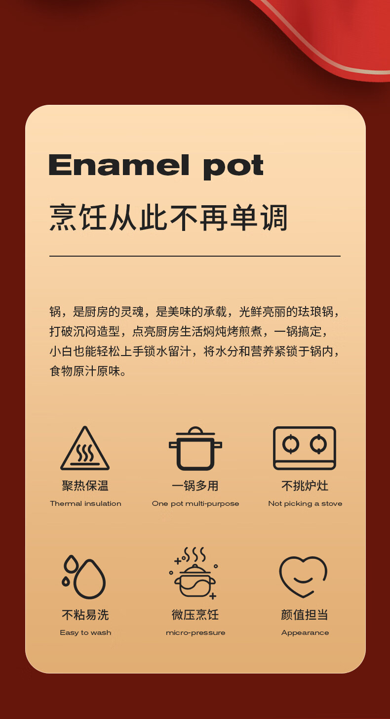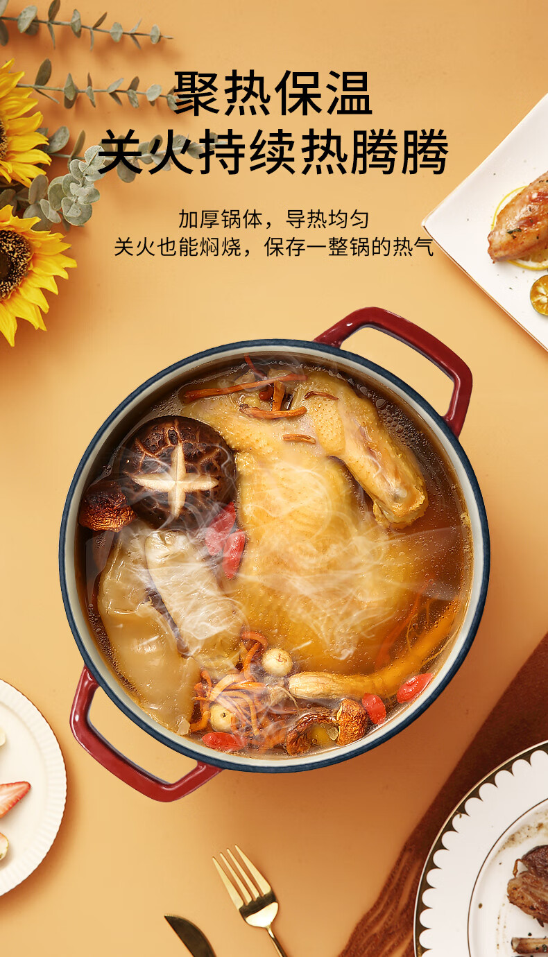 进口珐琅釉,渐变色设计,超高颜值,不沾污易清洗;燃气灶、电磁炉、电丝炉、电陶炉、烤箱等多种炉灶通用;导热快保温能力强,加热后表面会捕获热量 更保温