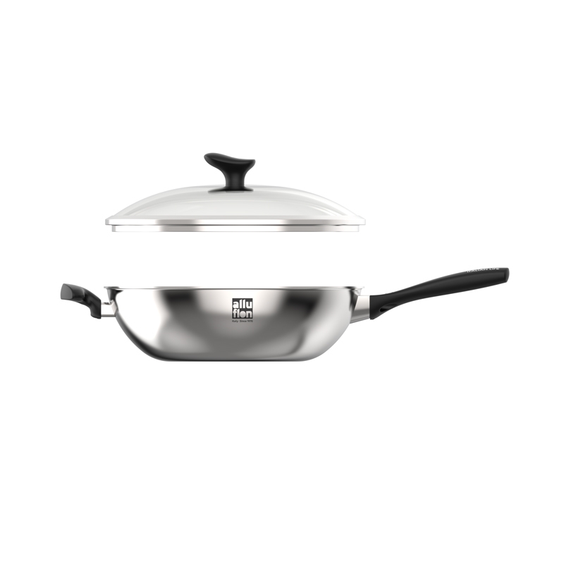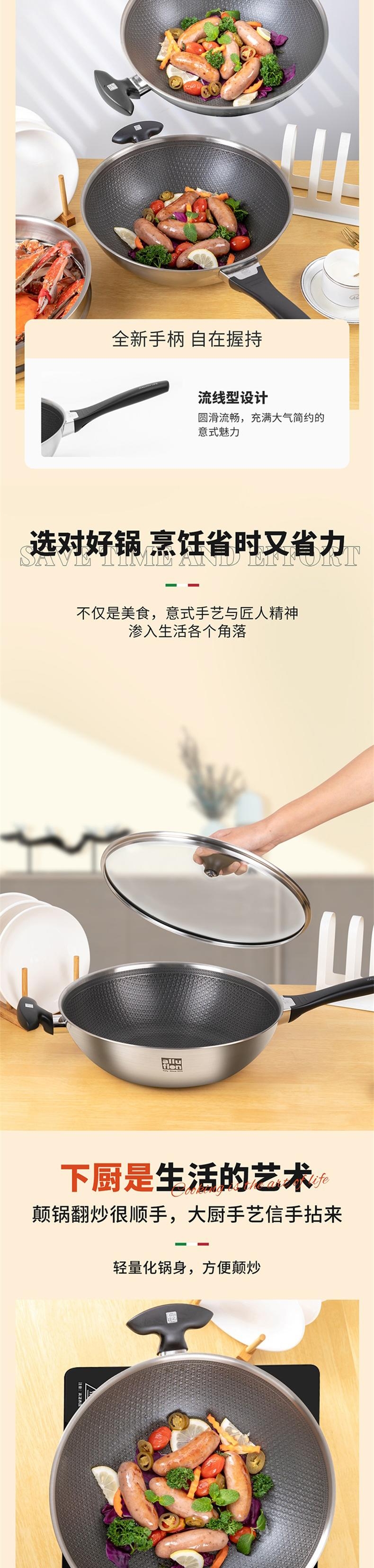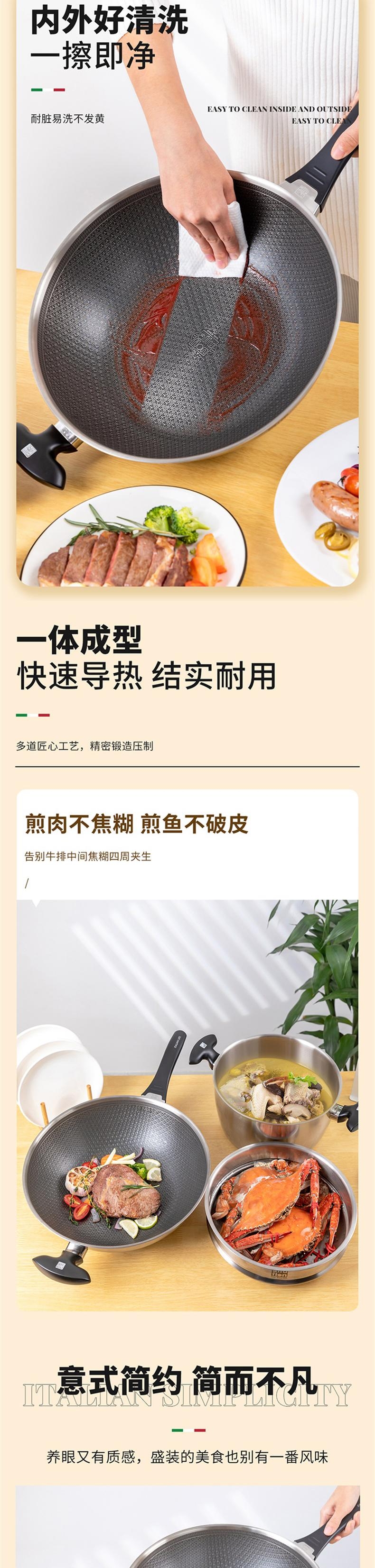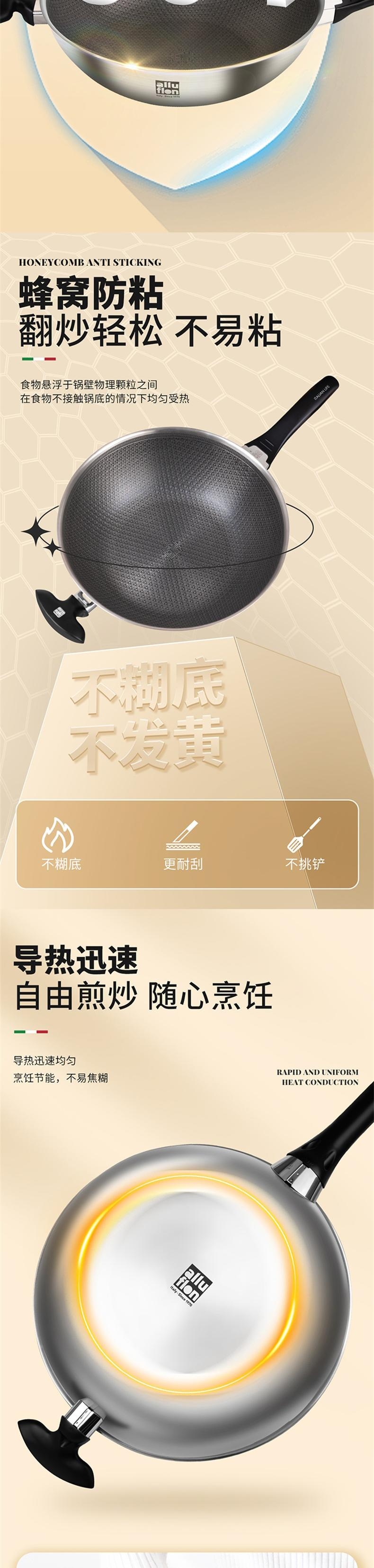 三层钢材质,健康耐久;全屏晶纹、超强耐用;蜂窝耐热防粘、轻油少烟;锅内无铆钉,拒绝藏污纳垢